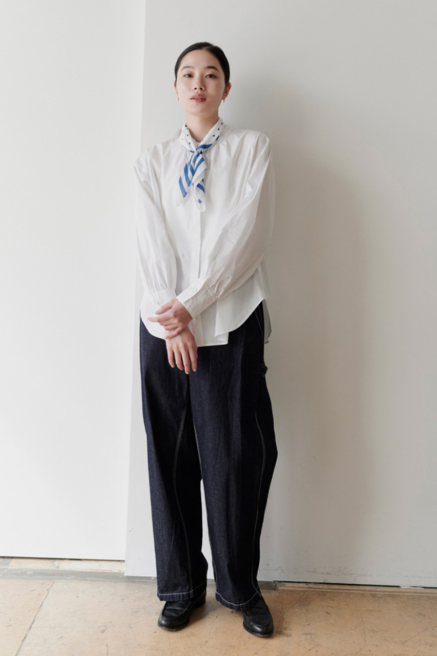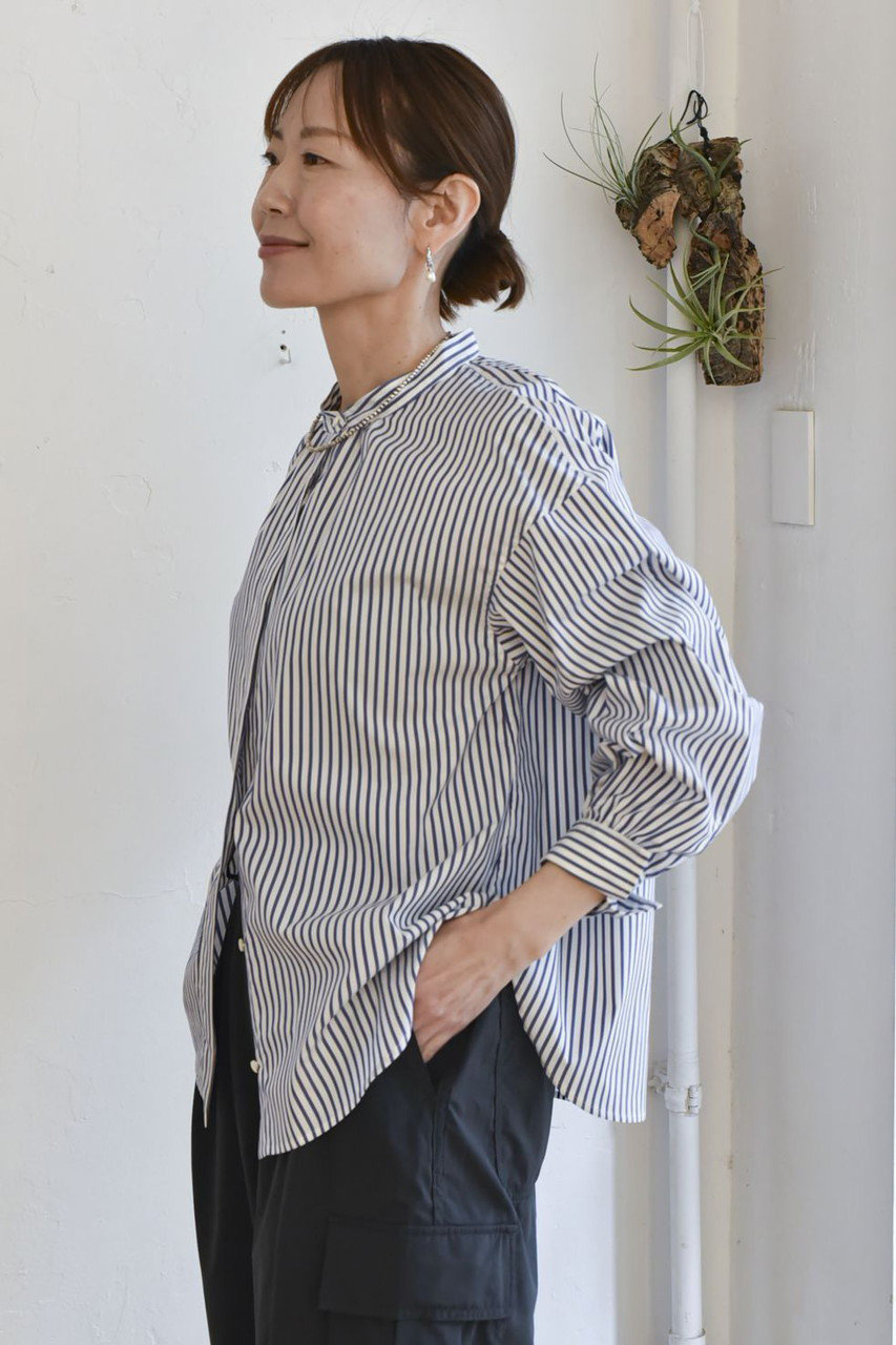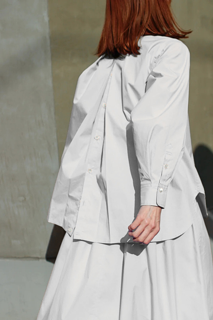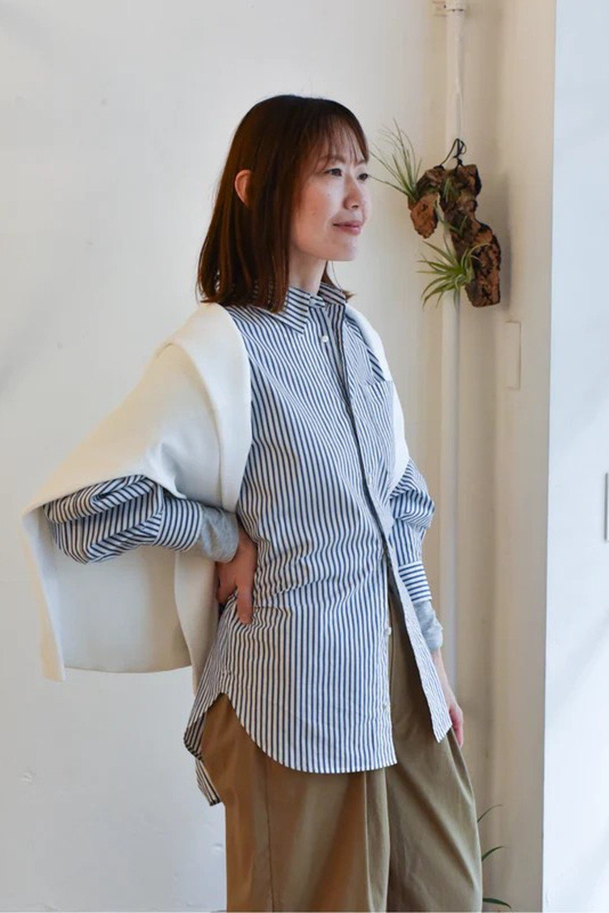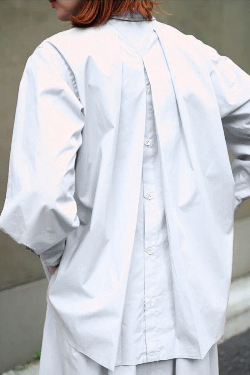 1番人気のバックオープンシャツはオフホワイトも登場。背中にあしらった特徴的な三角のトラスヨークは、贅沢なバックタックをすっきりと美しく収める細工が。すっきりとした見え感が叶いつつも、生地をたっぷりと贅沢に使ったバックタックで綺麗なAラインが生みだし女性らしさを演出します。パンツでもスカートでもバランス良く着こなせる優秀な1枚。今回はショールカラーで顔周りも柔らかい印象に。