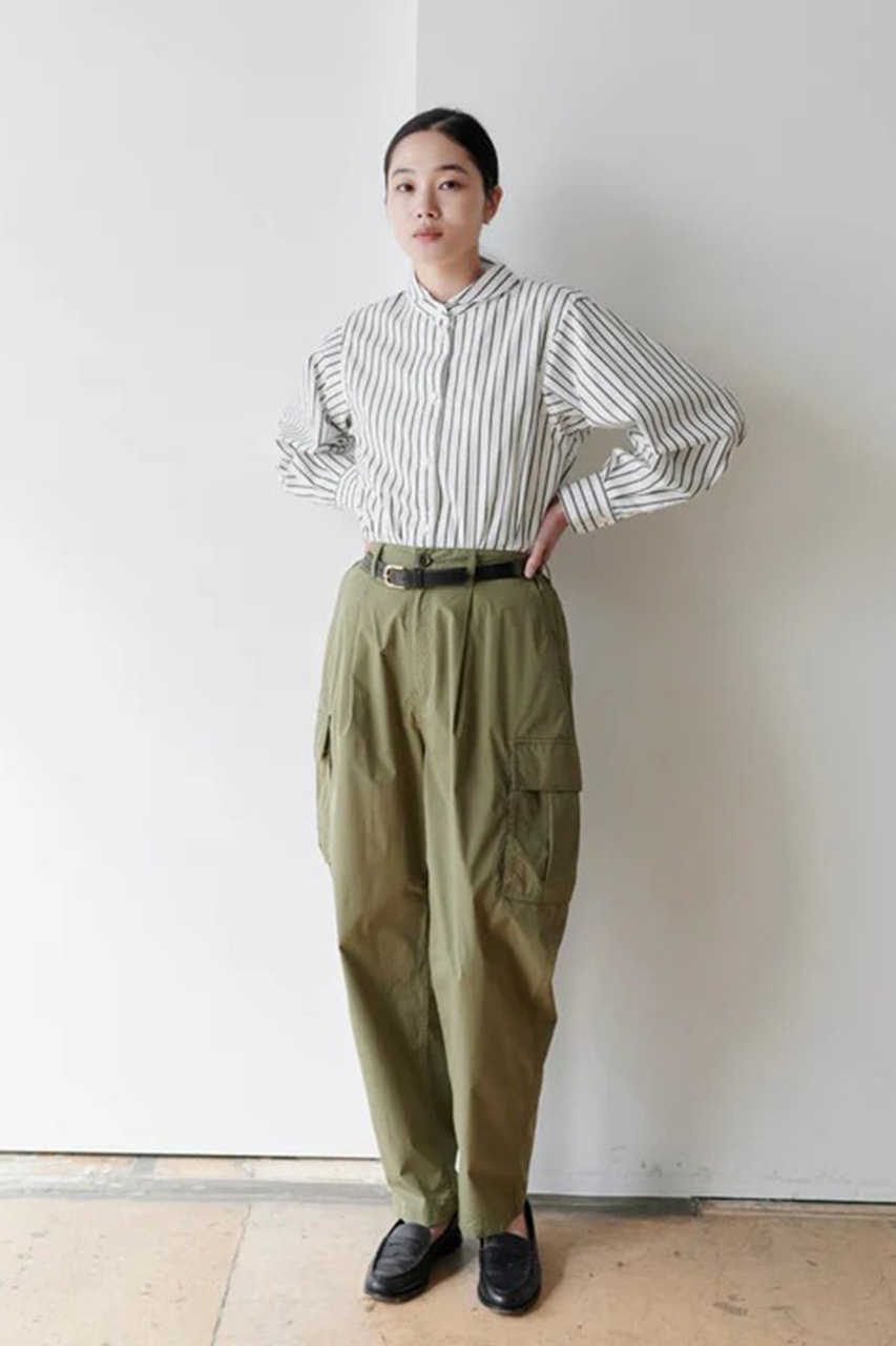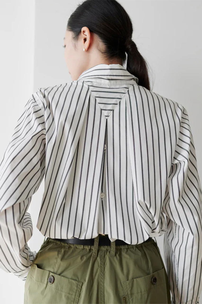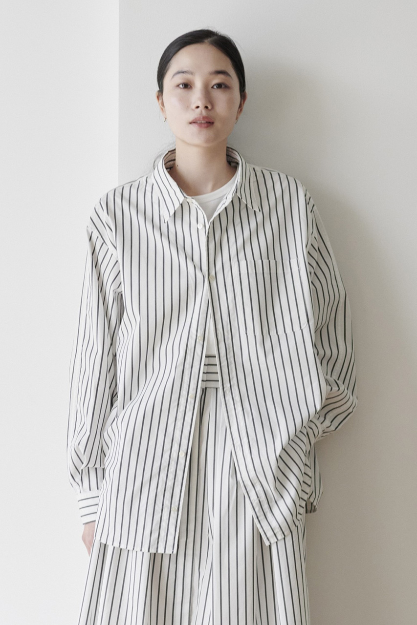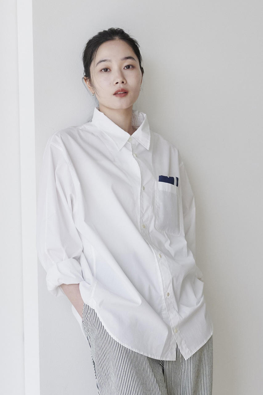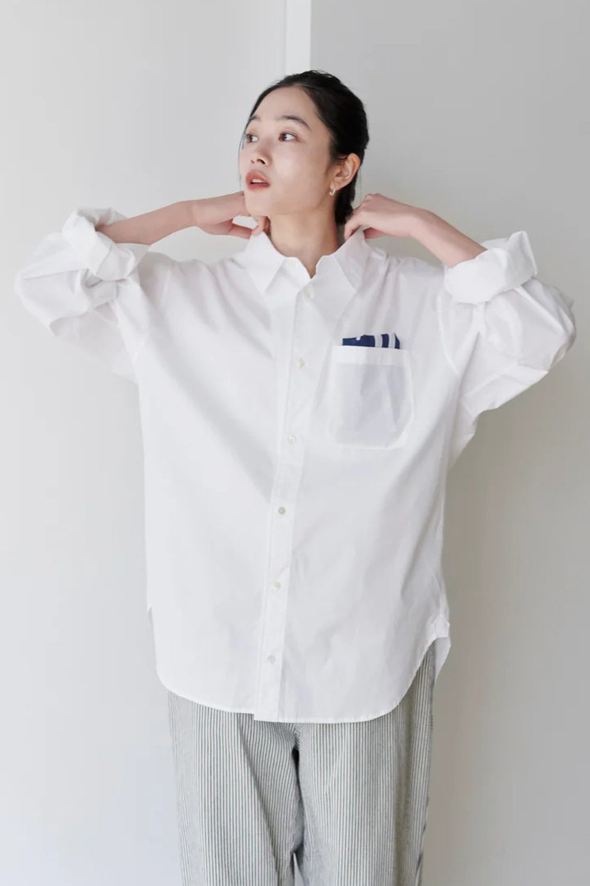 1番人気のバックオープンシャツはオフホワイトも登場。背中にあしらった特徴的な三角のトラスヨークは、贅沢なバックタックをすっきりと美しく収める細工が。すっきりとした見え感が叶いつつも、生地をたっぷりと贅沢に使ったバックタックで綺麗なAラインが生みだし女性らしさを演出します。パンツでもスカートでもバランス良く着こなせる優秀な1枚。今回はショールカラーで顔周りも柔らかい印象に。