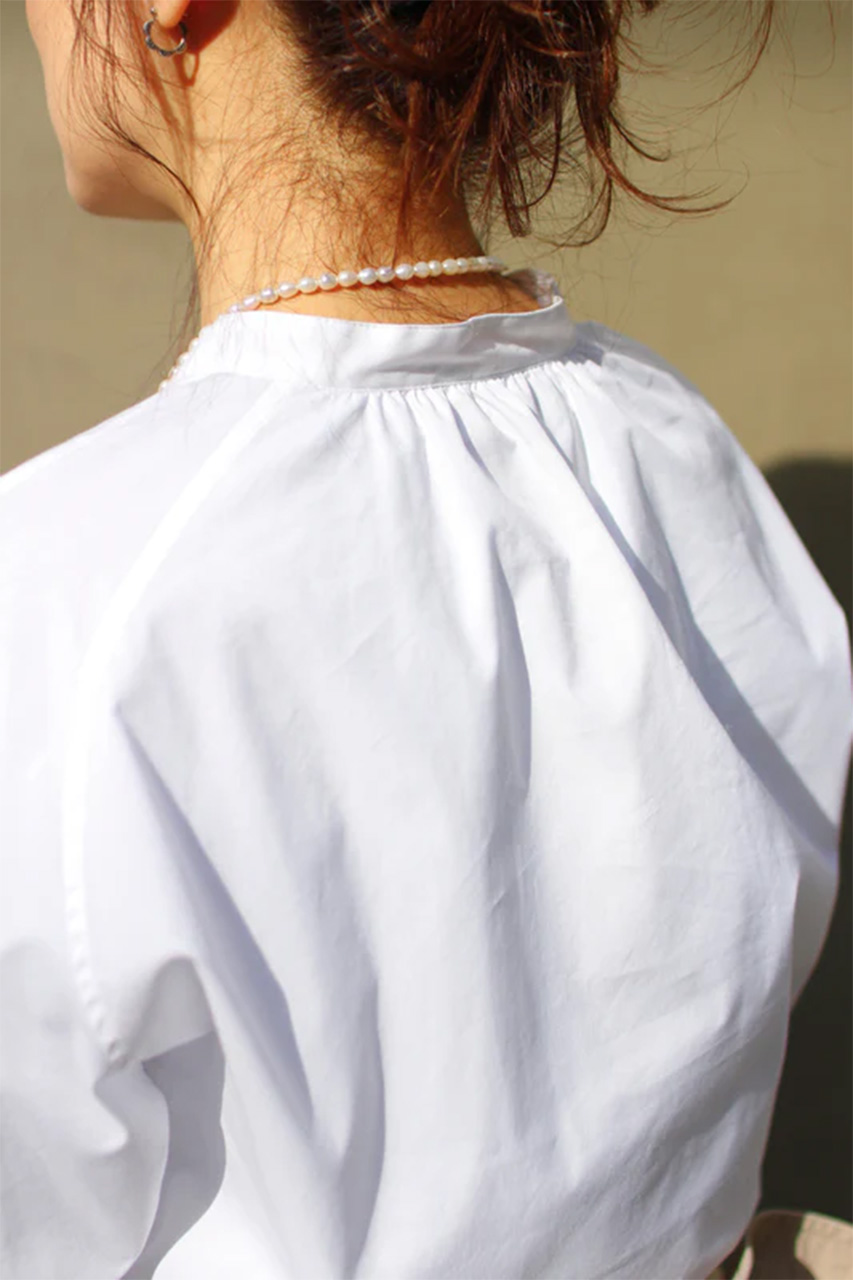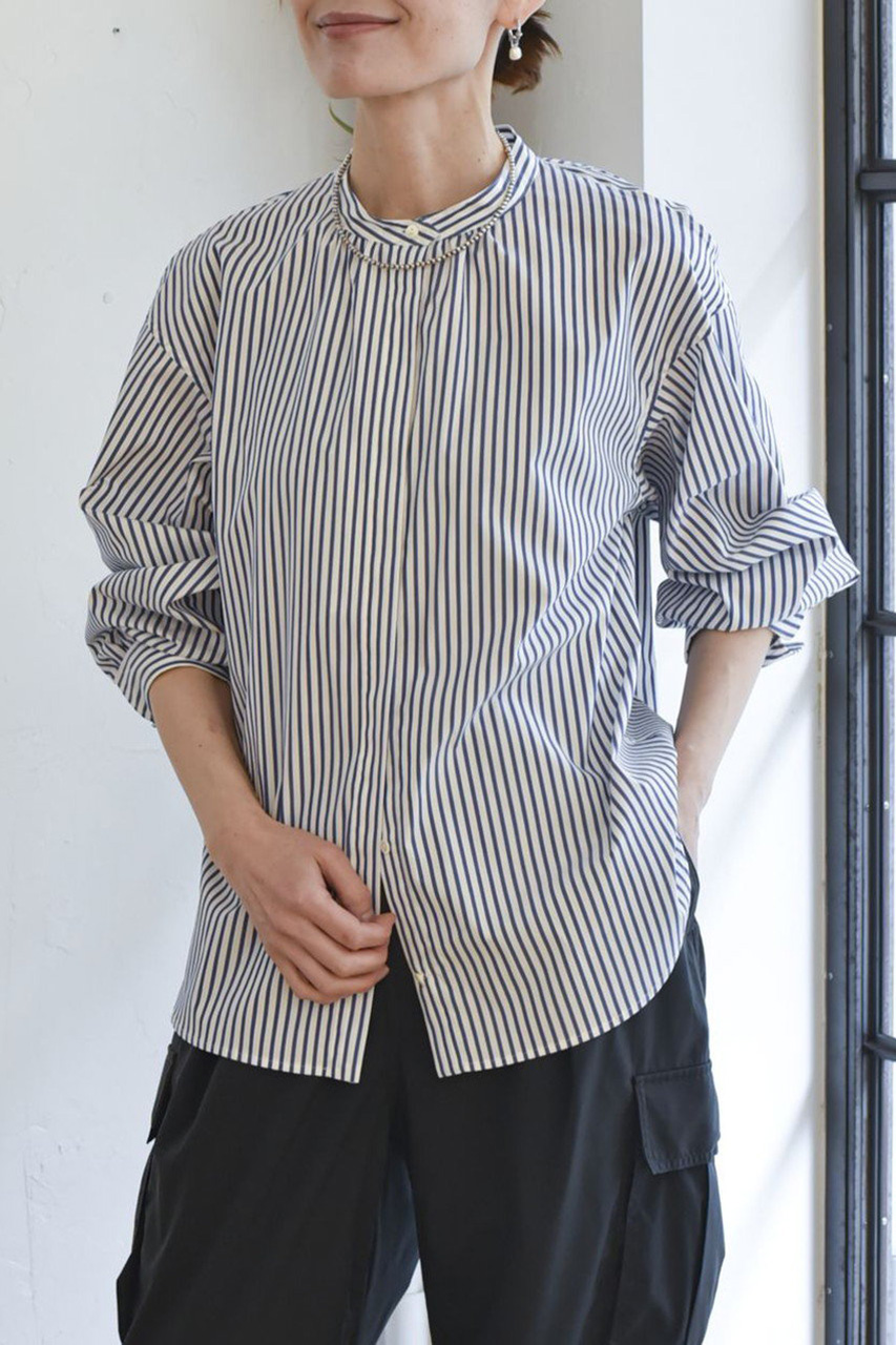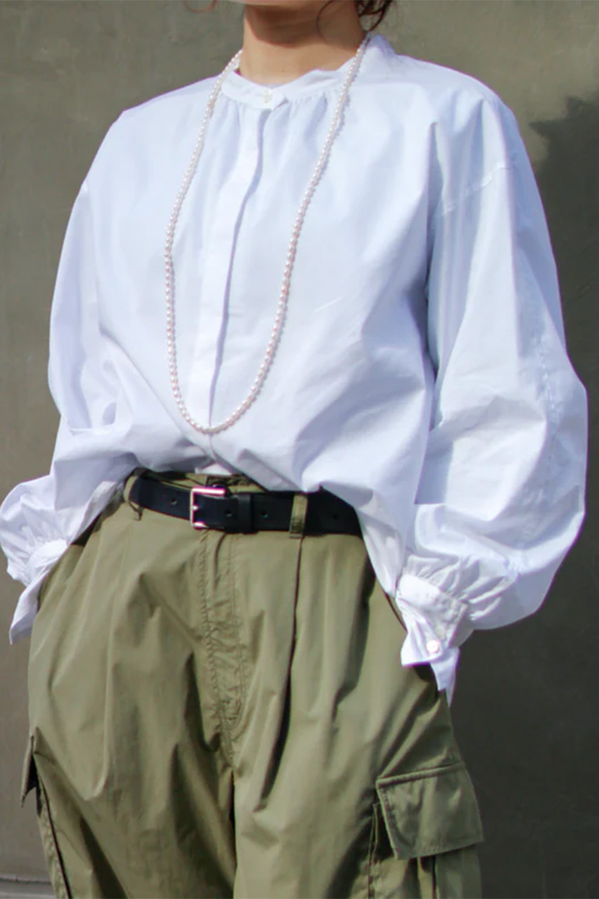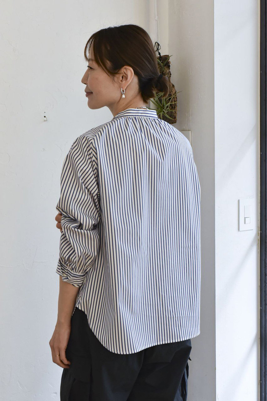 前後の首元にギャザーを効かせた女性らしいブラウス。リバースフライ仕様で前ボタンも見えず綺麗めな印象です。