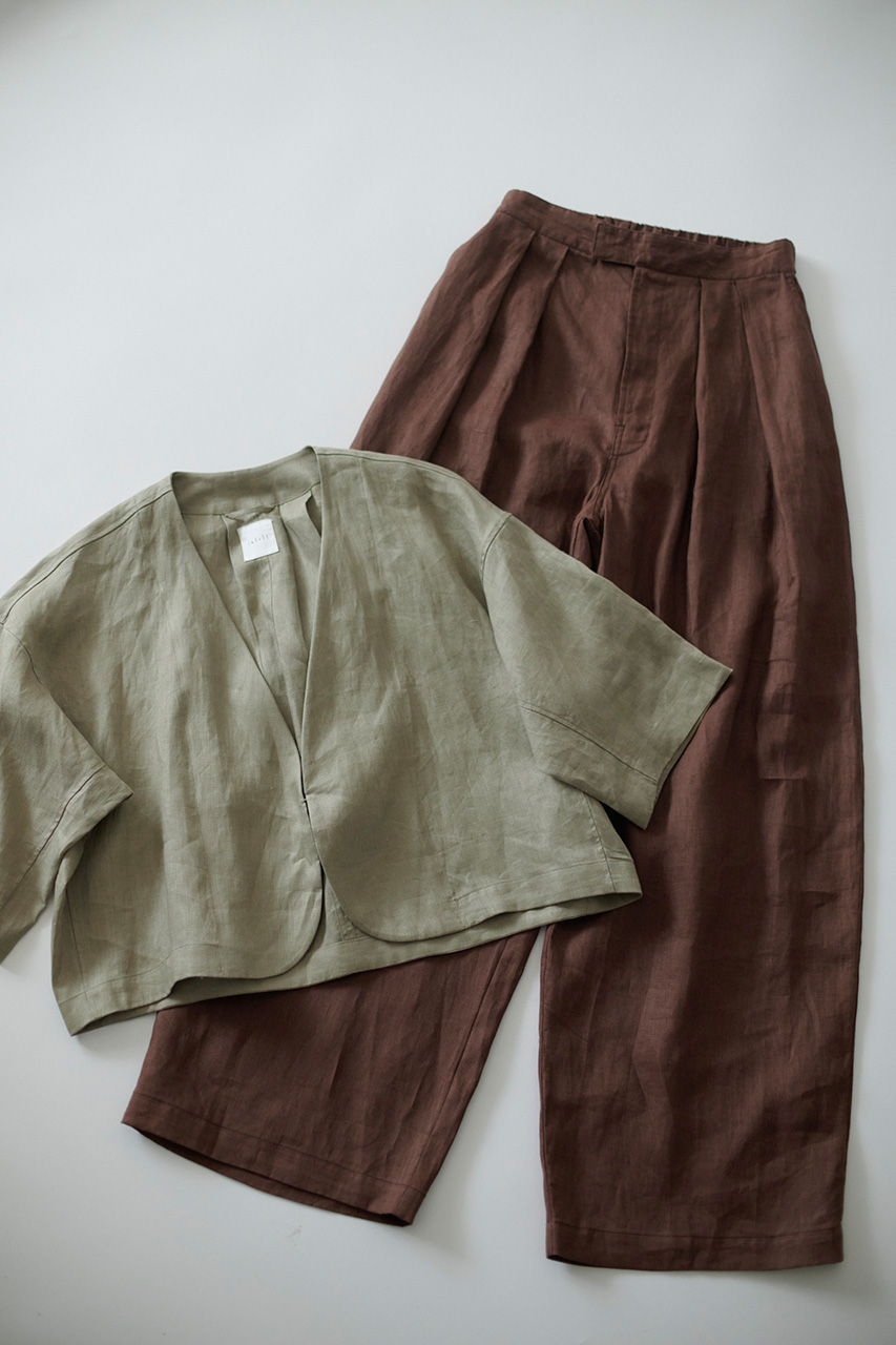 軽やかで上質なリネン素材。ご自宅でおしゃれ着洗いも可能なので、日常で着やすく夏に向けて重宝します。上品できちんと感もでるので、コーディネートに取り入れるだけで一気に夏のムードを高めてくれる。今回はリネン素材を使って、ボレロ、ワイドパンツ、ワンピースの3型をご用意しました。(ワンピースは7月発売予定)