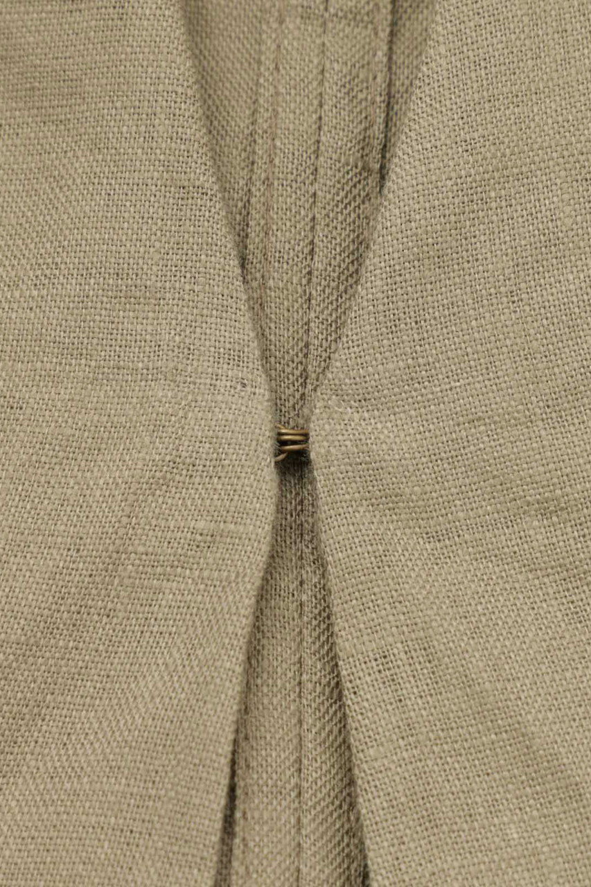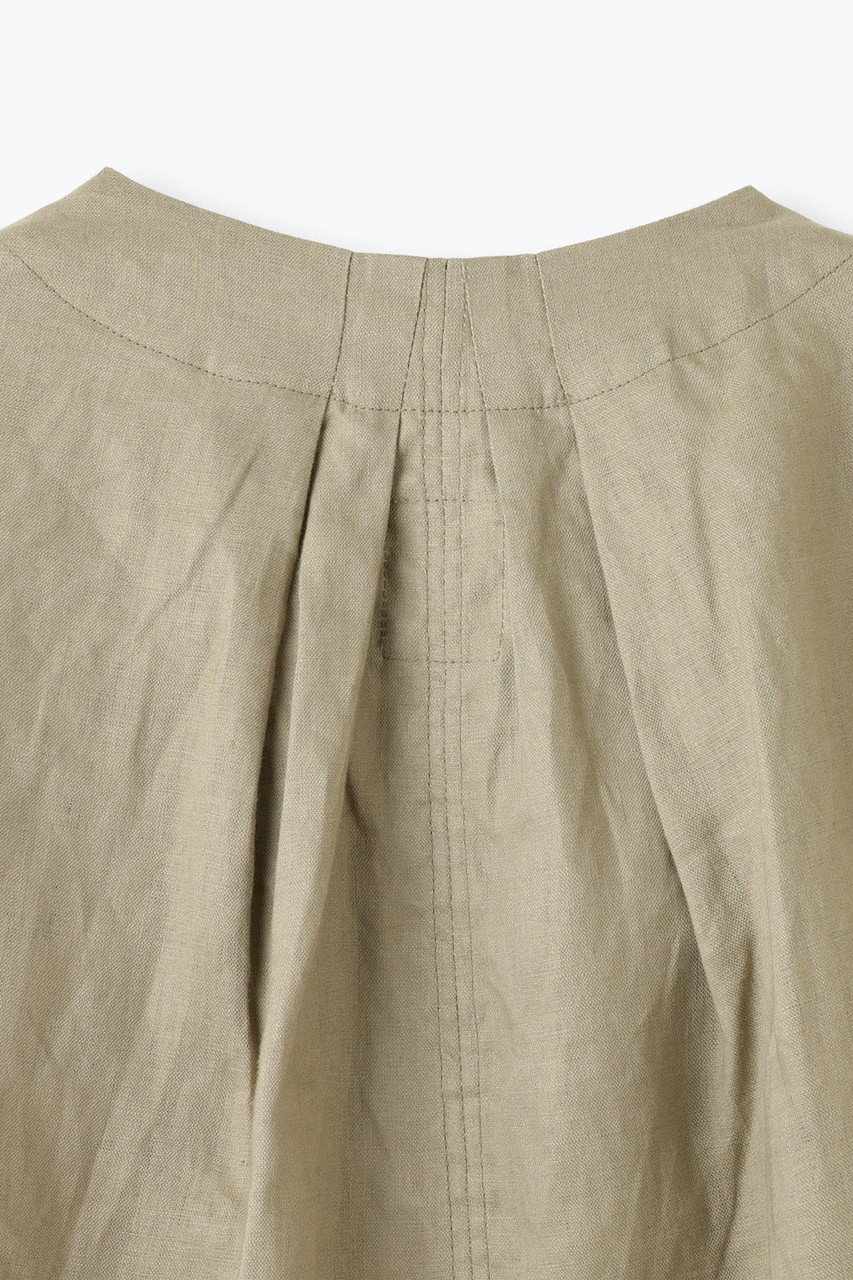背中に深めのタックを入れる事で風通しもよく、肌との空間が生まれて汗を拾っても染みない仕様に。暑い季節にさらっと羽織れるリネンボレロをお楽しみください。