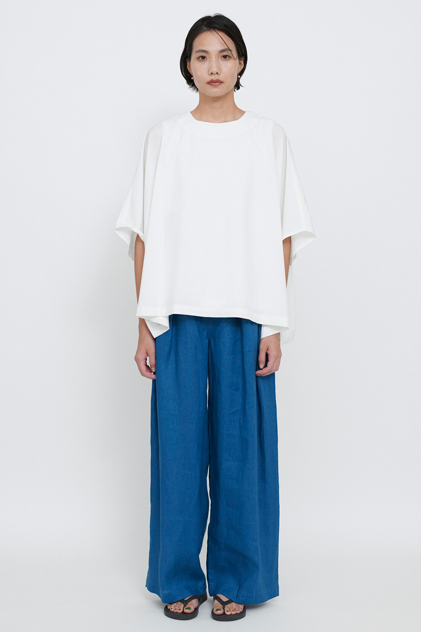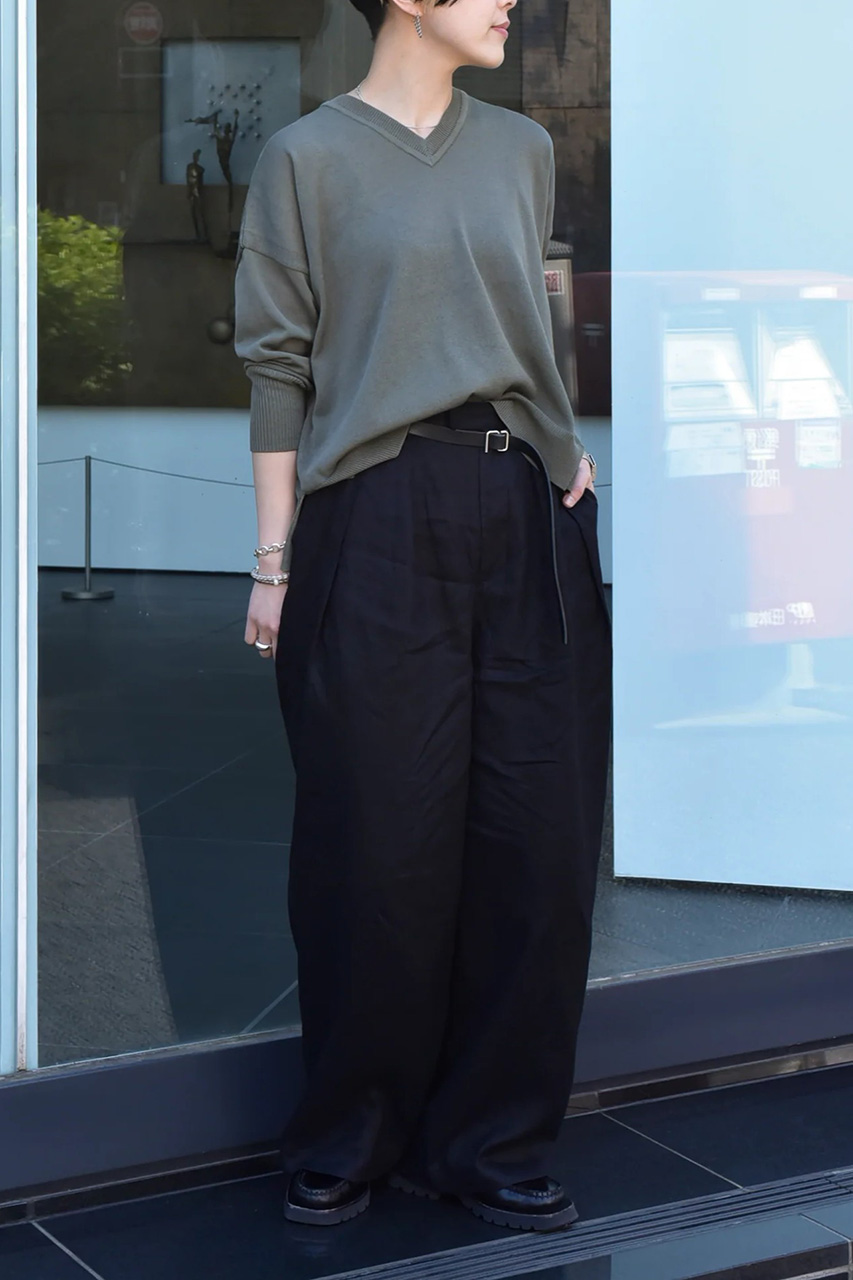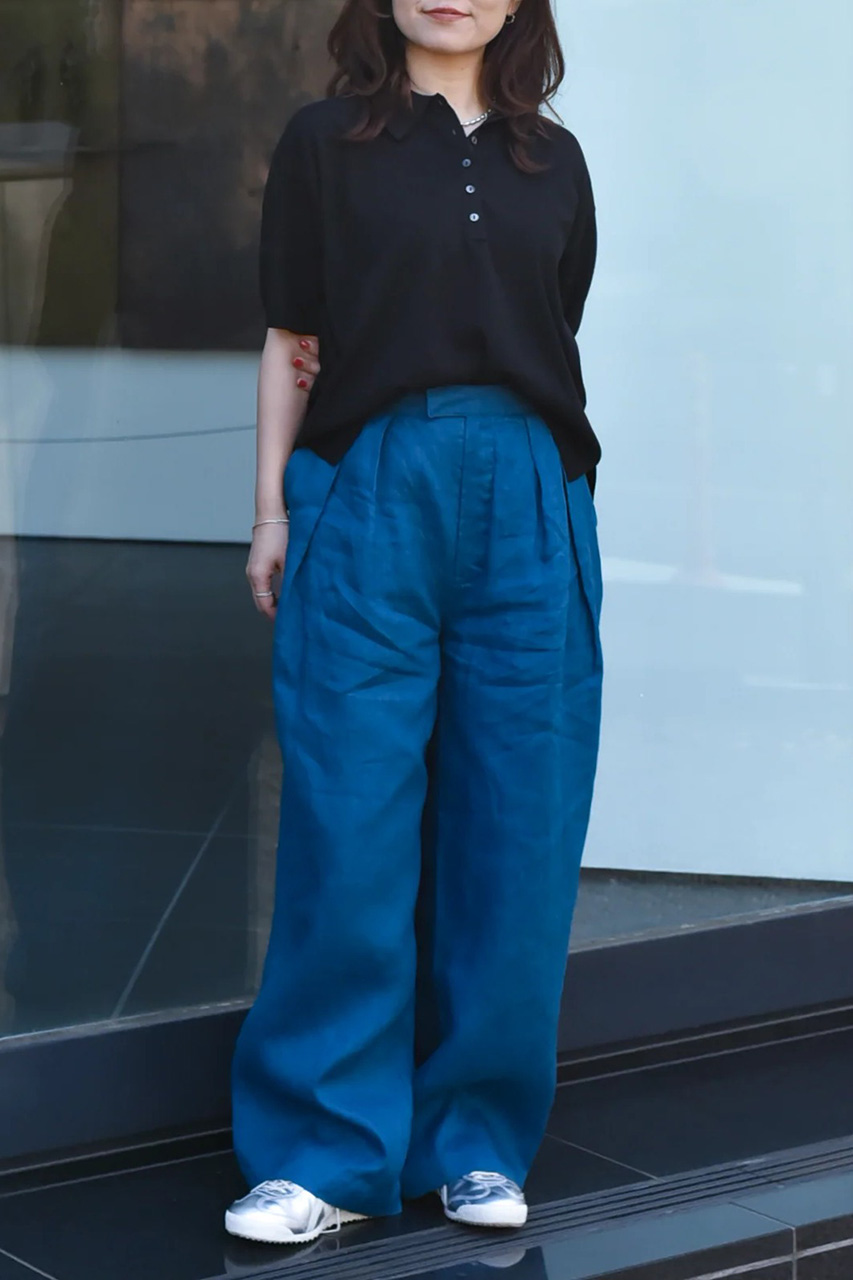 最も太いワイドパンツですが、リネン素材の落ち感でシルエットが程よく収まりお仕事でも使いやすい、きれいめデザインに仕上げています。