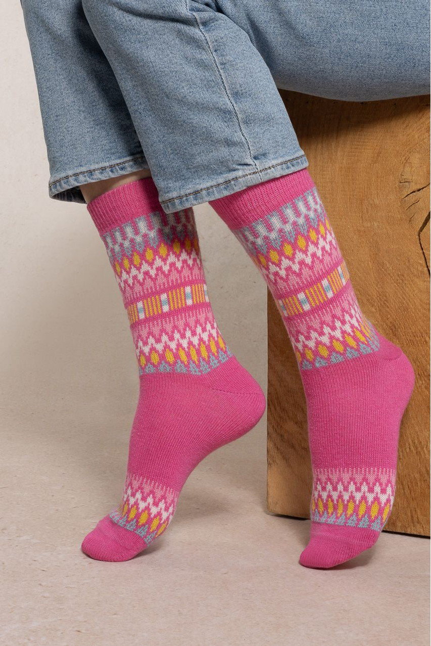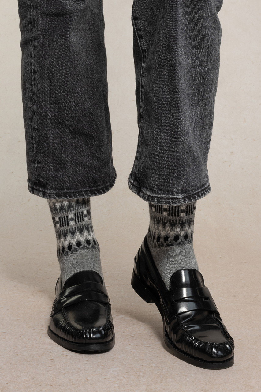 ノルディック柄が可愛さ満点! 幾何学模様を散りばめた冬らしいデザインでコーディネートのワンポイントに。ウールのあたたかさで足もとをふんわり包み込みます。