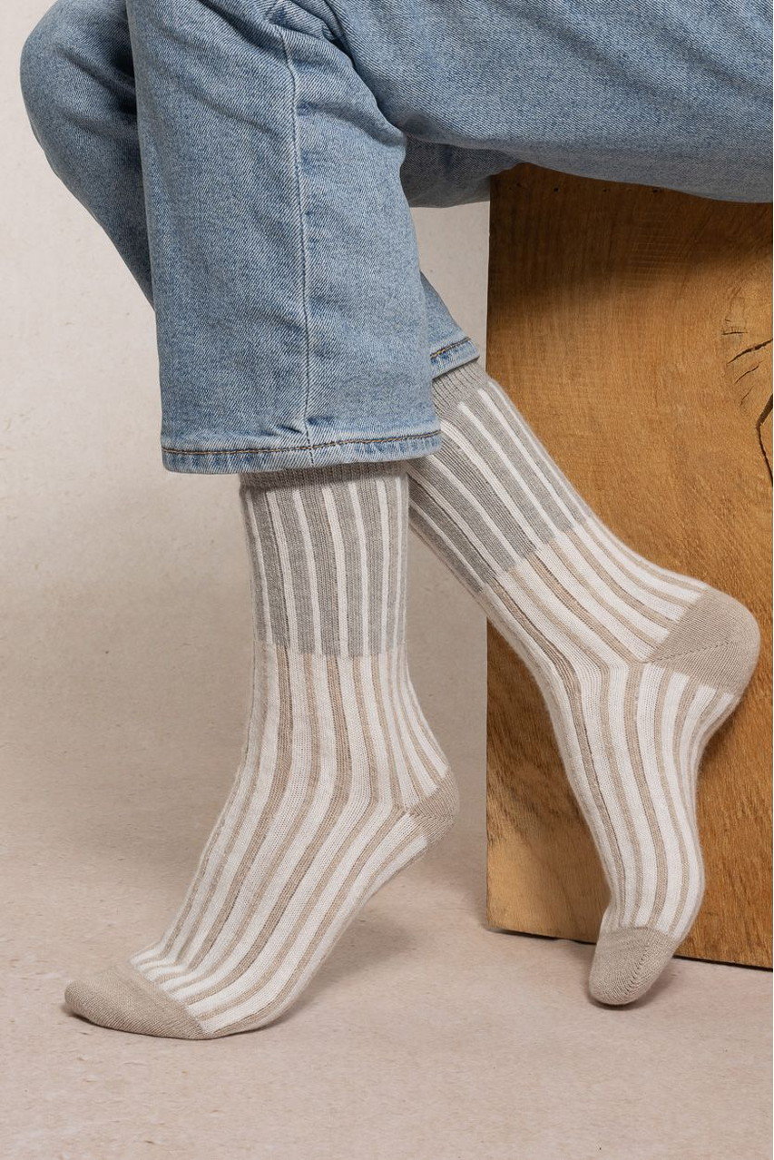 ビビッドな配色のマルチストライプ柄。ピンクやブルー、イエローなど鮮やかなカラーをリズミカルに配したデザインで、足もとに遊び心をプラス。特にグレーはベースカラーが落ち着いているので、柄ソックス初心者さんでもコーディネートに取り入れやすいカラーです。