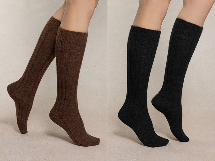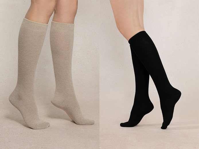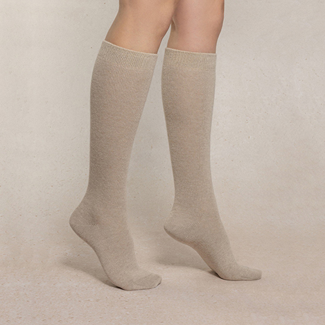 ウールにナイロンとレーヨンをバランスよくブレンドした編地は、しなやかで肌ざわり抜群。ウールのあたたかさにレーヨンのなめらかさが重なり、自然なフィット感で足元に上質な快適さをもたらします。ベージュとブラックの2色展開で、どんな装いにもすっと寄り添い、スタイリングを美しくまとめてくれます。