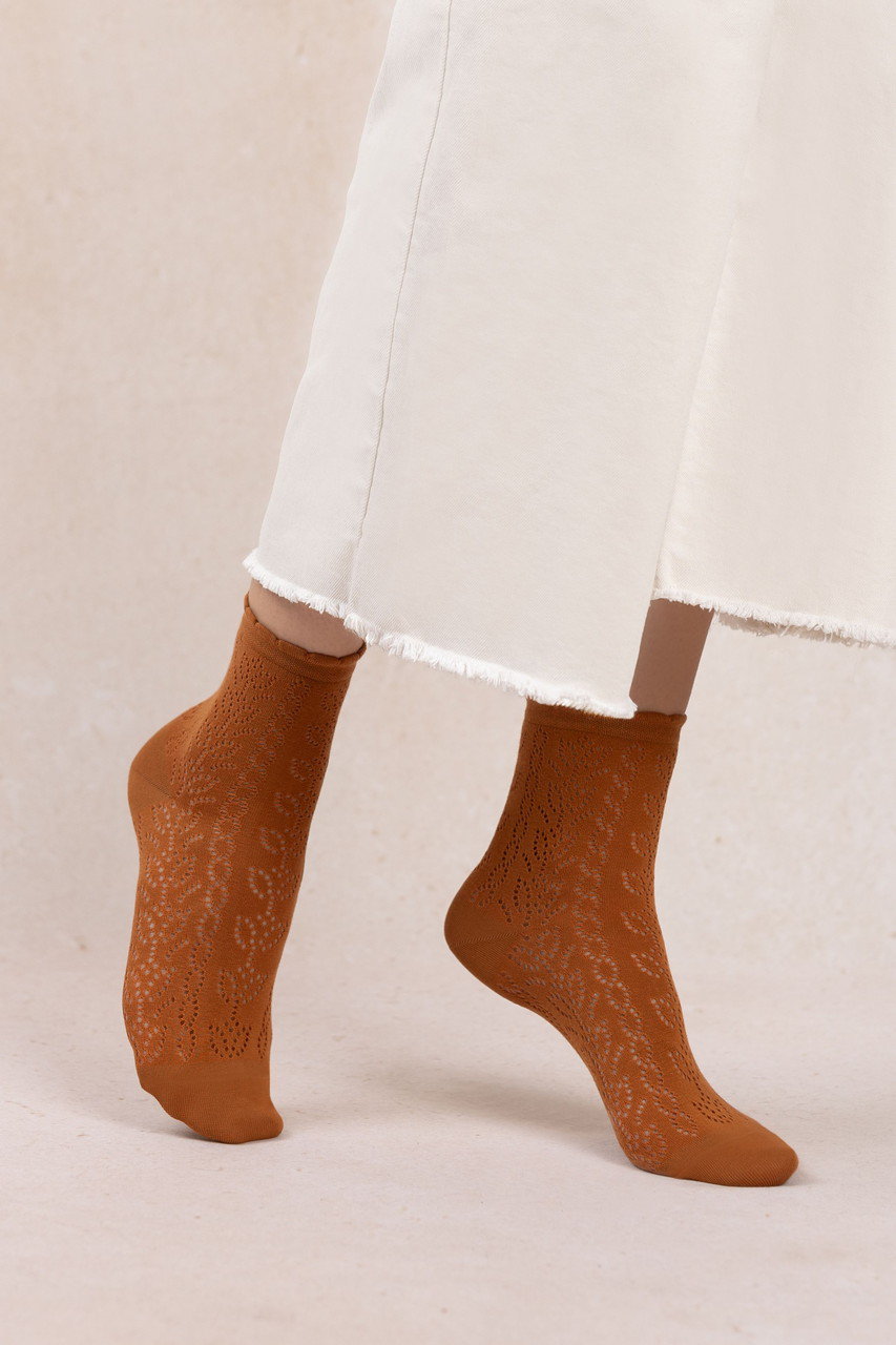 繊細な透かし編みが足元に軽やかな抜け感を添えるアンクル丈ソックス。甘さを抑えたニュアンスカラー4色はどれも大人のスタイリングにすっとなじみ、スタイリングのさりげないアクセントとして活躍。パンプスやサンダルに合わせで、足元にほんのり季節感を取り入れて。