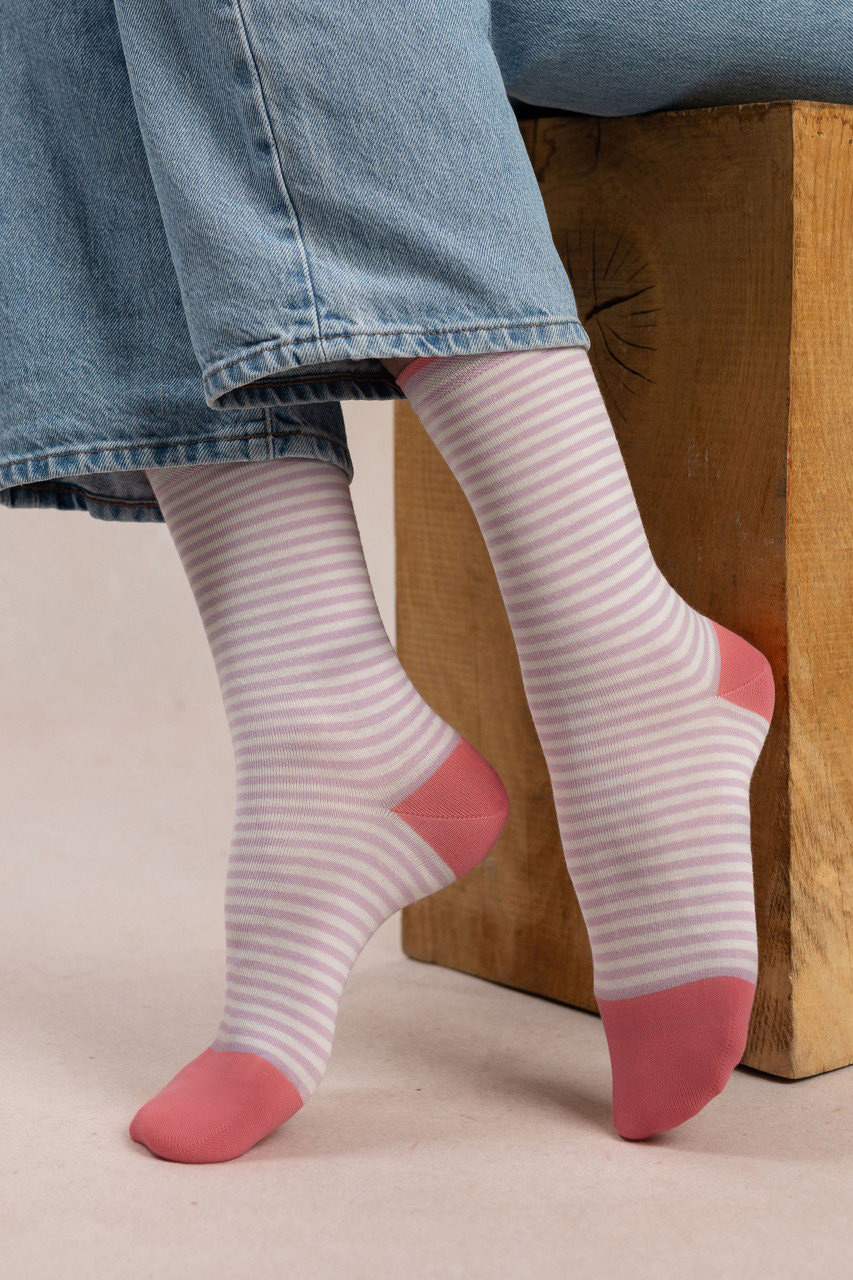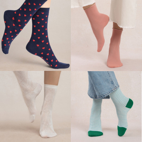 スタイリングに変化をつけたいなら、ハートやストライプの軽やかなデザインがおすすめ。足元にリズムと彩りを添えます。シンプルな装いにも自然と馴染み、スタイルに程よいアクセントをプラス。