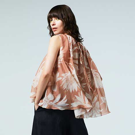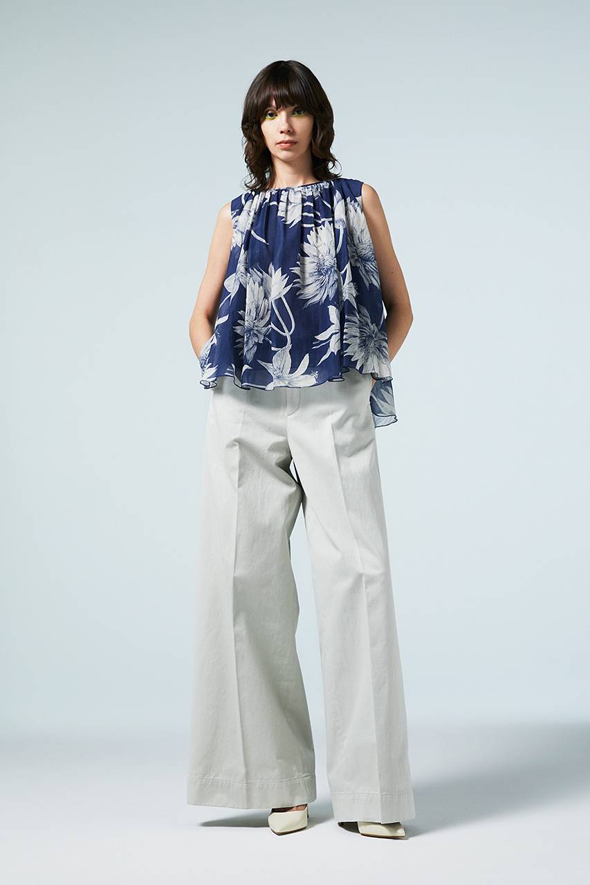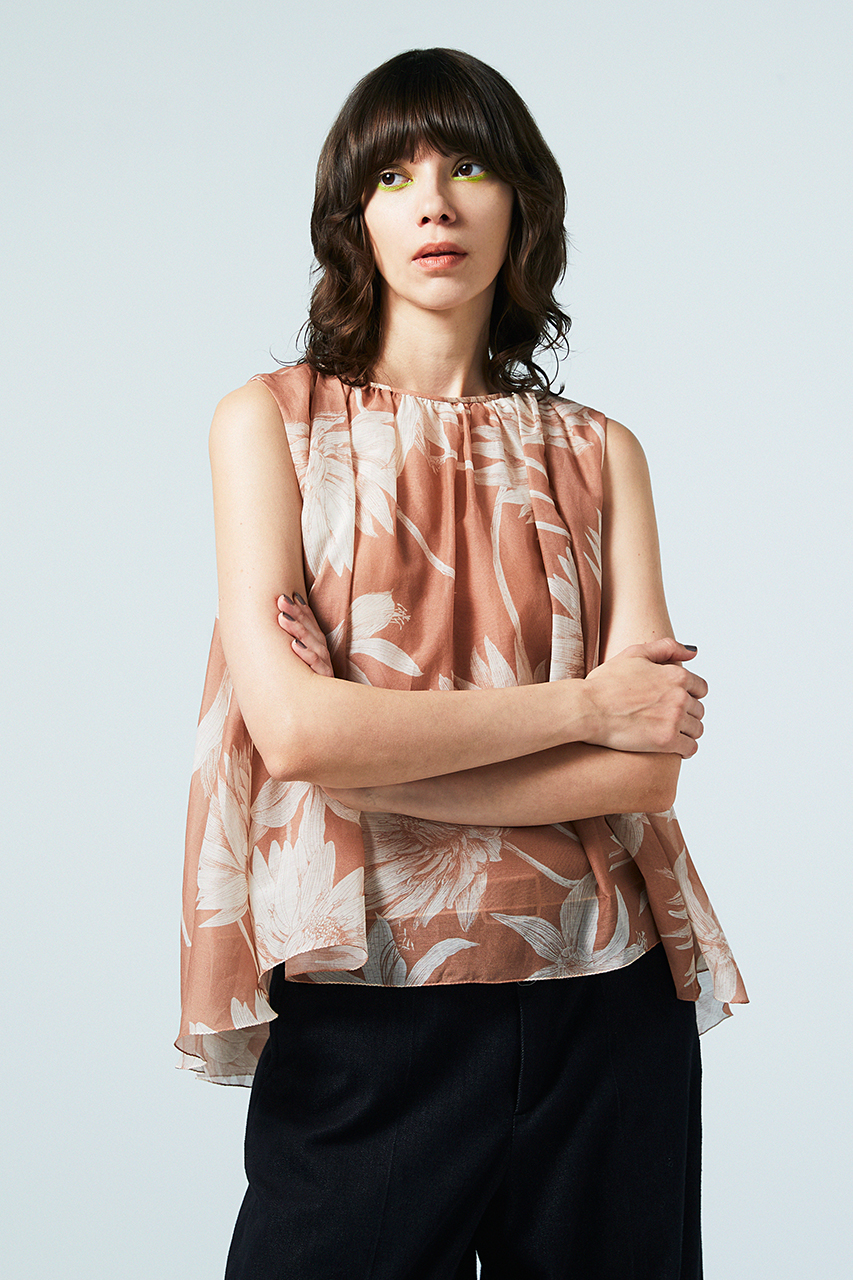 夏のオフシーンやリゾートスタイルに映える、華やかなフレアシルエットのノースリーブブラウス。ギャザーを寄せた動きのあるシルエットに、リトグラフ風にアレンジしたオリジナルのダリア柄をのせ、印象的な佇まいに。素材はコットンボイルにシルクを交織したローン生地を採用。繊細な透け感と軽やかな肌離れが、夏の装いに涼やかな印象を与えます。背面には華奢なスパゲッティコードを配し、抜け感のあるバックスタイルを演出。爽やかなアプリコット系と落ち着いたネイビー系の2色展開でご用意しています。