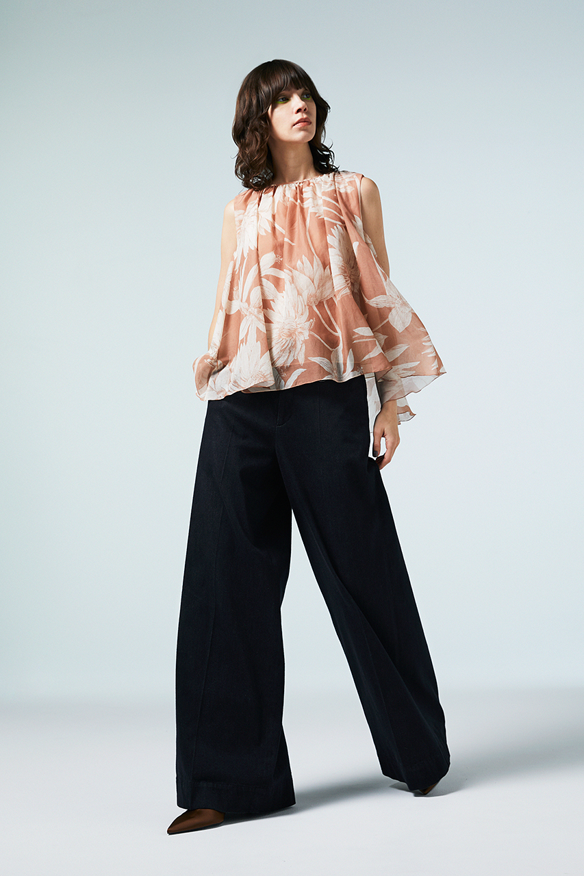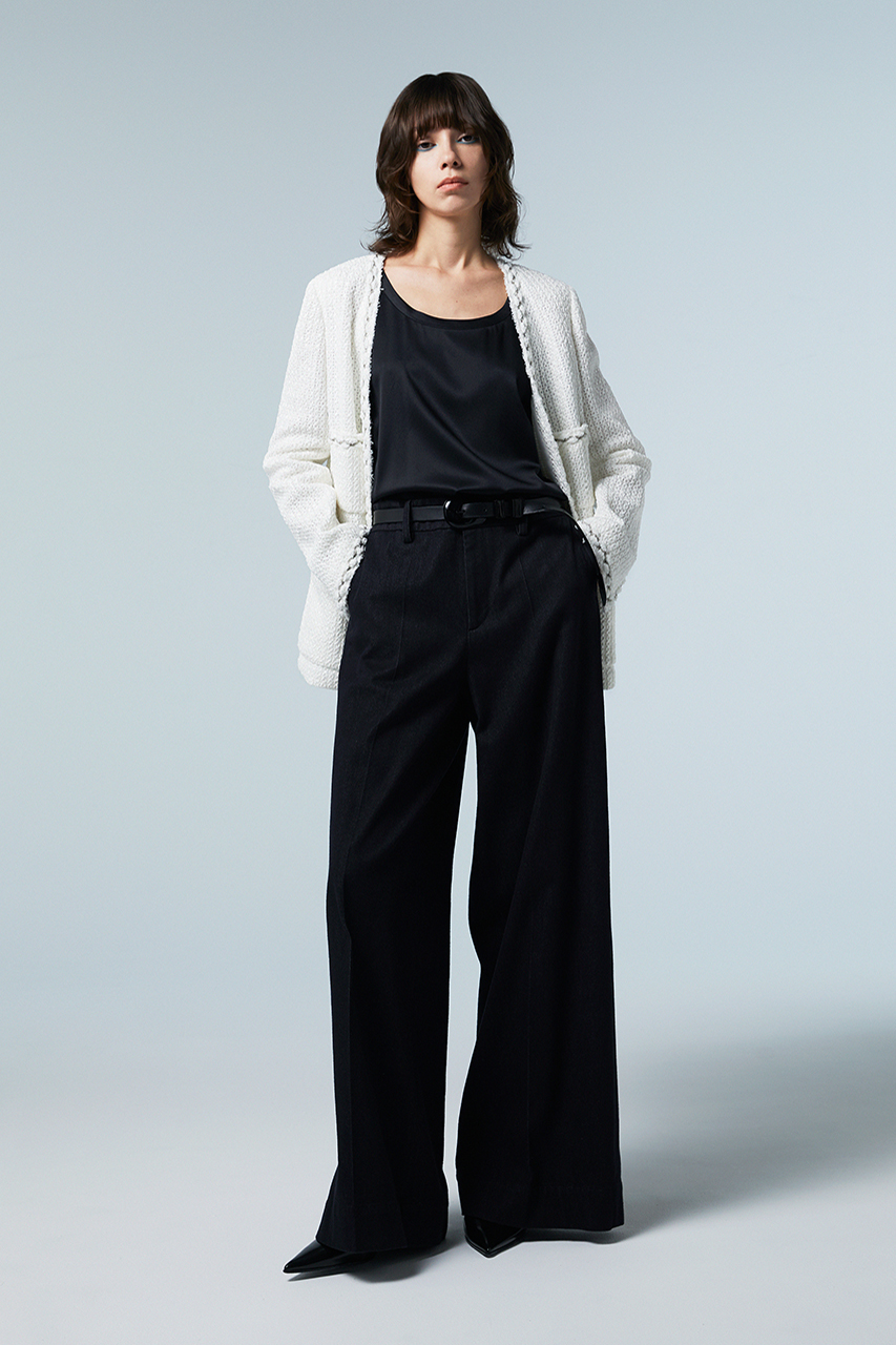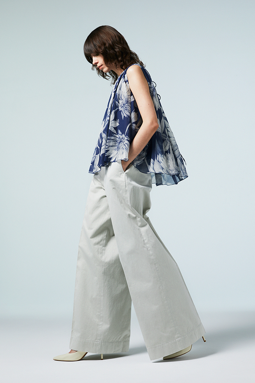 プリントブラウスに合わせたい、洗練されたパンツをご紹介。立体的なラインが魅力のバレルパンツは、小柄な方にも美しくなじみ、モード感のあるバランスを演出。落ち感のあるワイドレッグパンツは、軽やかなブラウスとも好相性で、上品な抜け感をプラスします。今シーズン初登場となるデニムパンツのバリエーションにも注目。ワイドレッグデニムは、すっきりとさせた腰周りとボリューム感のある足元のコントラストがモードなシルエット。もう一方のワイドストレートデニムは、ほどよいゆとりと直線的なラインが魅力で、華やかなトップスをデイリーに取り入れたいときに最適です。多彩なボトムスのシルエットで、夏のスタイリングを品良く引き立てます。