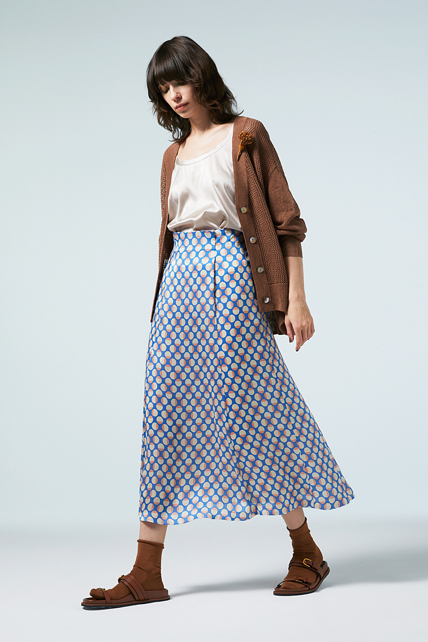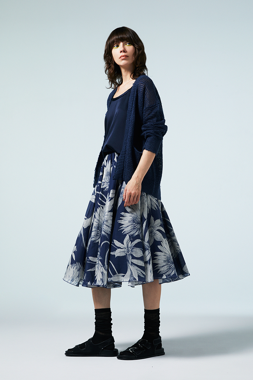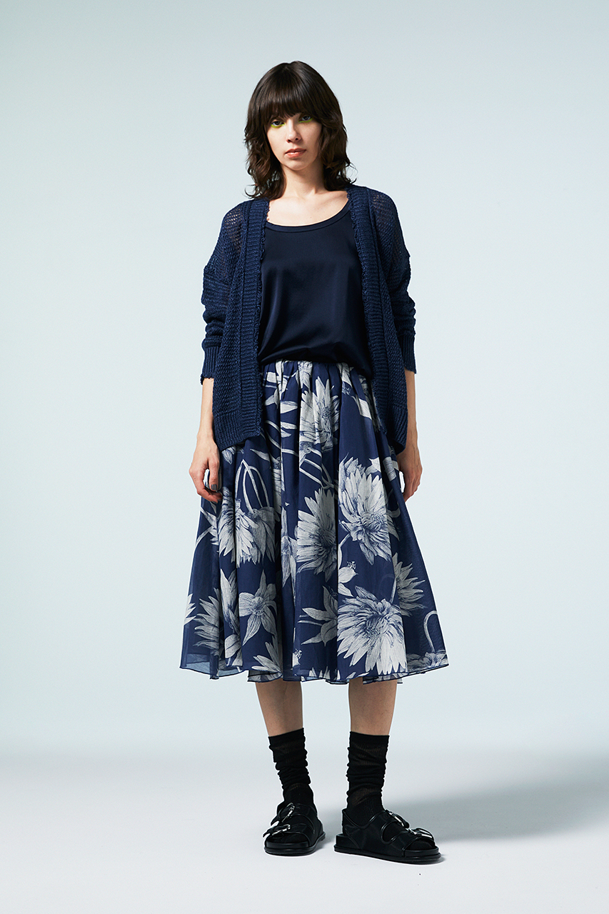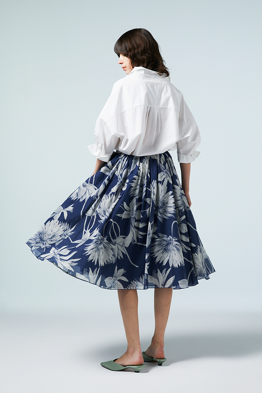 ダリア柄ではもう一型、ミディ丈スカートもラインナップ。ウエストにいれた繊細なギャザーでふんわりと広がるシルエットが魅力。シアーな素材が動くたびに優雅に揺れます。スカートはデイリーにも取り入れやすく、リゾートまで幅広く活躍。上質な軽やかさが季節感を引き立て、ワードローブに華やかさを添えてくれます。