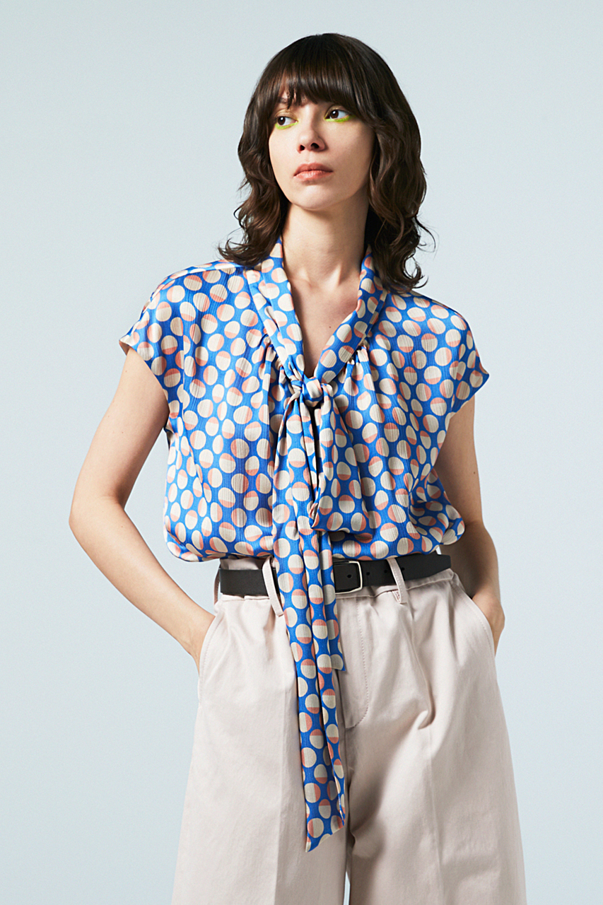 そのほか、存在感のあるレトロなドット柄をまとったボウタイブラウスとタックスカートは、単品ではもちろん、セットアップとしても楽しめるアイテム。柄の華やかさと色使いのバランスが絶妙で、スタイリングに彩りを添えます。トップスやボトムをシンプルに合わせれば、柄アイテムを主役にしたコーディネートもすっきりとした印象に。夏の日常に寄り添いながら、さりげなくモード感をまとえるEAUVIREのコレクション。ぜひ、この機会にお気に入りの一枚を見つけてください。