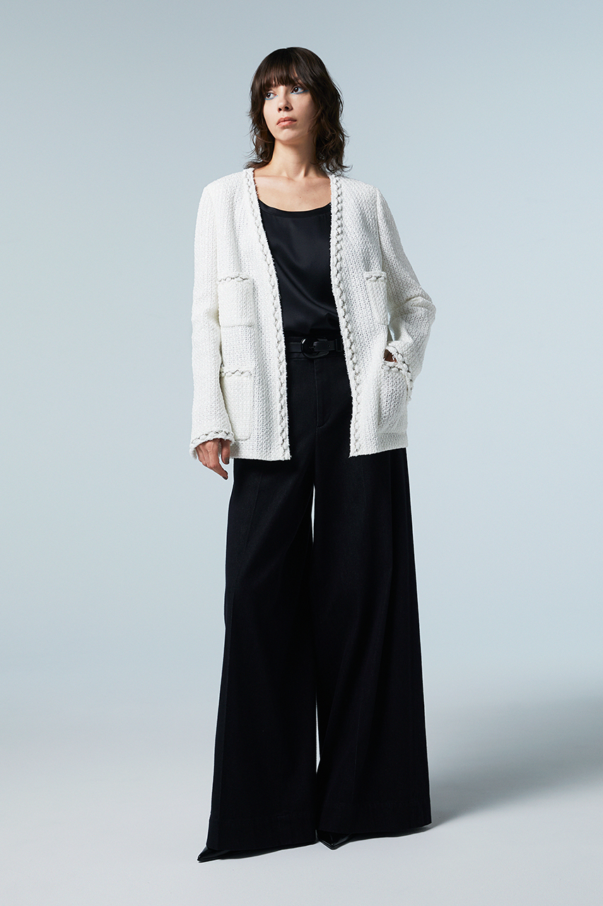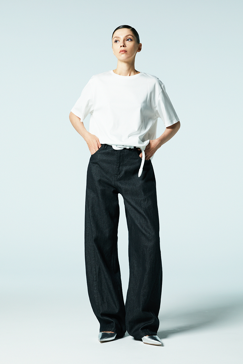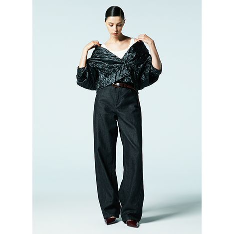 デニムにもう1タイプ、異なる表情を楽しめるワイドシルエットもラインナップ。ノータックで腰周りをすっきり整え、裾にかけて広がる端正なフォルムがモードな存在感を演出。ムラ糸やスラブ糸、特殊撚糸のシルクストレッチ糸を交織した日本製デニムは、しなやかで快適なはき心地。インディゴ染めとは異なり、シルクやコットンのように色落ちせず、上質感が長く続くのも魅力。ワンウォッシュでほどよいこなれ感を添えています。