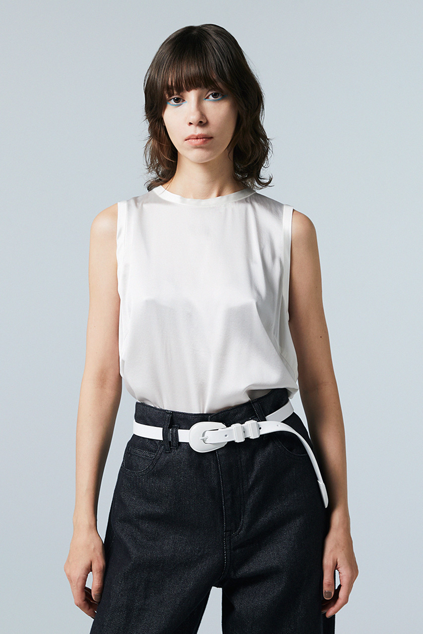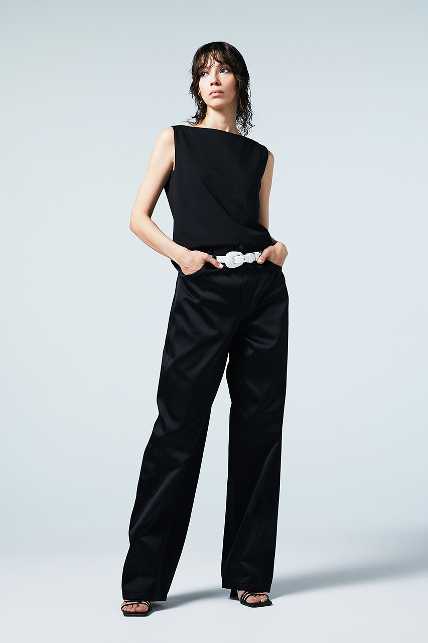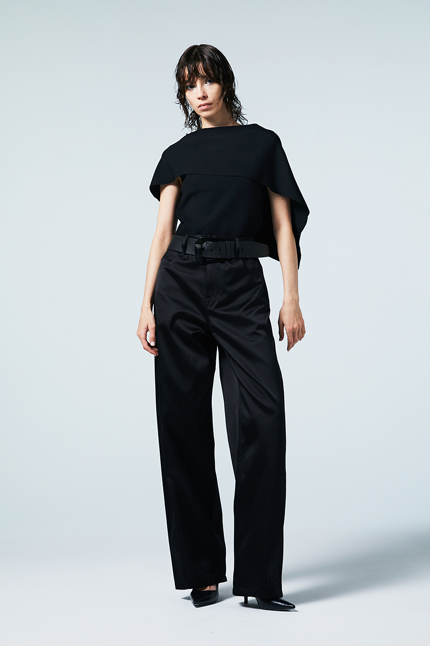 同シルエットで、上質なシルクサテン素材のタイプも展開。脇線をフロント寄りに配したワイドストレートが新鮮な印象を演出。高品質シルクをたて糸に、コットンをよこ糸に使用した超高密度の日本製ダブルサテンは、シルクならではのしなやかな光沢と、程よいカジュアル感を両立。ウエストを少し落として穿くと、モードな囲気に。黒一色のスタイリングも奥行きが生まれ、印象的に映る一枚。艶のあるリベットがアクセント。