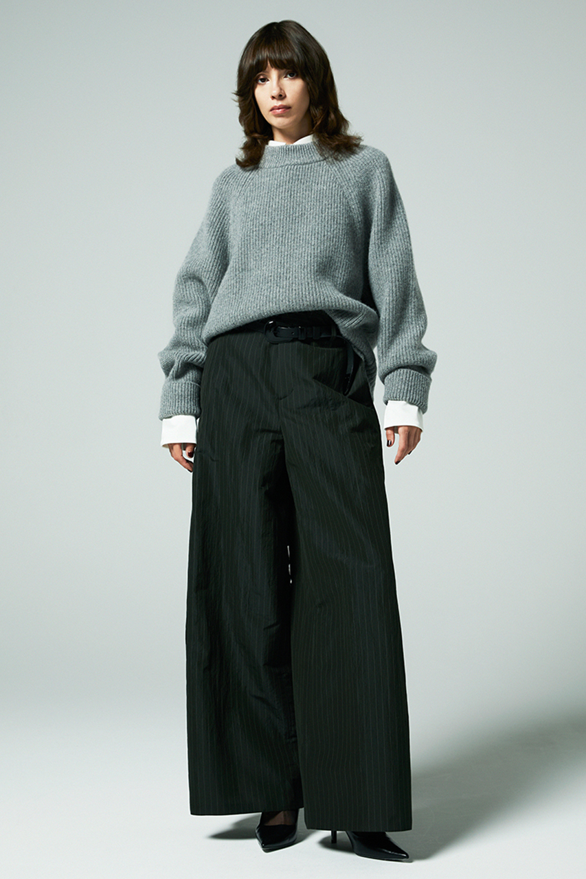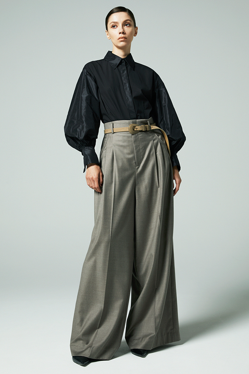 シャツに合わせたいのは、ほかにはない肌触りが魅力のワイドパンツ。ウールを使用しながらも、特殊な加工をすることで特徴のあるドライな質感に。すっきりとした縦ラインと程よいボリューム感で、シンプルなトップスに合わせるだけでも洗練された印象をもたらします。ロングシーズン取り入れやすく、オン・オフどちらにも活躍する万能な一本です。