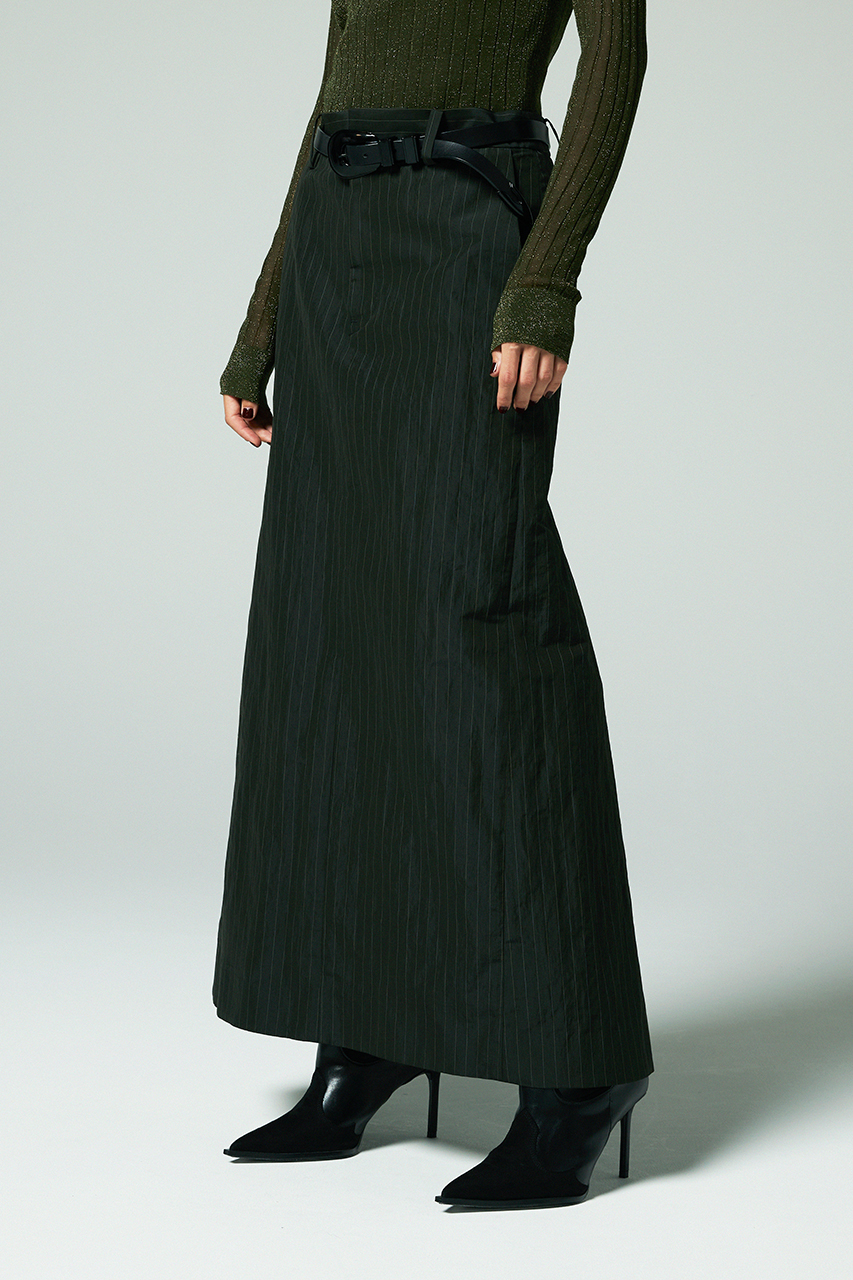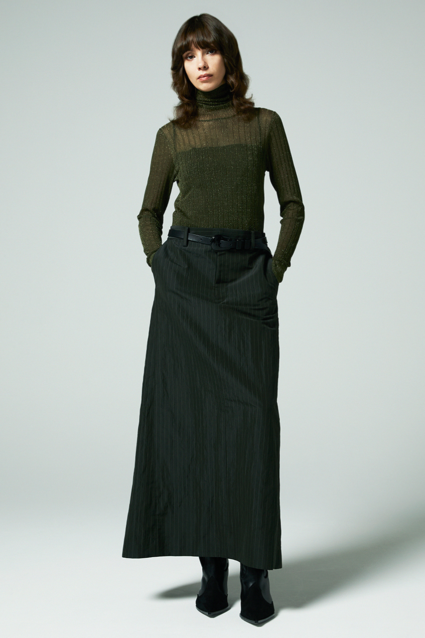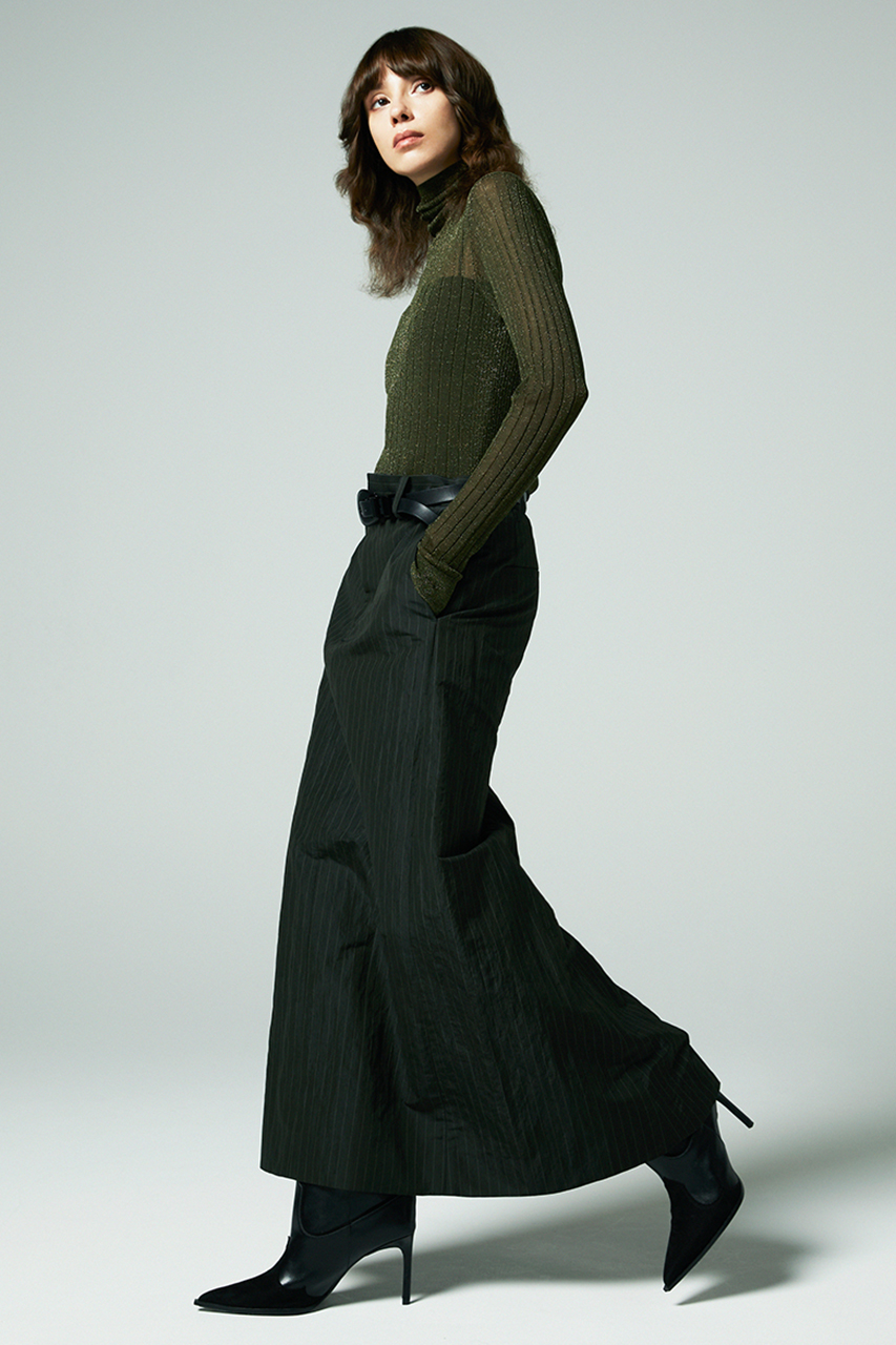 同素材を使用したバックフレアスカートは、フロント部分はフラットに、バックスタイルは裾に向かって自然に広がる個性的なシルエットがポイント。時間をゆっくりかけて微妙なシワ加工を施すことでラグジュアリーなリラックス感を醸し出しました。腰まわりが華奢に見えるデザインでボリュームのあるトップスと好相性。モード感とエレガンスを両立させています。