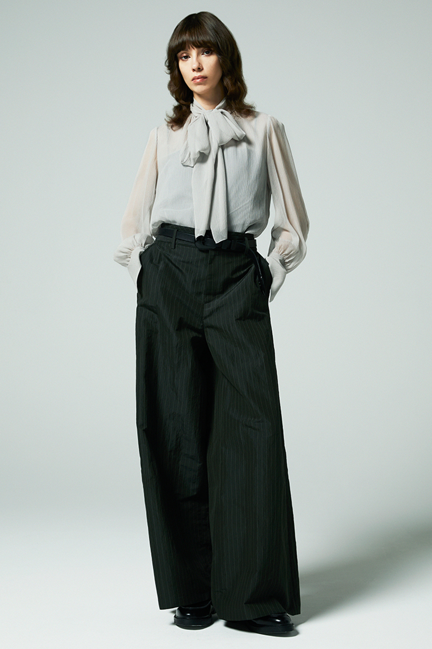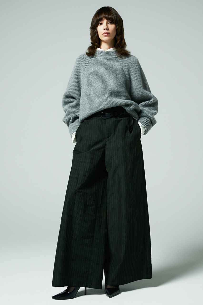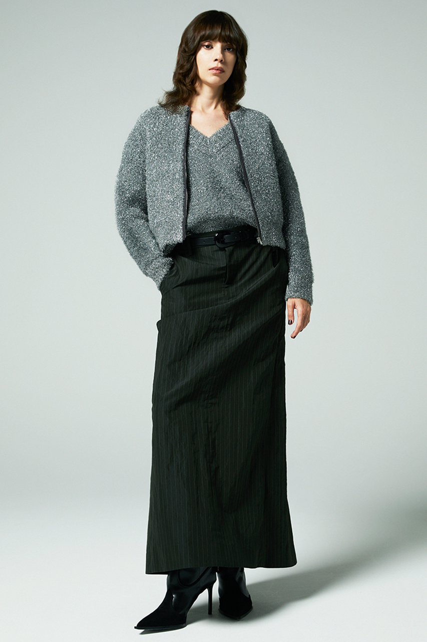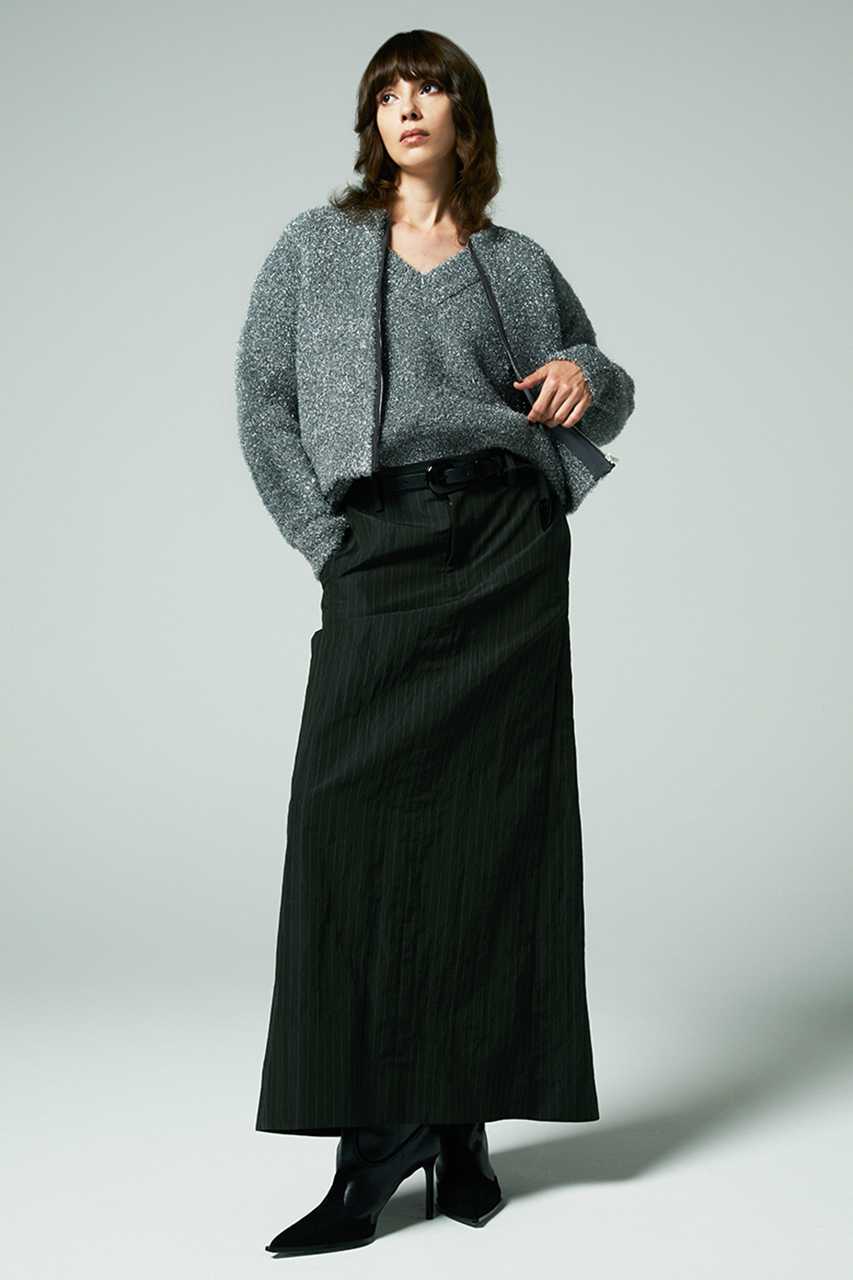 同素材を使用したバックフレアスカートは、フロント部分はフラットに、バックスタイルは裾に向かって自然に広がる個性的なシルエットがポイント。時間をゆっくりかけて微妙なシワ加工を施すことでラグジュアリーなリラックス感を醸し出しました。腰まわりが華奢に見えるデザインでボリュームのあるトップスと好相性。モード感とエレガンスを両立させています。