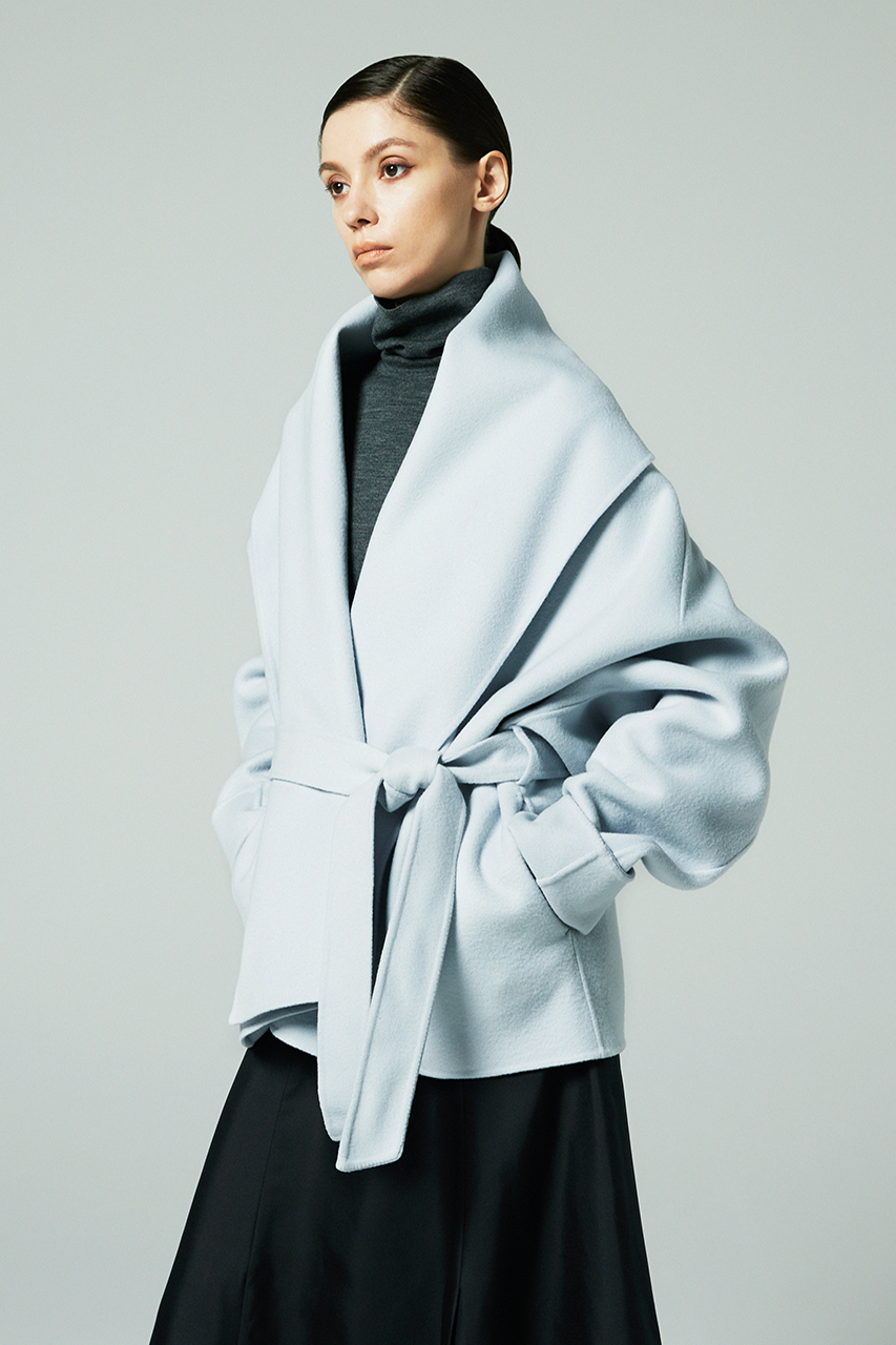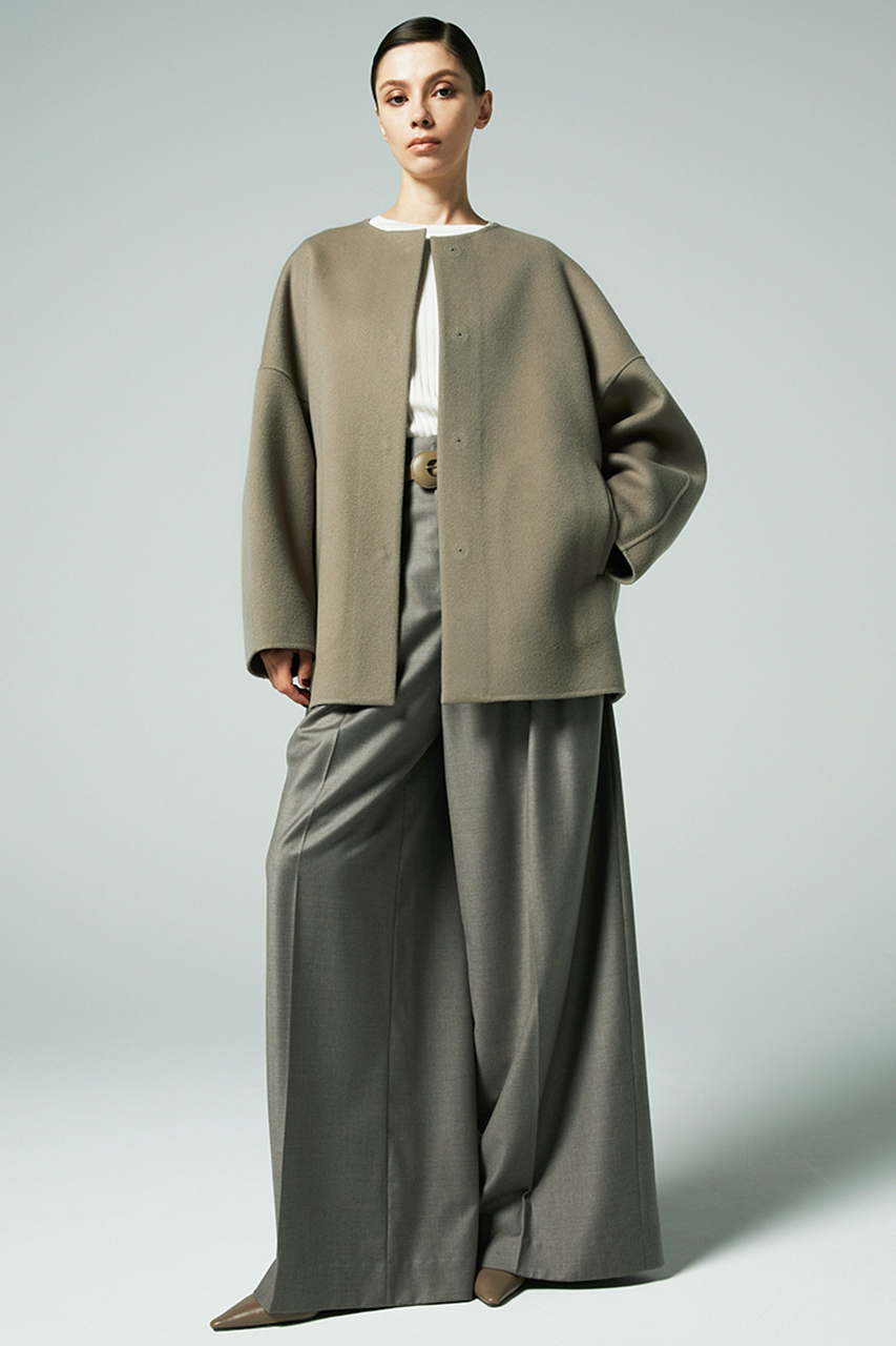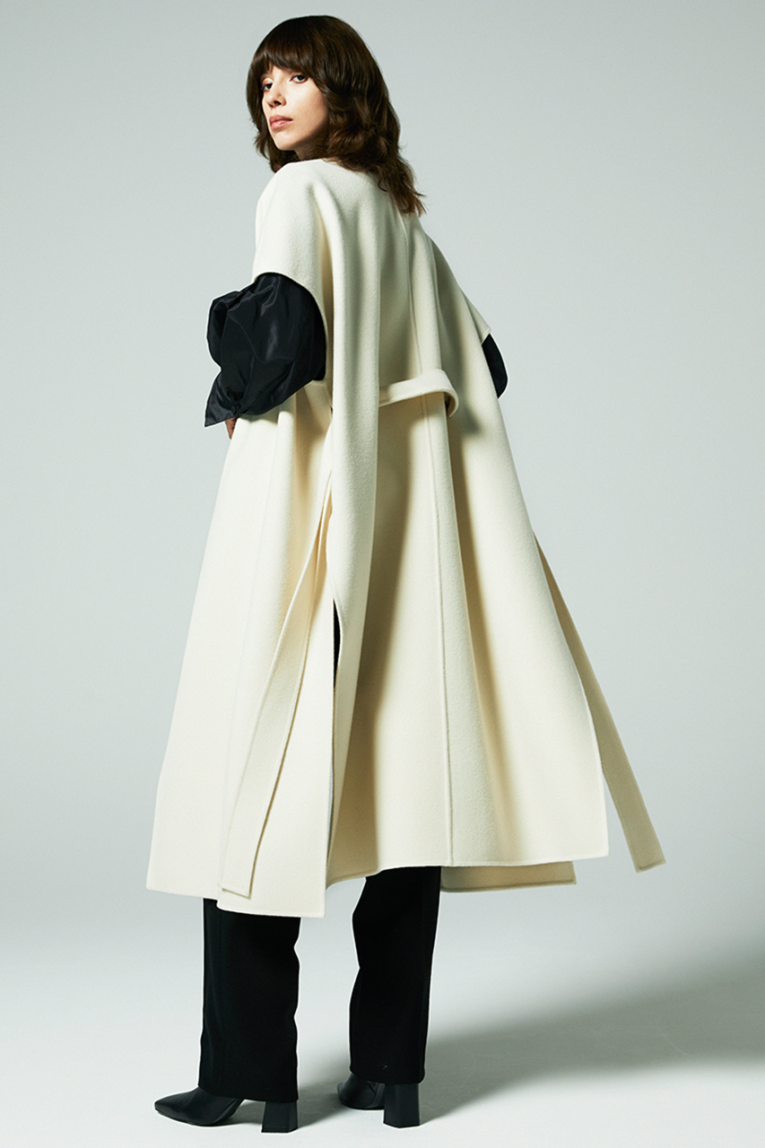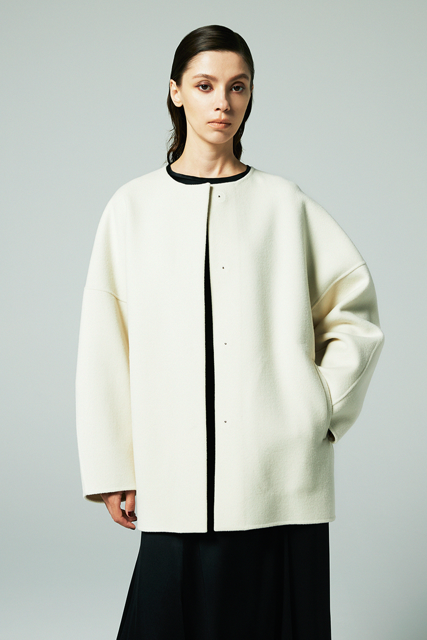 同シリーズの上質素材を贅沢に使用したノーカラーミドルコート。繊細な糸が生む柔らかな風合いと、美しい丸みを描くシルエットが魅力です。シンプルながら構築的なフォルムで、さっと羽織るだけでも洗練された印象に。袖部分には裏地を施して快適な着心地を叶え、見返しにはシルクを配してさりげない上質感をプラス。オンにもオフにもなじむ汎用性の高さで、しなやかな品を添えます。