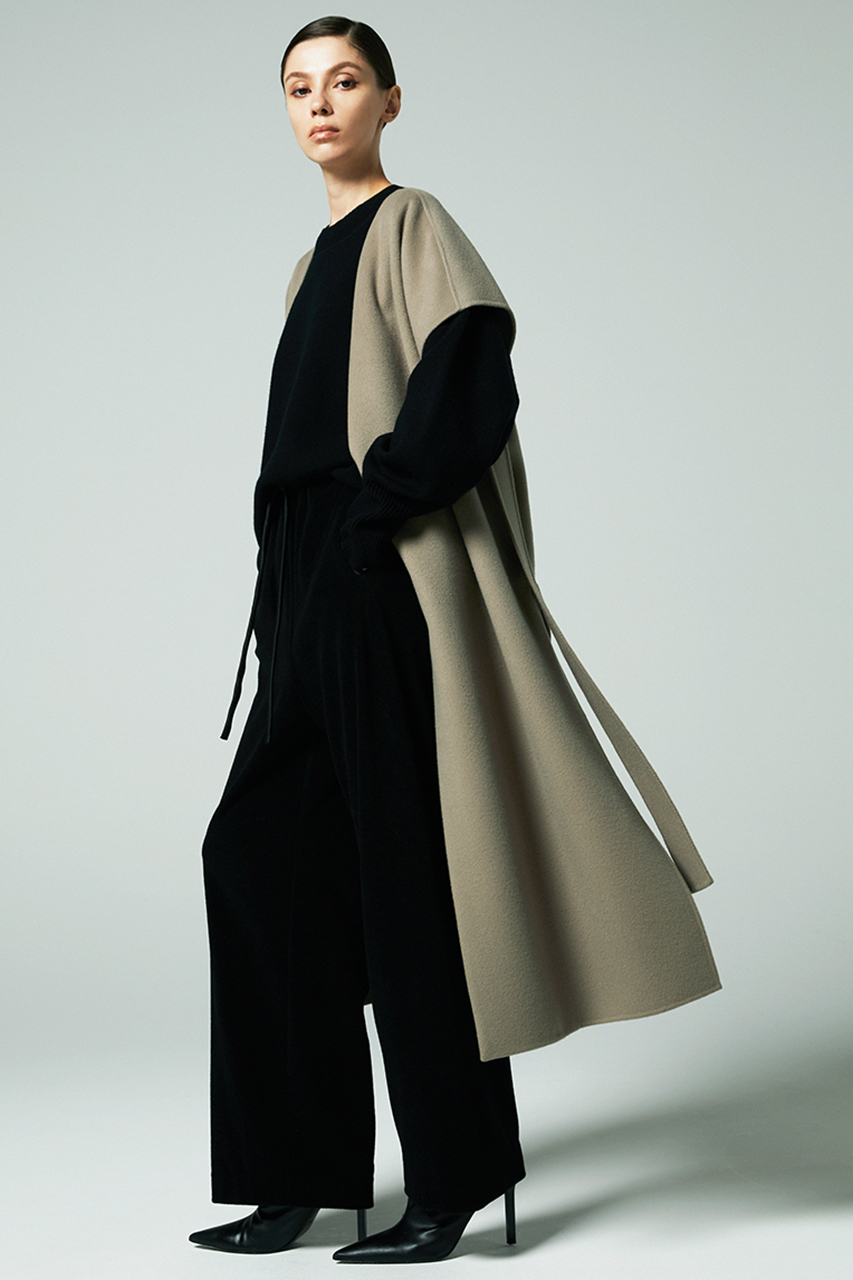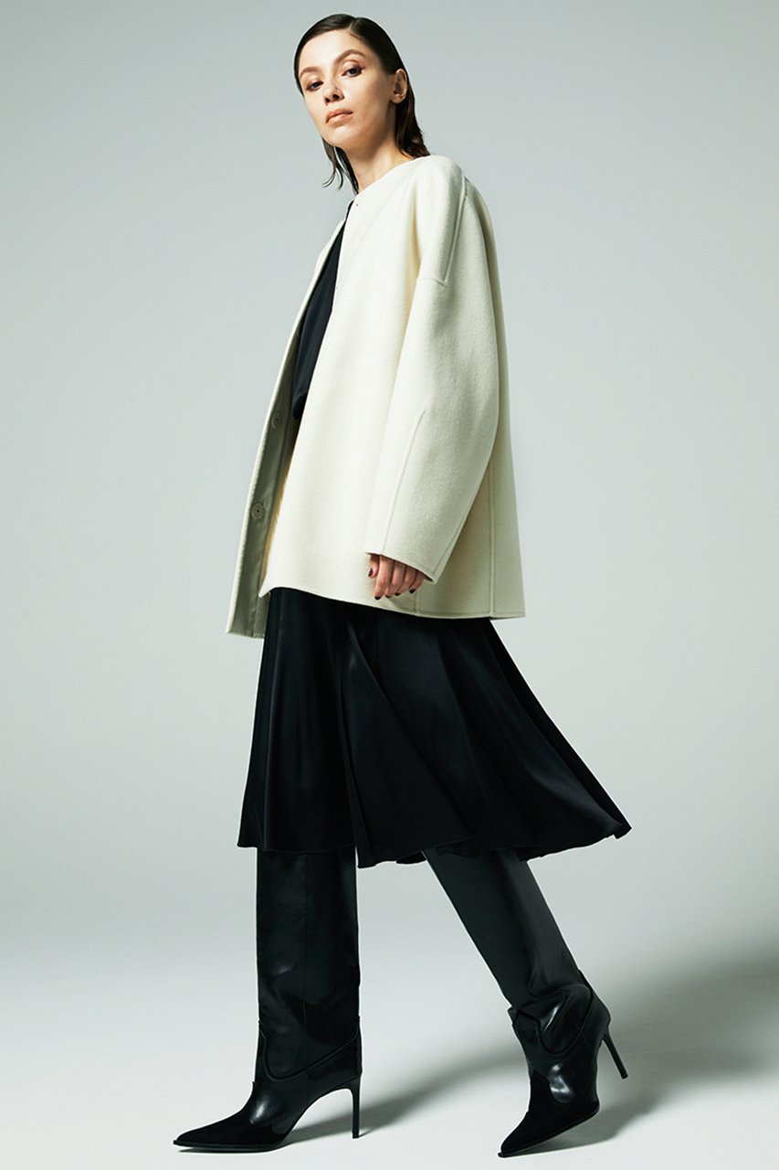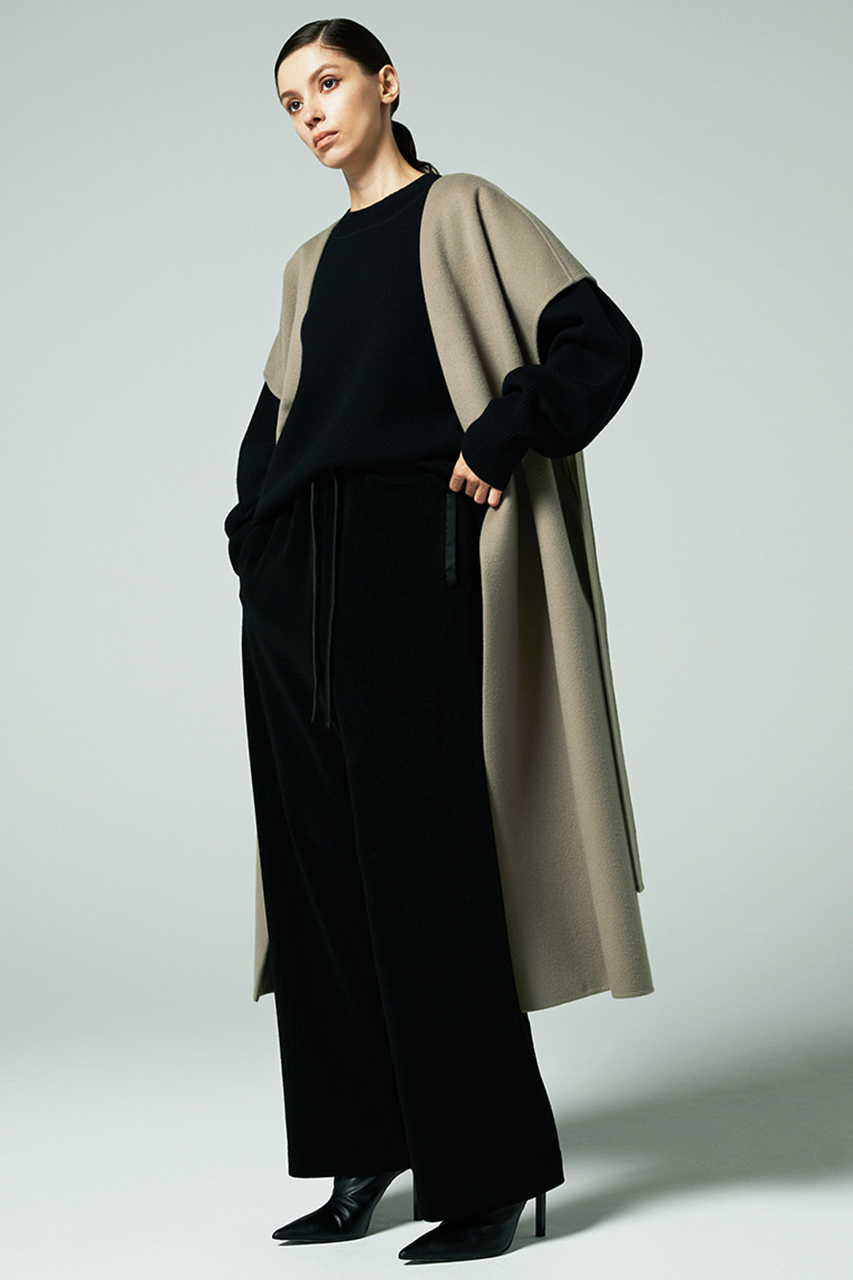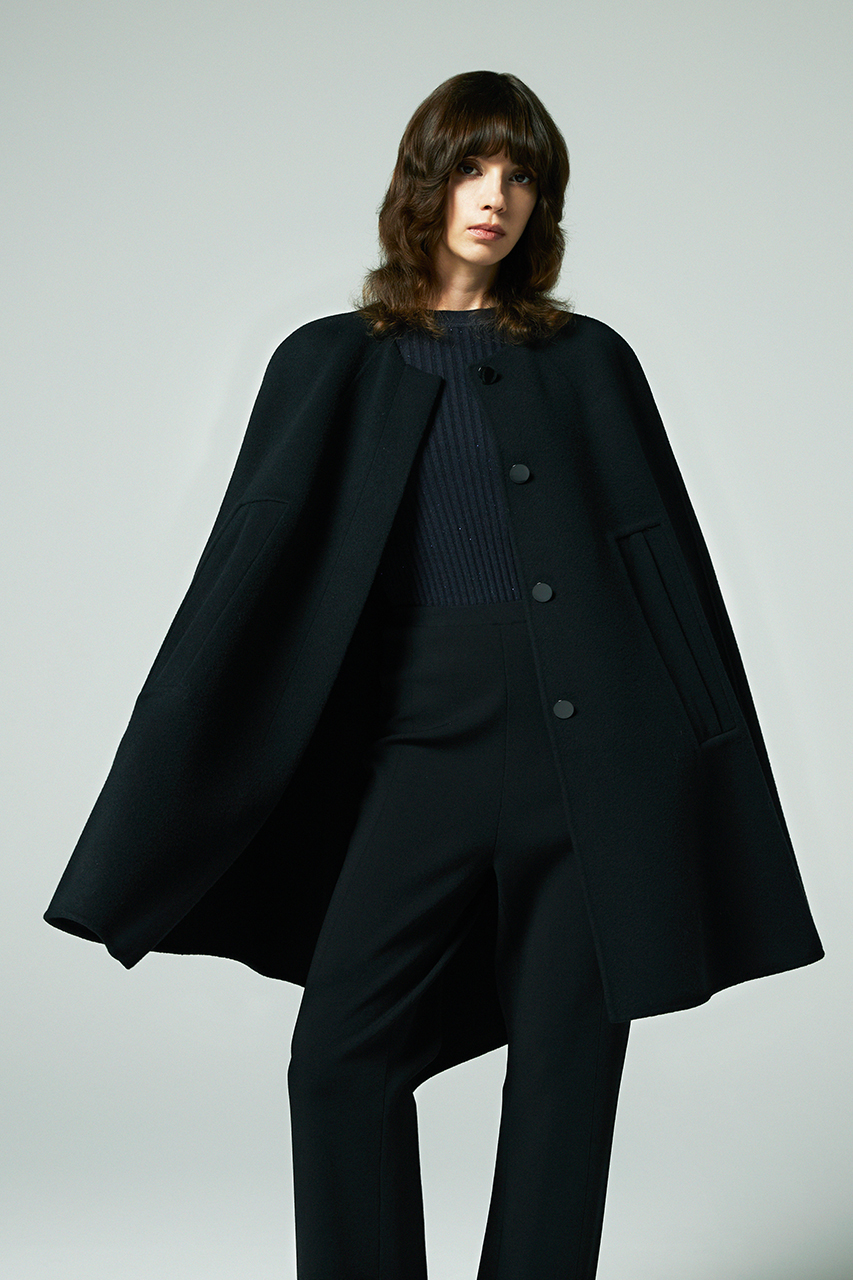 同シリーズの上質素材を贅沢に使用したノーカラーミドルコート。繊細な糸が生む柔らかな風合いと、美しい丸みを描くシルエットが魅力です。シンプルながら構築的なフォルムで、さっと羽織るだけでも洗練された印象に。袖部分には裏地を施して快適な着心地を叶え、見返しにはシルクを配してさりげない上質感をプラス。オンにもオフにもなじむ汎用性の高さで、しなやかな品を添えます。
