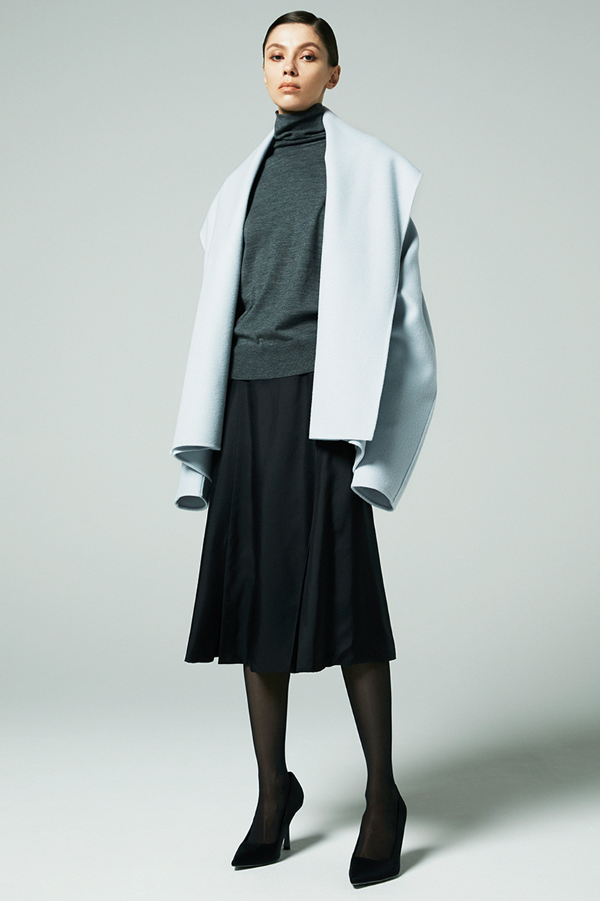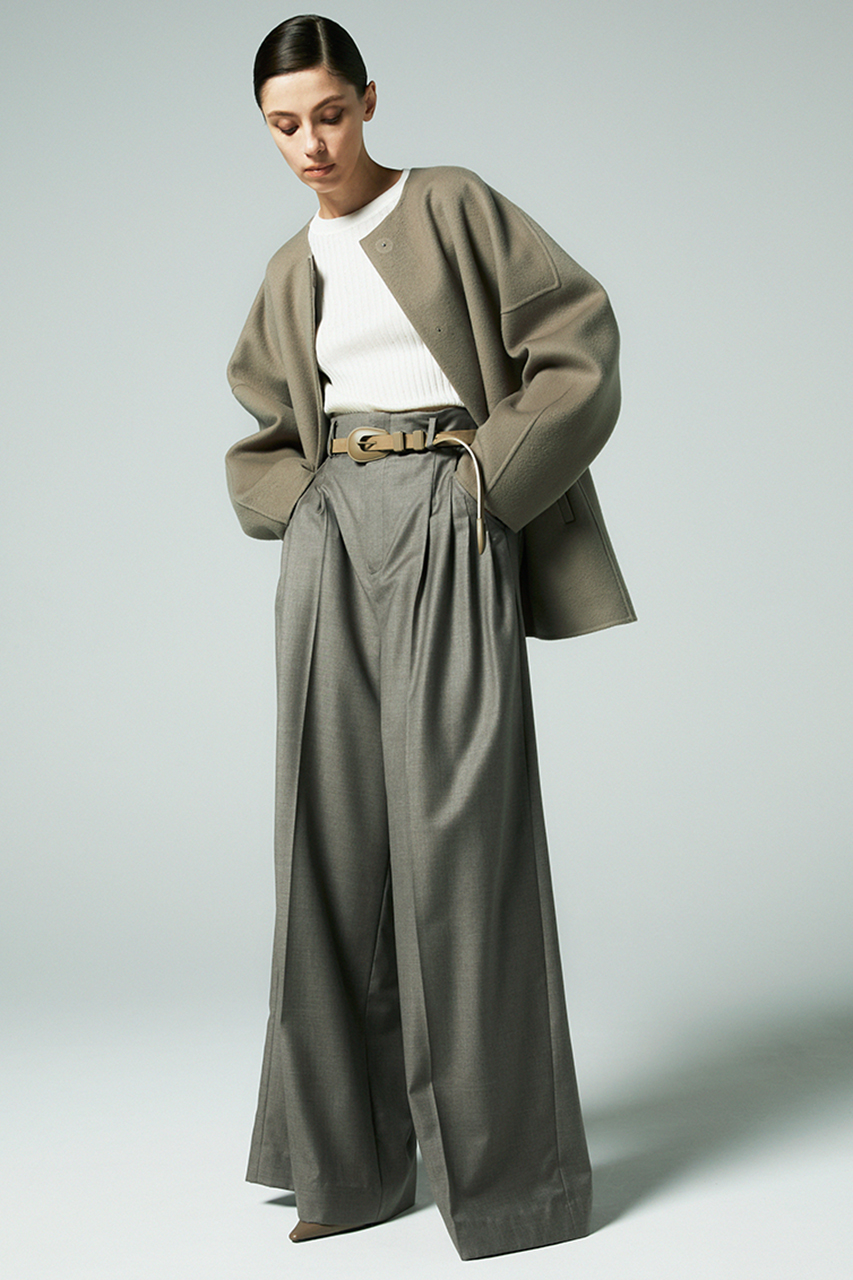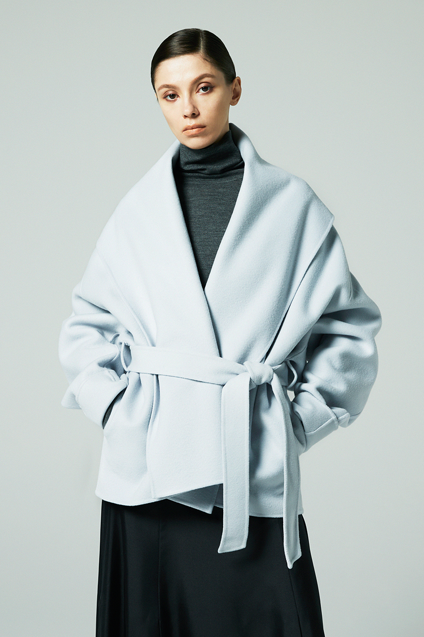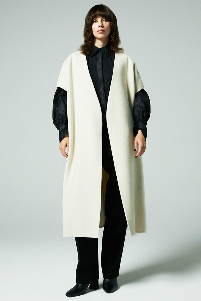同シリーズの上質素材を贅沢に使用したノーカラーミドルコート。繊細な糸が生む柔らかな風合いと、美しい丸みを描くシルエットが魅力です。シンプルながら構築的なフォルムで、さっと羽織るだけでも洗練された印象に。袖部分には裏地を施して快適な着心地を叶え、見返しにはシルクを配してさりげない上質感をプラス。オンにもオフにもなじむ汎用性の高さで、しなやかな品を添えます。