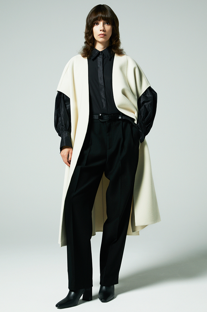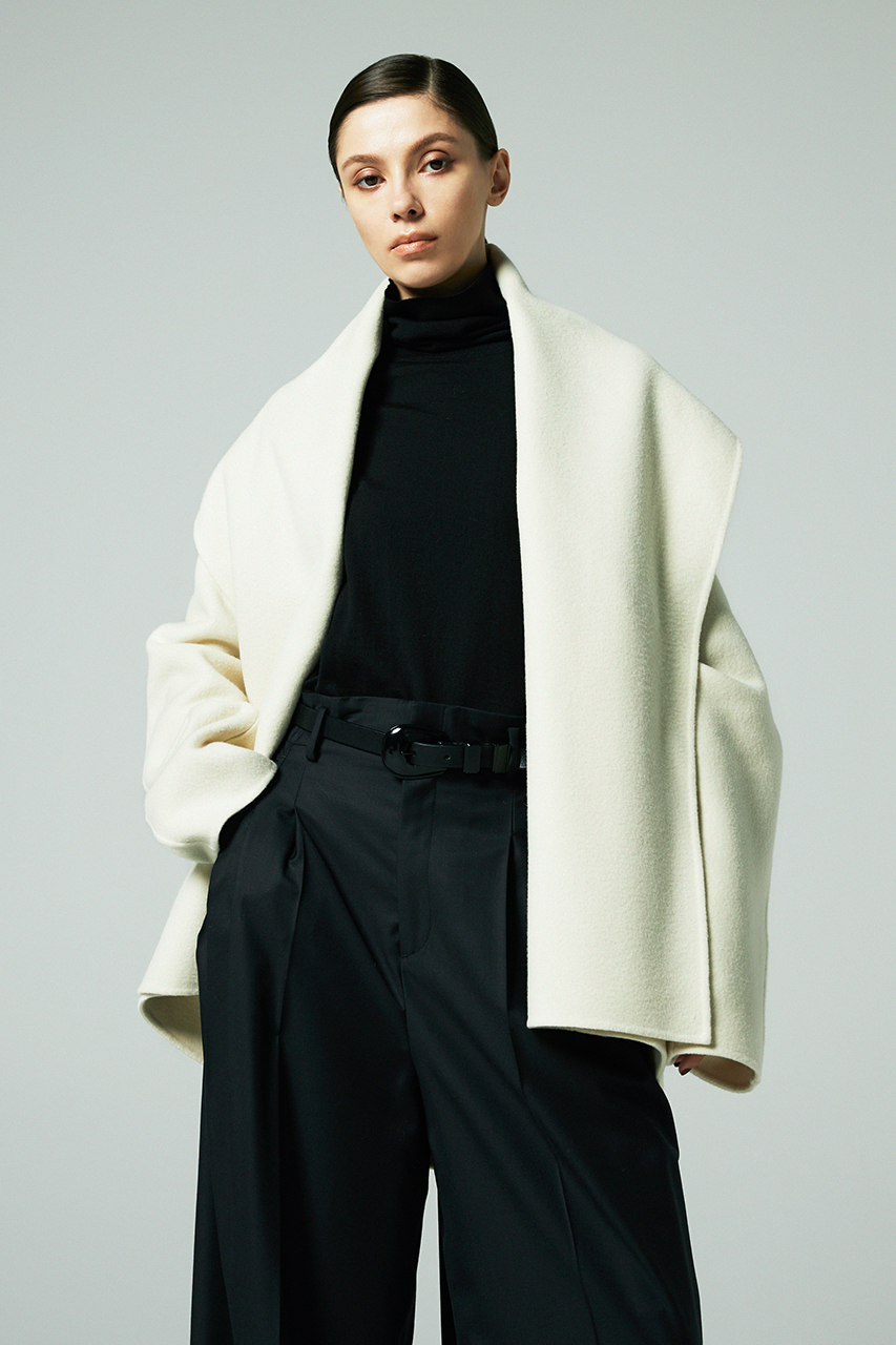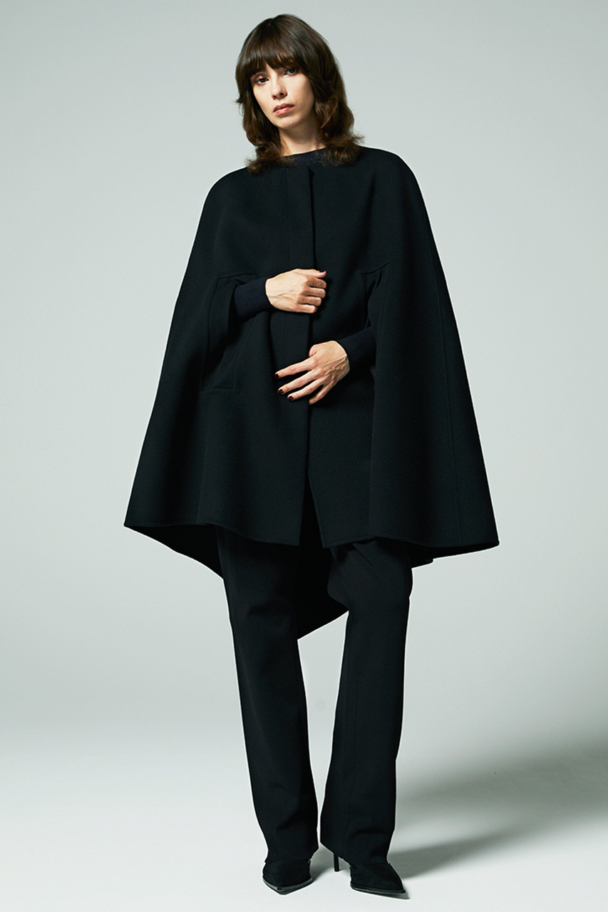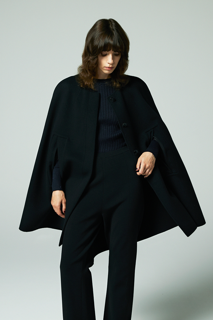 同シリーズの中でも、最もドラマティックな存在感を放つマントコート。肩から流れるようなアシンメトリーのバックフレアと、ハンドスリットのディテールが印象的です。たっぷりとした分量感がありながらも、Super180’sウールならではのしなやかさと軽さで、美しいドレープを描く仕立てに。どんなアイテムの上にも羽織れる汎用性の高さも魅力。シンプルなスタイリングに重ねるだけで、モダンで洗練された印象へと導きます。