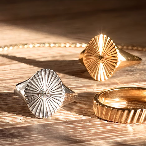UKで超人気、クリエイティブ・ディレクターエスティ・ラロンドがプロデュースしたコレクションから、UKでベストセラーでデザイナー本人もおすすめのサンバースト・コレクションをご紹介。太陽の光を模したサンバーストデザインは、末広がりのモチーフで、幸運を呼び寄せる力があるとされています。細かいグルービングデザインがさりげなく存在感を放ちます。