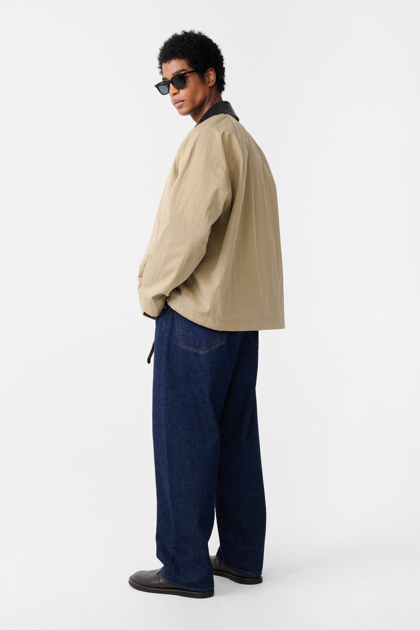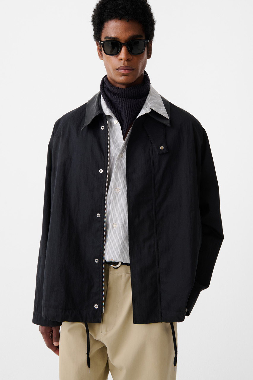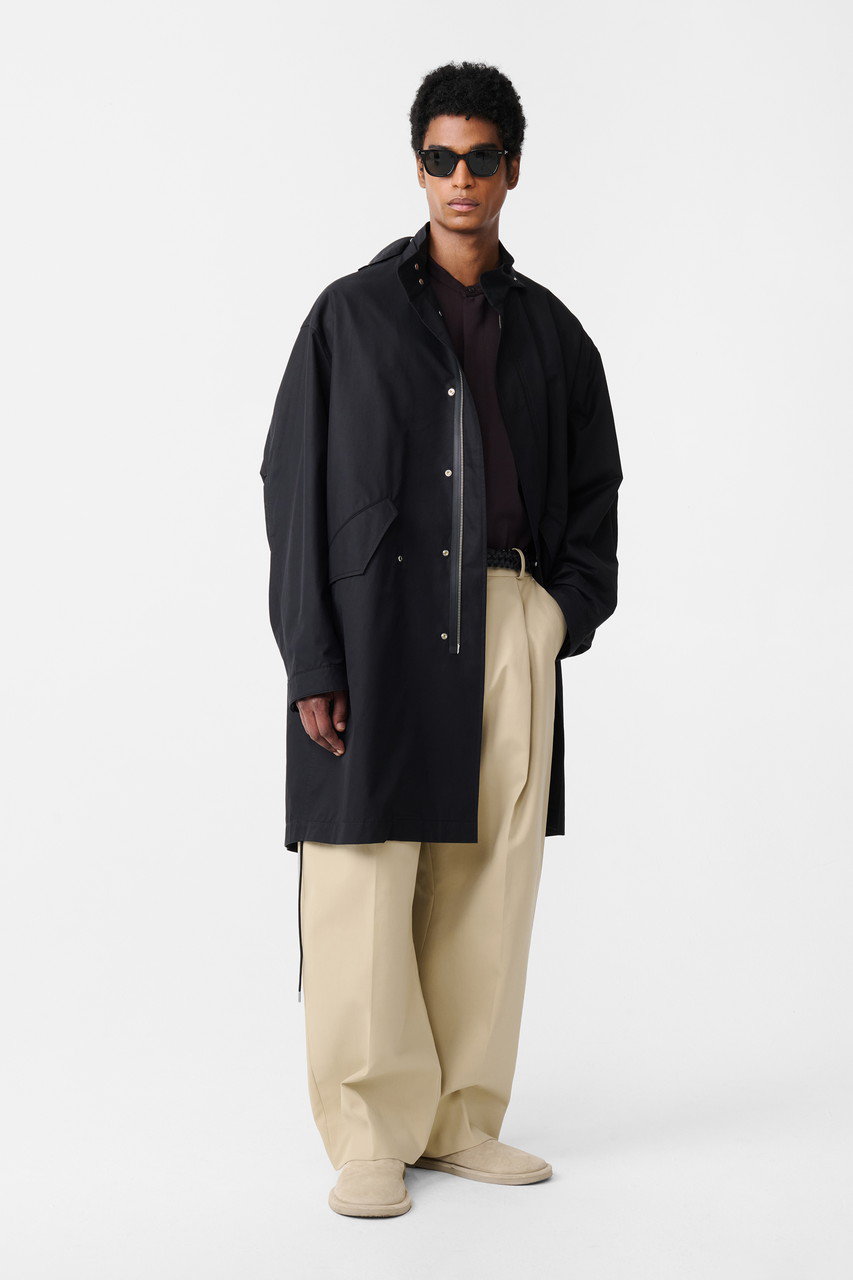 クラシックになりがちなトレンチコートを、モダンに再構築した一着がお目見え。耐久性と撥水性に優れたオーガニックコットンとナイロンのブレンド素材を採用し、洗いをかけることでほどよい色あせ感を演出。ヴィンテージライクな風合いが魅力的。コントラストを効かせたなめらかなレザーの襟もポイント。ストームフラップや裾のドローストリング仕様が風雨を防ぎ、保温性の調整も可能。機能性と洗練されたデザインを兼ね備え、大人の着こなしに活躍すること間違いなし。