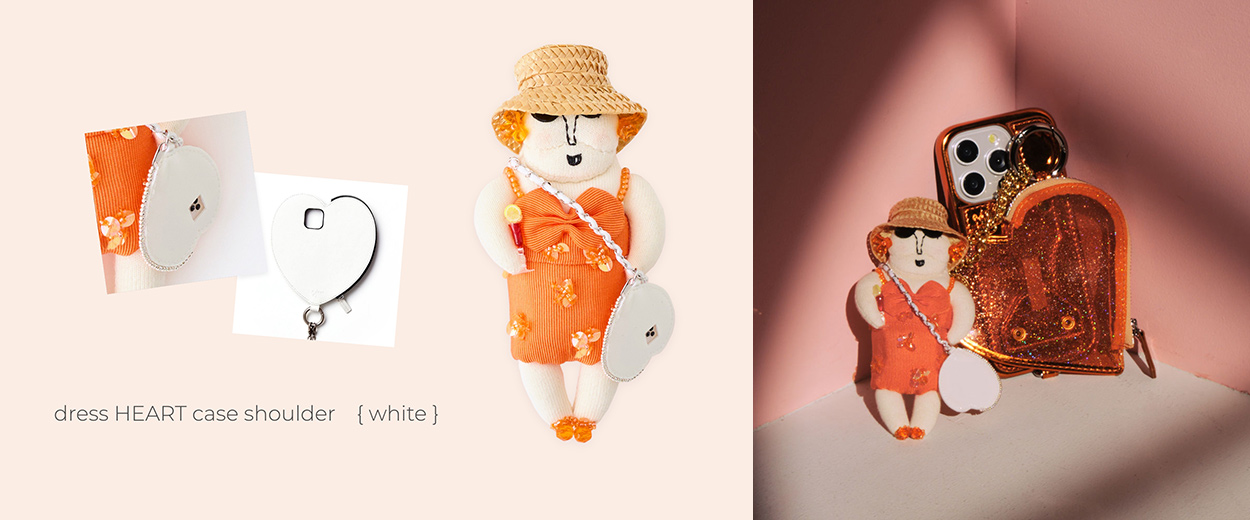 久しぶりに泳ぎに来たわ。太陽の陽射しに負けないようにオレンジのスイムウェアとストローハットを選んでみたの。大きな白いハートは移動中にも便利な携帯ケース。バカンスの舞台でも目立つこと間違いなしね!