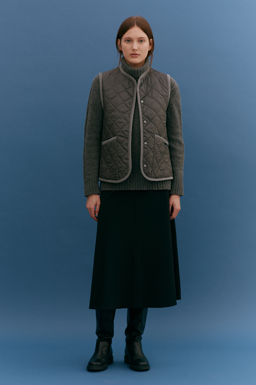 後ろ身頃にかけて緩やかなカーブを描くコクーンシルエットが、柔らかな印象を与えるノーカラーレイヤードジレ。軽量でコンパクトな中綿を使用し、かさばらず保温性にも優れています。ニットやシャツの上にさらりと羽織れるデザインで、季節の変わり目や穏やかな日のお出かけに最適。