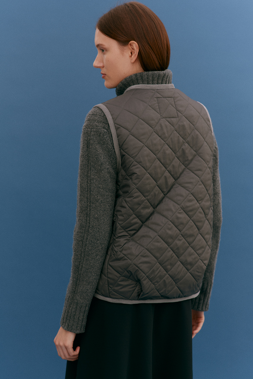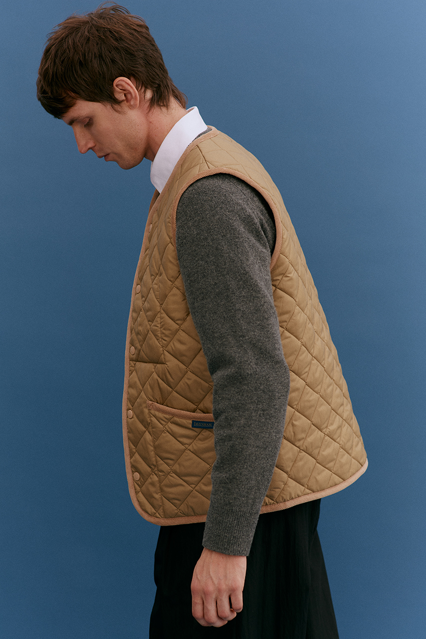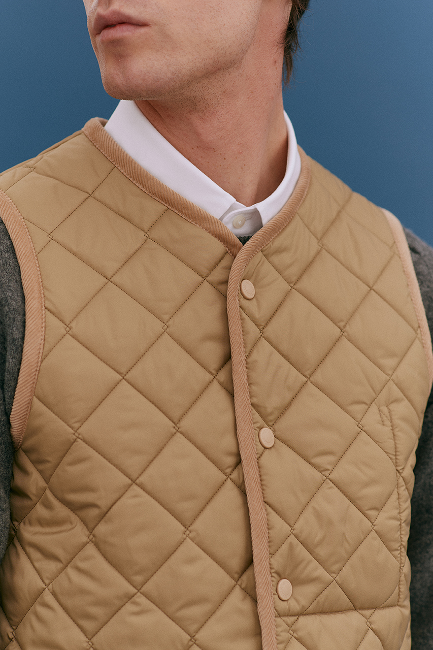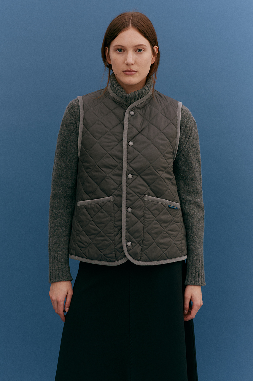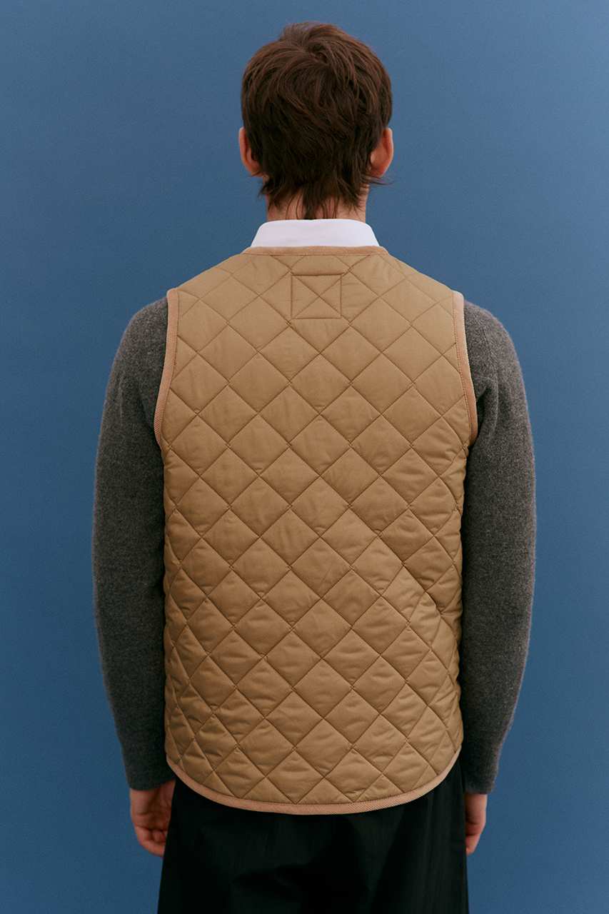 タウンユースにも馴染む現代的なデザインが魅力の、レギュラーフィットのキルティングジレ。襟を省いたカラーレス仕様で、シャツやニットとのレイヤードがしやすく、季節やシーンに応じて幅広いスタイリングが楽しめます。インナーとしても、軽めのアウターとしても活躍する汎用性の高さがポイントです。