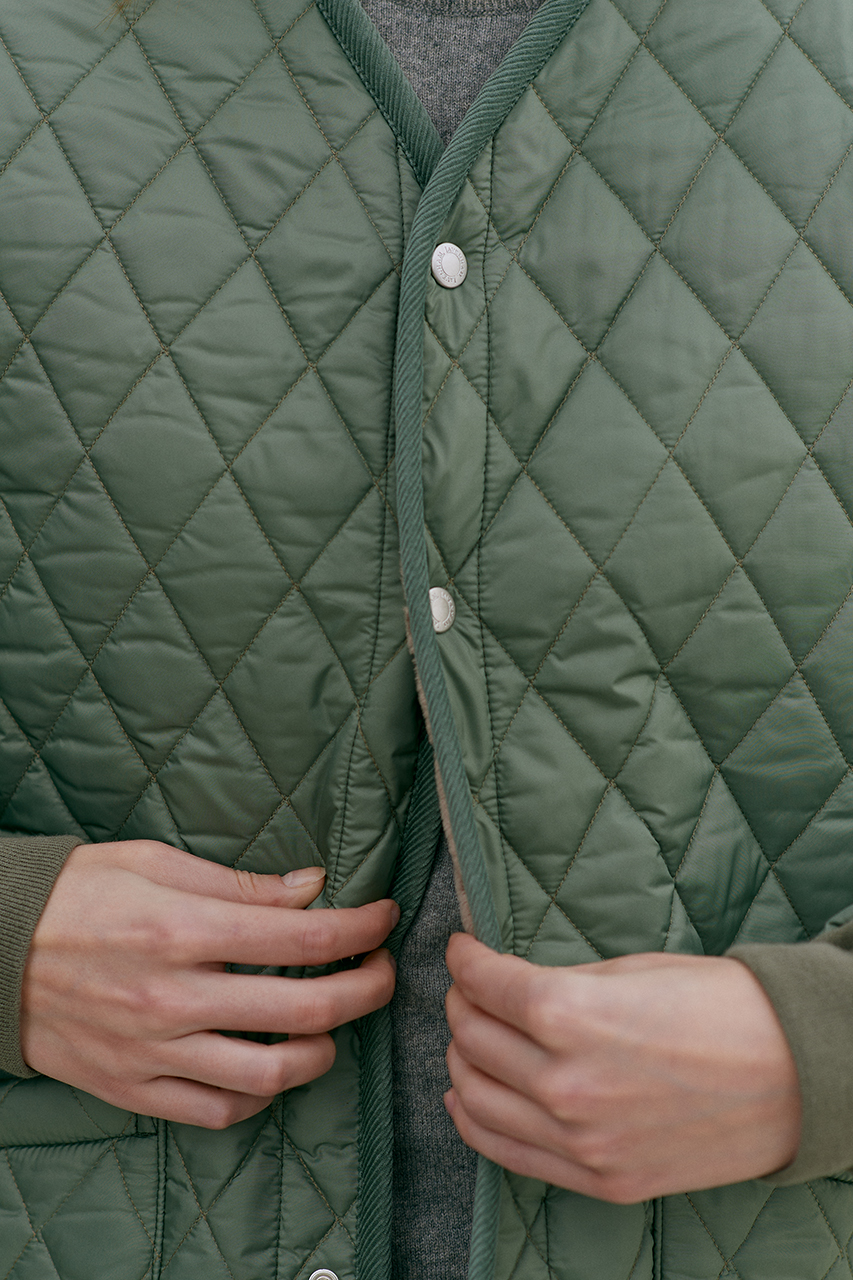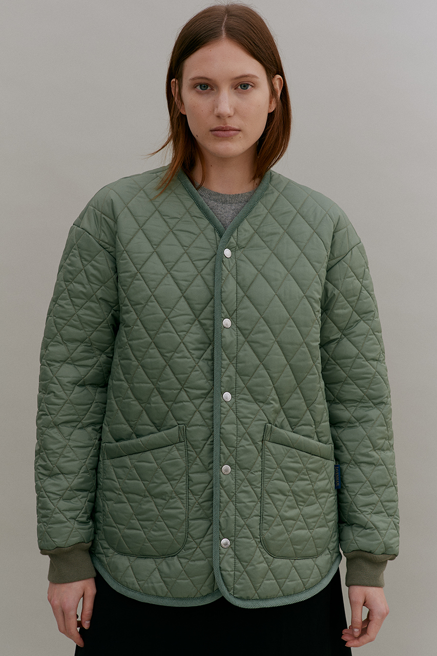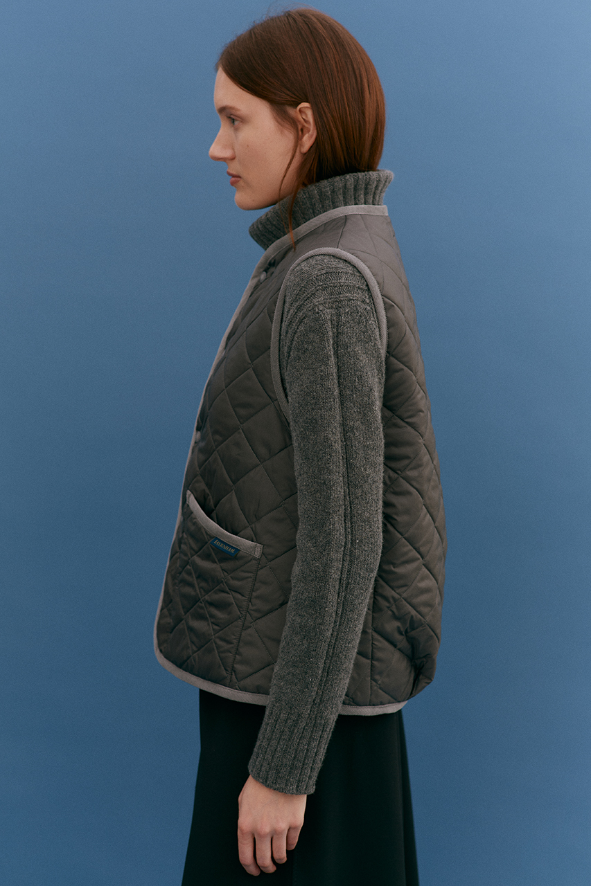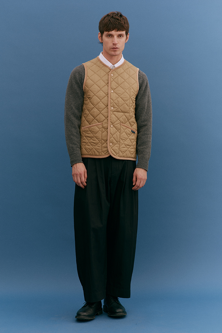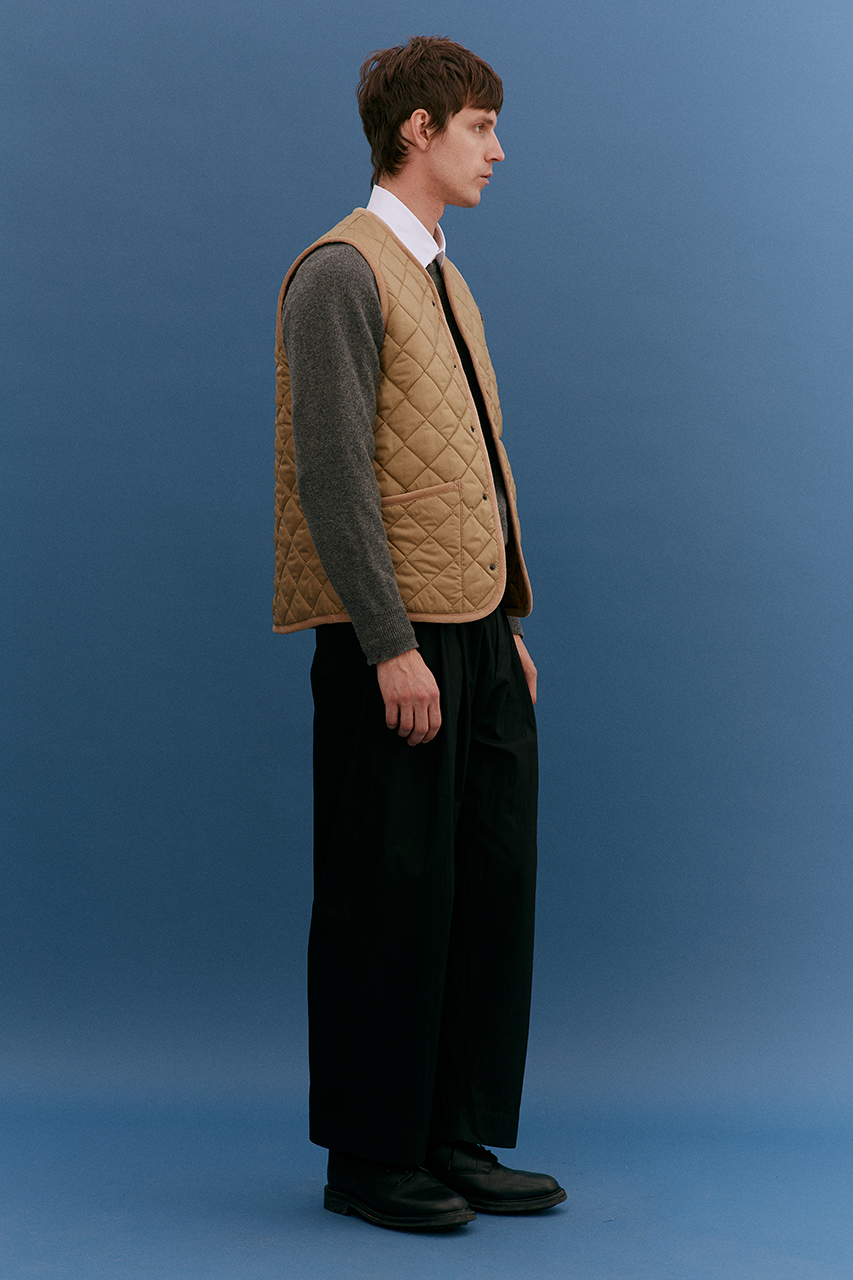 タウンユースにも馴染む現代的なデザインが魅力の、レギュラーフィットのキルティングジレ。襟を省いたカラーレス仕様で、シャツやニットとのレイヤードがしやすく、季節やシーンに応じて幅広いスタイリングが楽しめます。インナーとしても、軽めのアウターとしても活躍する汎用性の高さがポイントです。