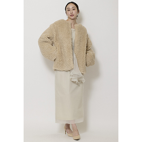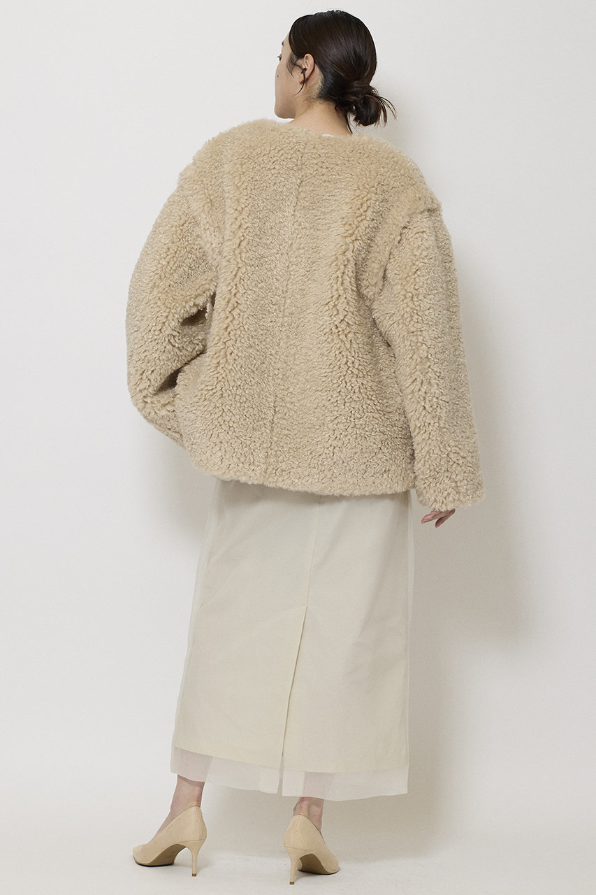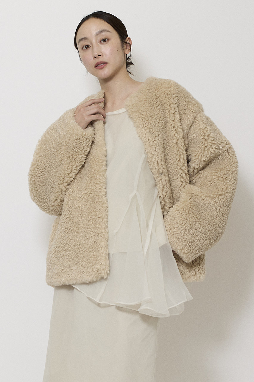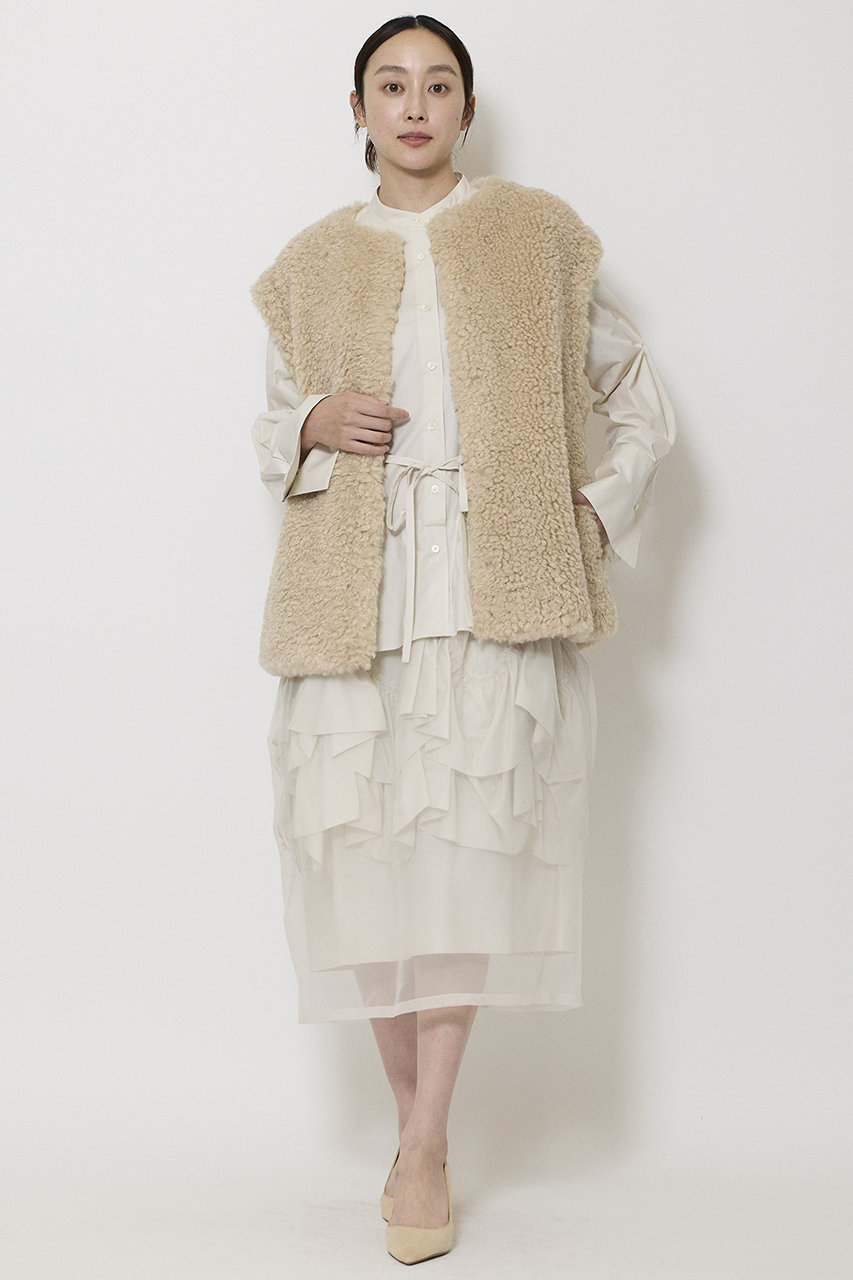 リサイクルポリエステルを使用したフェイクシープファーコート。毛足が長くなめらかな手触りとエアリーな着心地はノーストレスで羽織れる一着。袖を取り外してベストとしても使える2WAY仕様で長いシーズン着用可能。内側にもポケットを配し、機能性もアップ。ホリデーシーズンの華やかな装いにもマッチします。