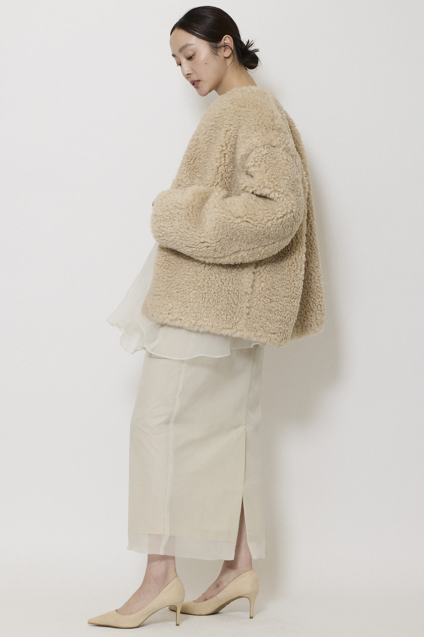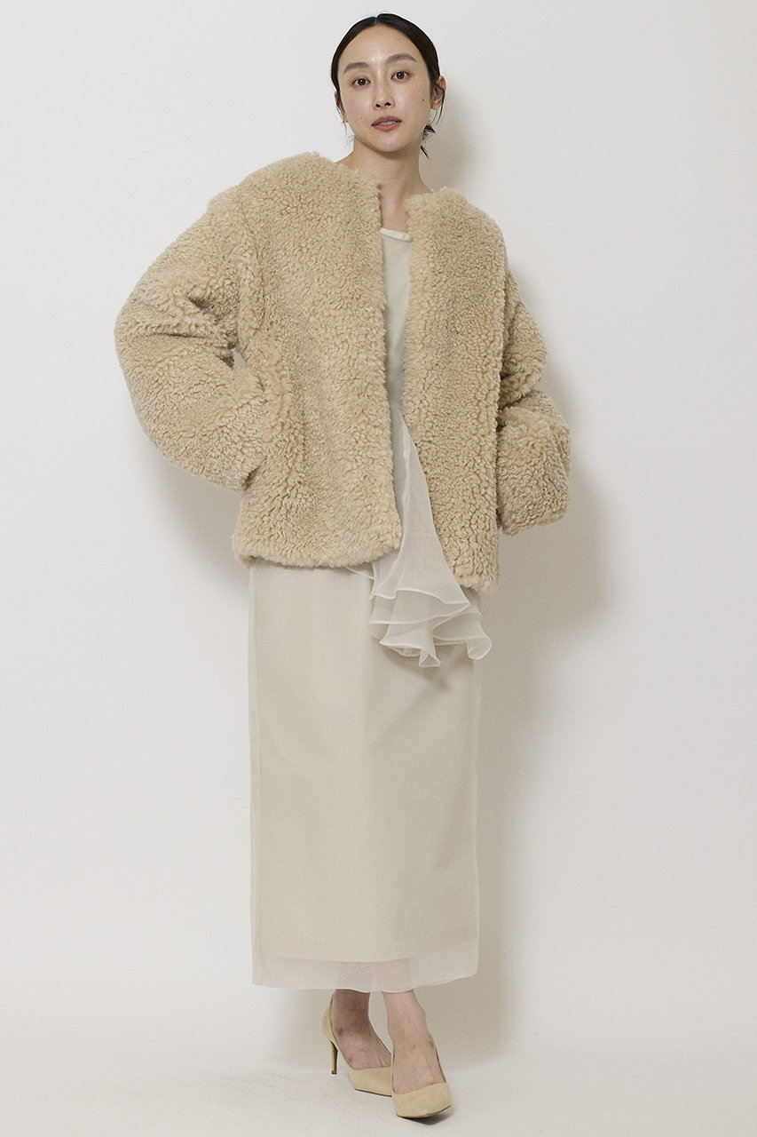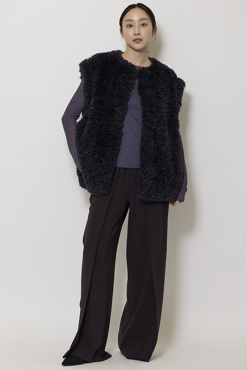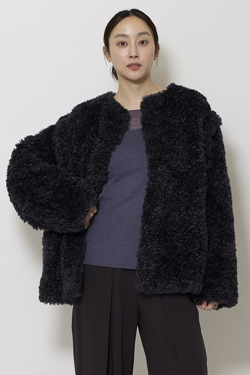 リサイクルポリエステルを使用したフェイクシープファーコート。毛足が長くなめらかな手触りとエアリーな着心地はノーストレスで羽織れる一着。袖を取り外してベストとしても使える2WAY仕様で長いシーズン着用可能。内側にもポケットを配し、機能性もアップ。ホリデーシーズンの華やかな装いにもマッチします。