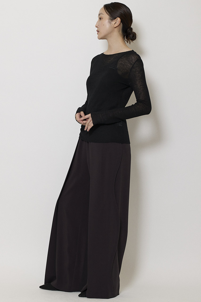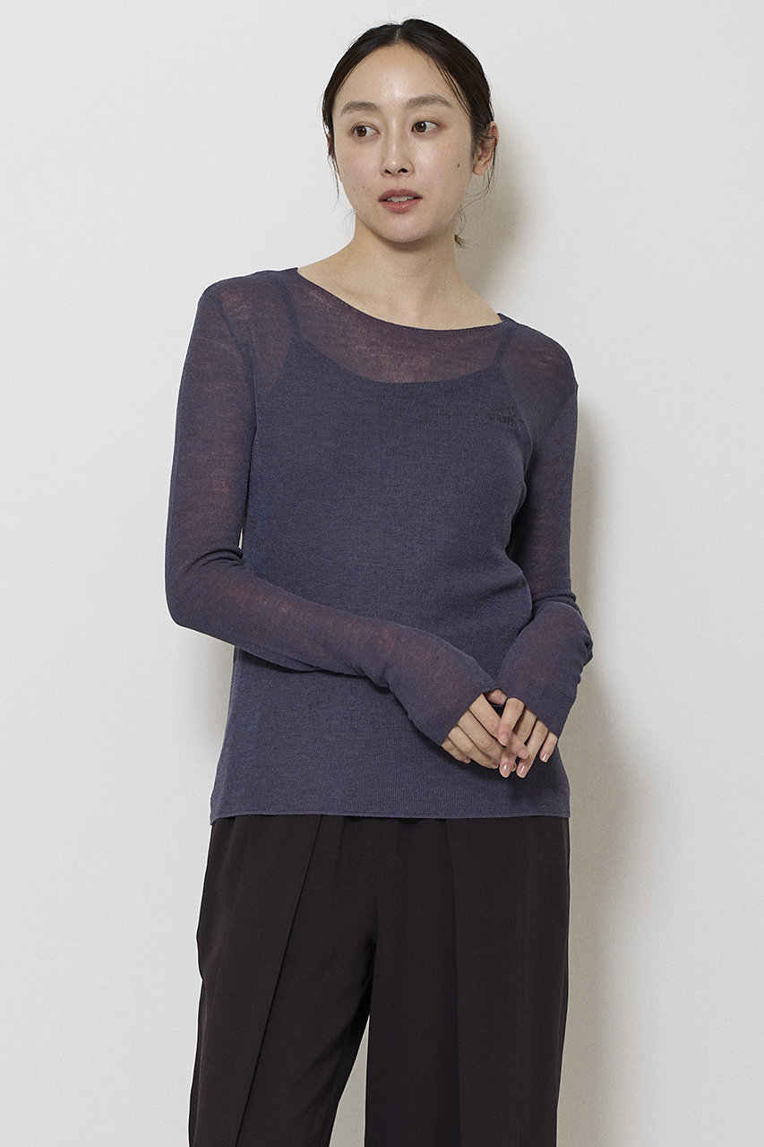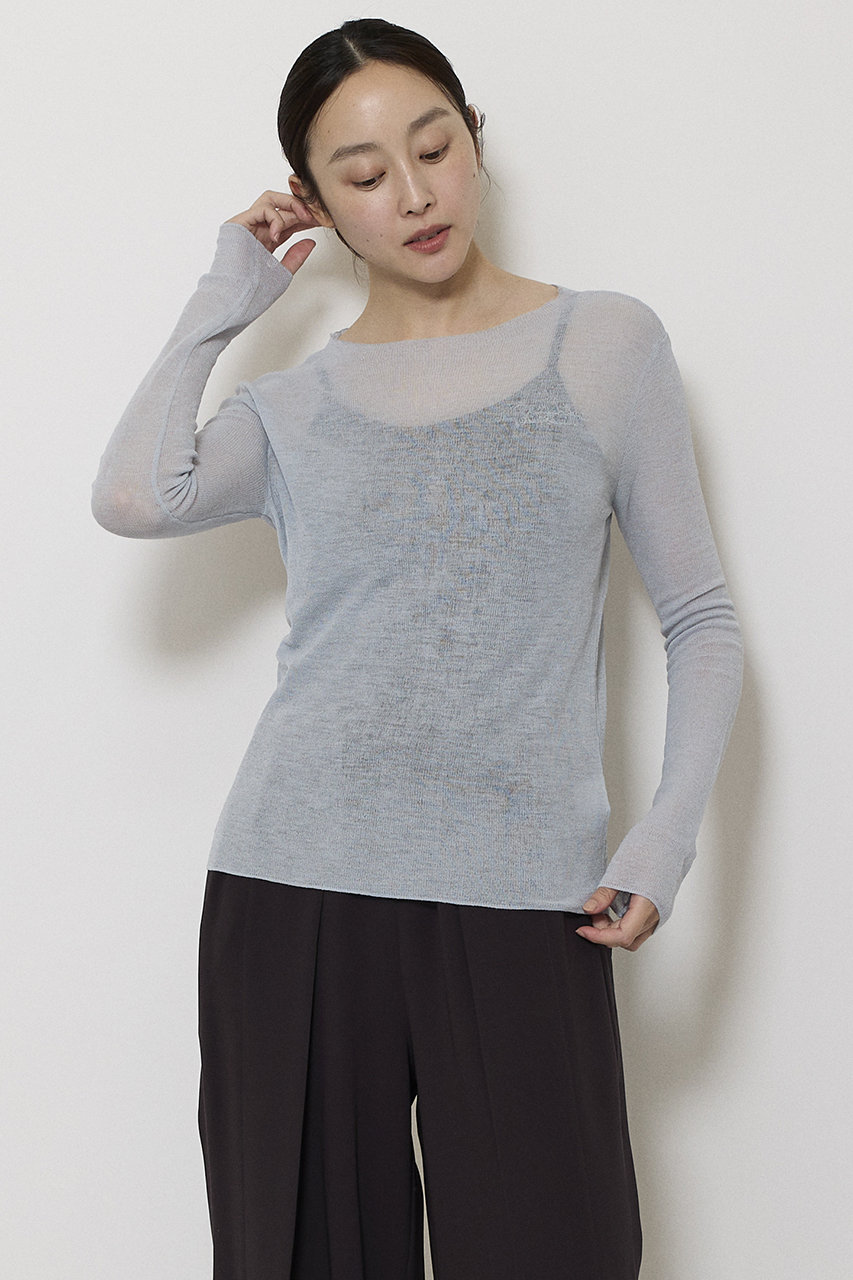 エアリーな着心地にこだわったシアーニットプルオーバー。ほのかにシャリ味のあるさらっとした肌触りながら、ウール混のふっくらとした弾力もある素材は、ノーストレスで3シーズン着用可能。胸元にはマダム ミラ・ショーン自筆のサインをトレースした刺しゅうがポイントに。合わせやすいカラートーンで、どんなボトムスにもマッチするので1着持っておきたい。