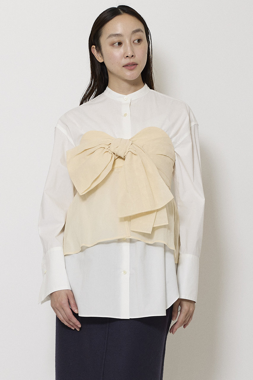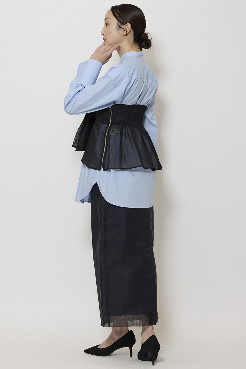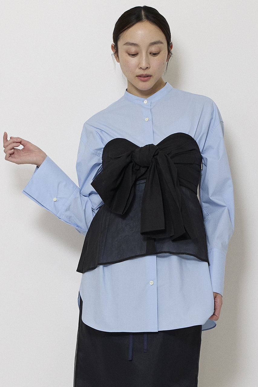 コットンオーガンジーをワンウォッシュすることで、こなれ感のある風合いに仕上げ片リボンビスチェ。適度なシワ感が甘口になり過ぎない仕上がりに。背面はシャーリングゴムでしっかりとホールドされ、着用感も◎。ニットやTシャツなどと合わせた、レイヤードスタイルも楽しめるアイテム。