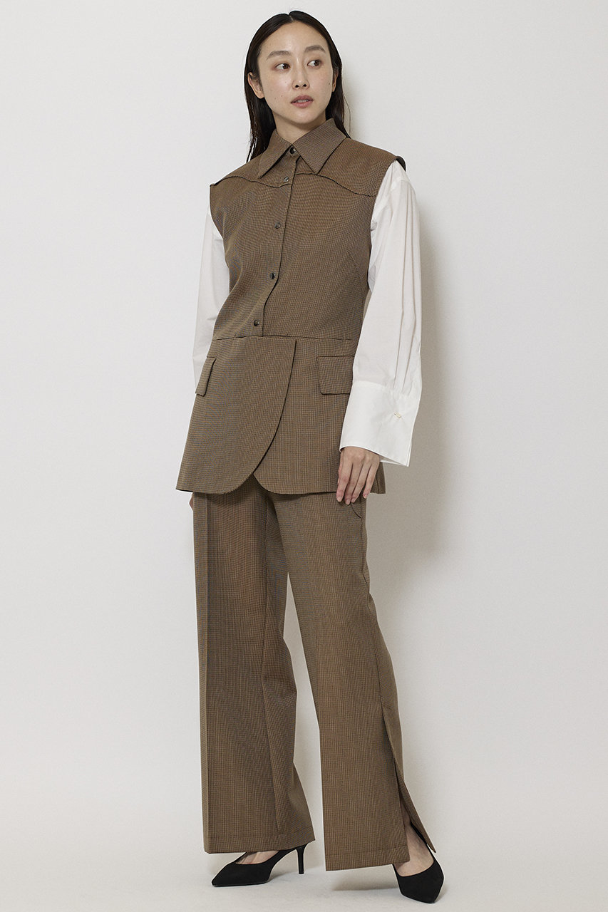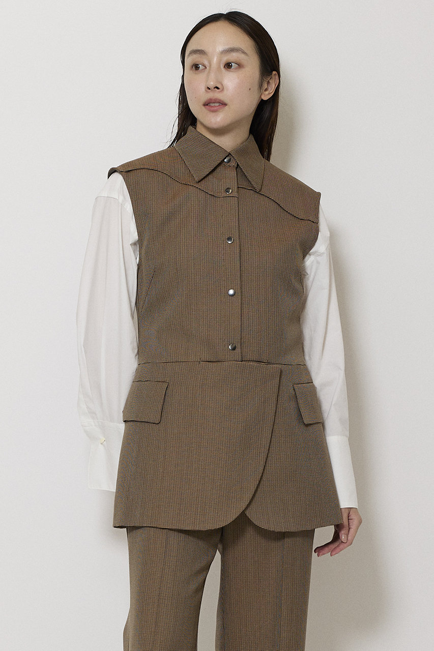 メンズライクなウール混素材を使用した細やかなチェックのノースリーブジャケット。70年代のアートやカルチャーをイメージさせる大き目の襟、美しい曲線の切り替えがポイント。シンプルなシャツやタートルネックと重ねれば季節の変わり目にも活躍し、レイヤード次第でロングシーズン楽しめそう。ストレートパンツとのセットアップなら、忙しい朝でも簡単に洗練されたスタイリングが叶うのでおすすめ。