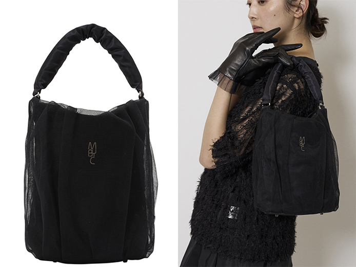 軽く光沢のあるナイロン地の上に、チュールでエアリーなタックを重ねたコンパクトなバッグ 。綿の入った持ち手は見た目にもかわいらしく持ちやすいデザインに。レイヤードごしに見えるロゴがアクセントをプラス。十分なマチと底の金具で安定するので、普段使いはもちろん、特別なシーンにもおすすめのアイテム。