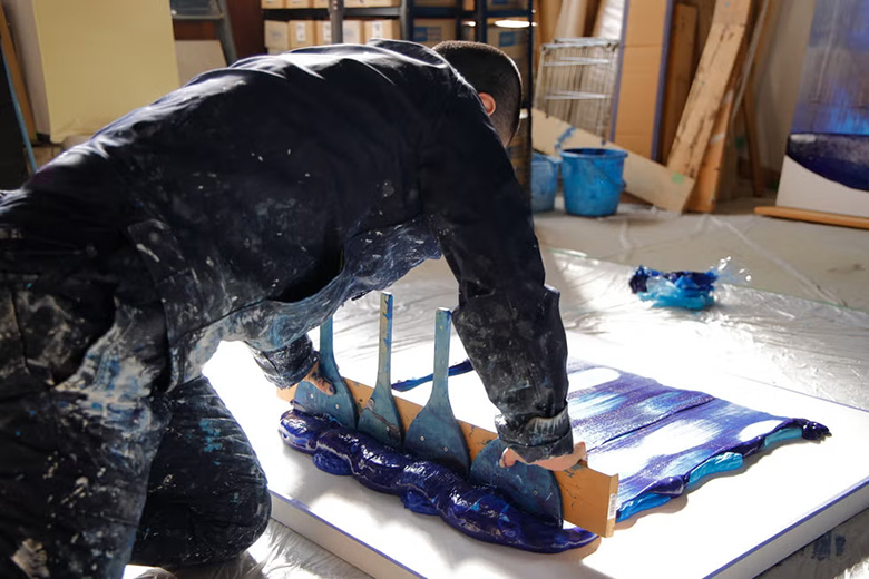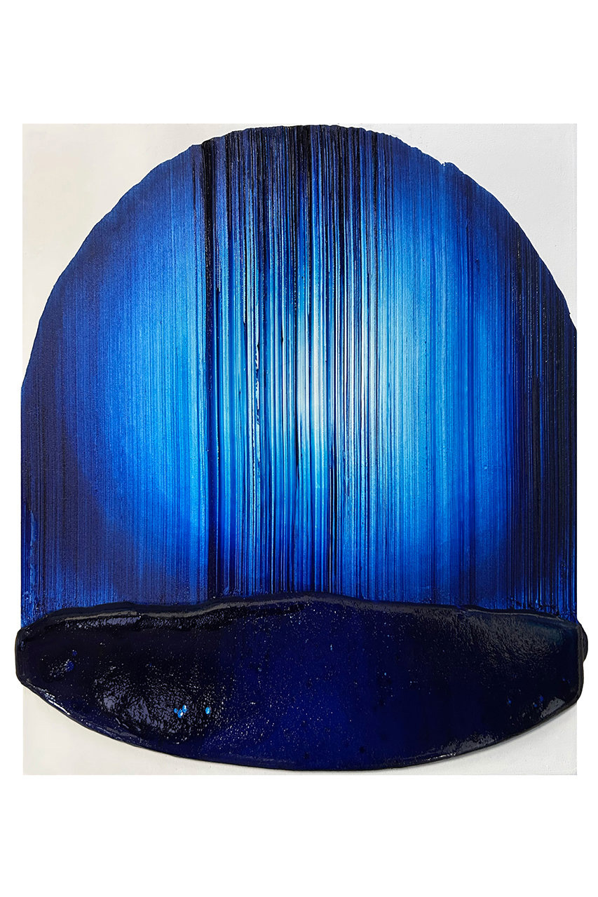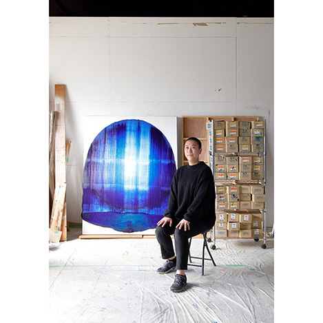 大学院の修了展で一気にアート界を驚かせ、そのまま台湾や韓国をはじめアジア全域でコレクターを魅了し続けている香月美菜さん。描くのは常に青だけで力強く描かれたミニマルな世界。「絵の具」そのものを見せることをテーマに、ひと筆描きで作品を生み出す。それは禅を思わせる東洋的な世界でもある。
