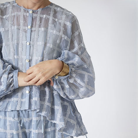 “fluffy ”のテキスタイルは、リボンテープのような刺繍が印象的。柄の間を手作業でひとつひとつカットし、水通しで毛先にふわっとした動きをプラス。風に揺れるような軽やかなデザインに。ハサミのモチーフ刺繍もさりげなくポイントです。