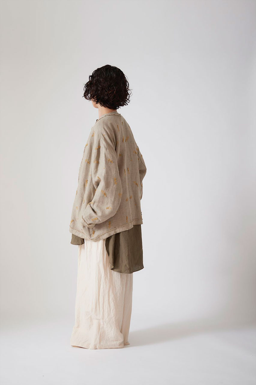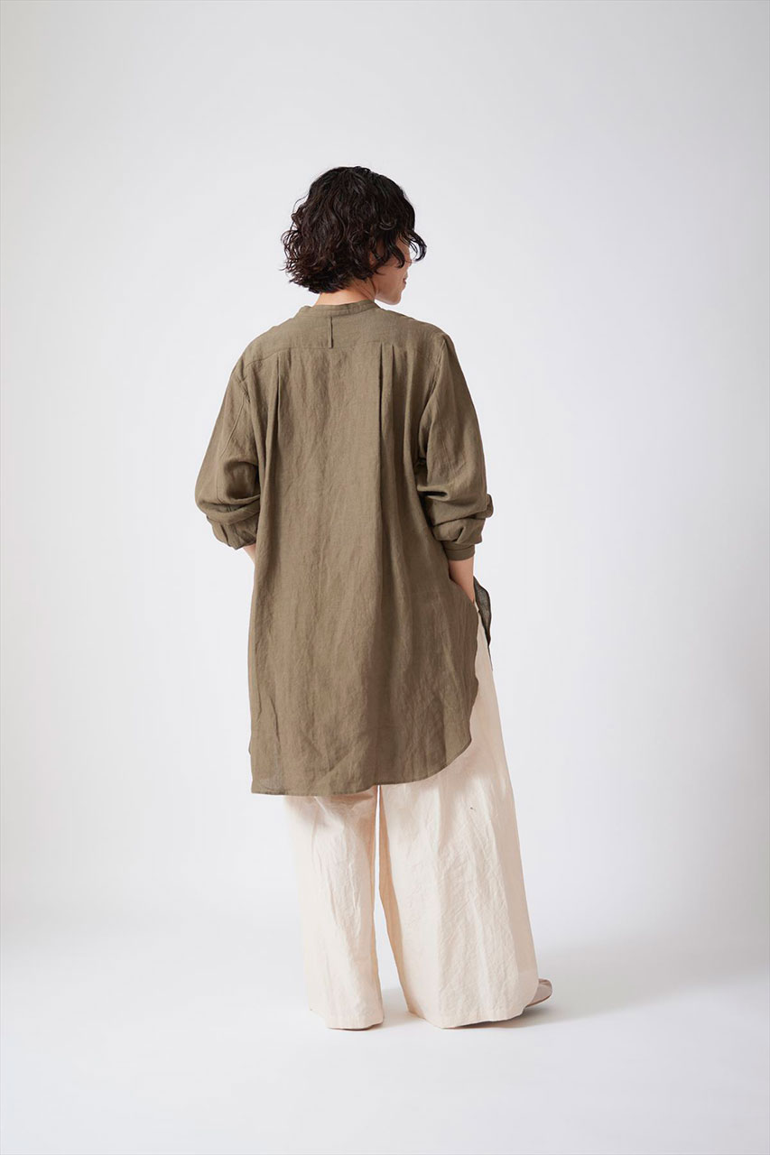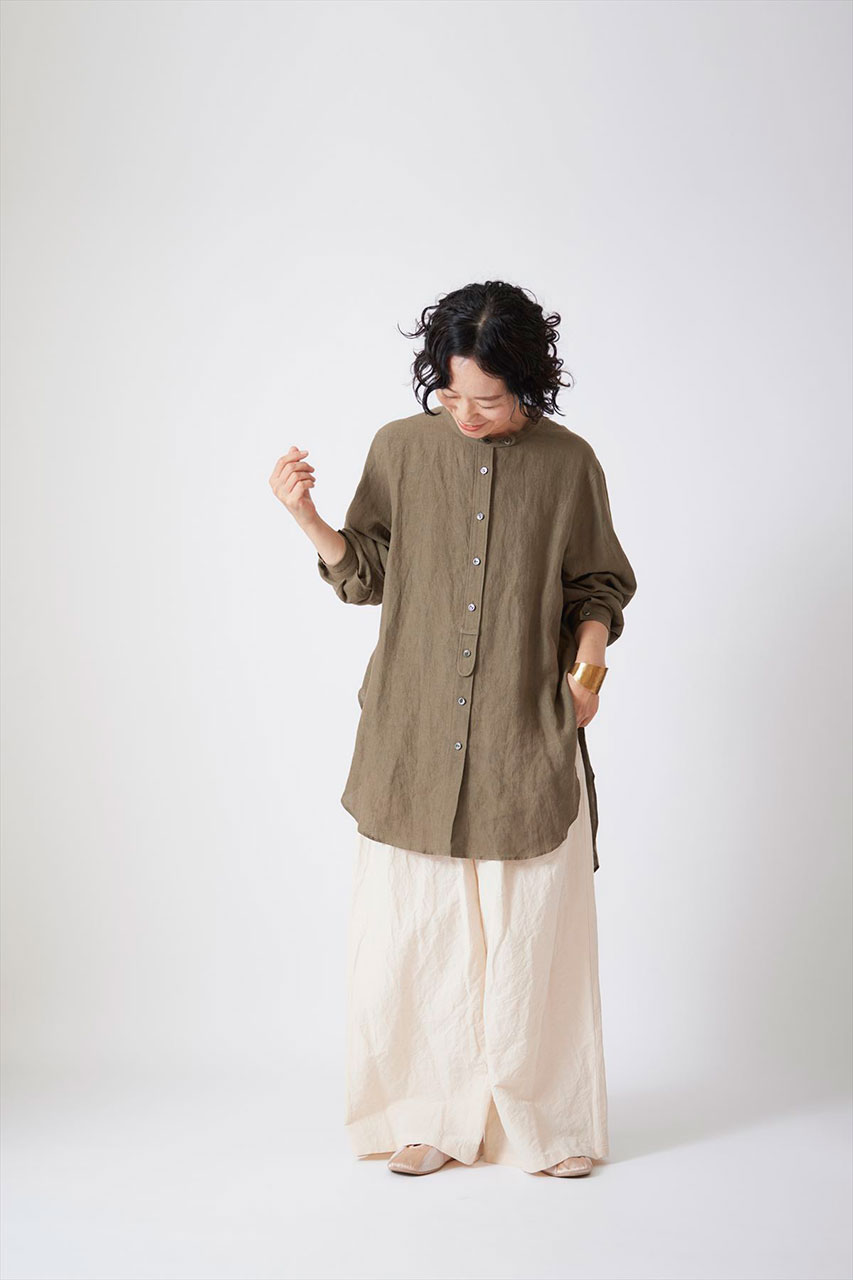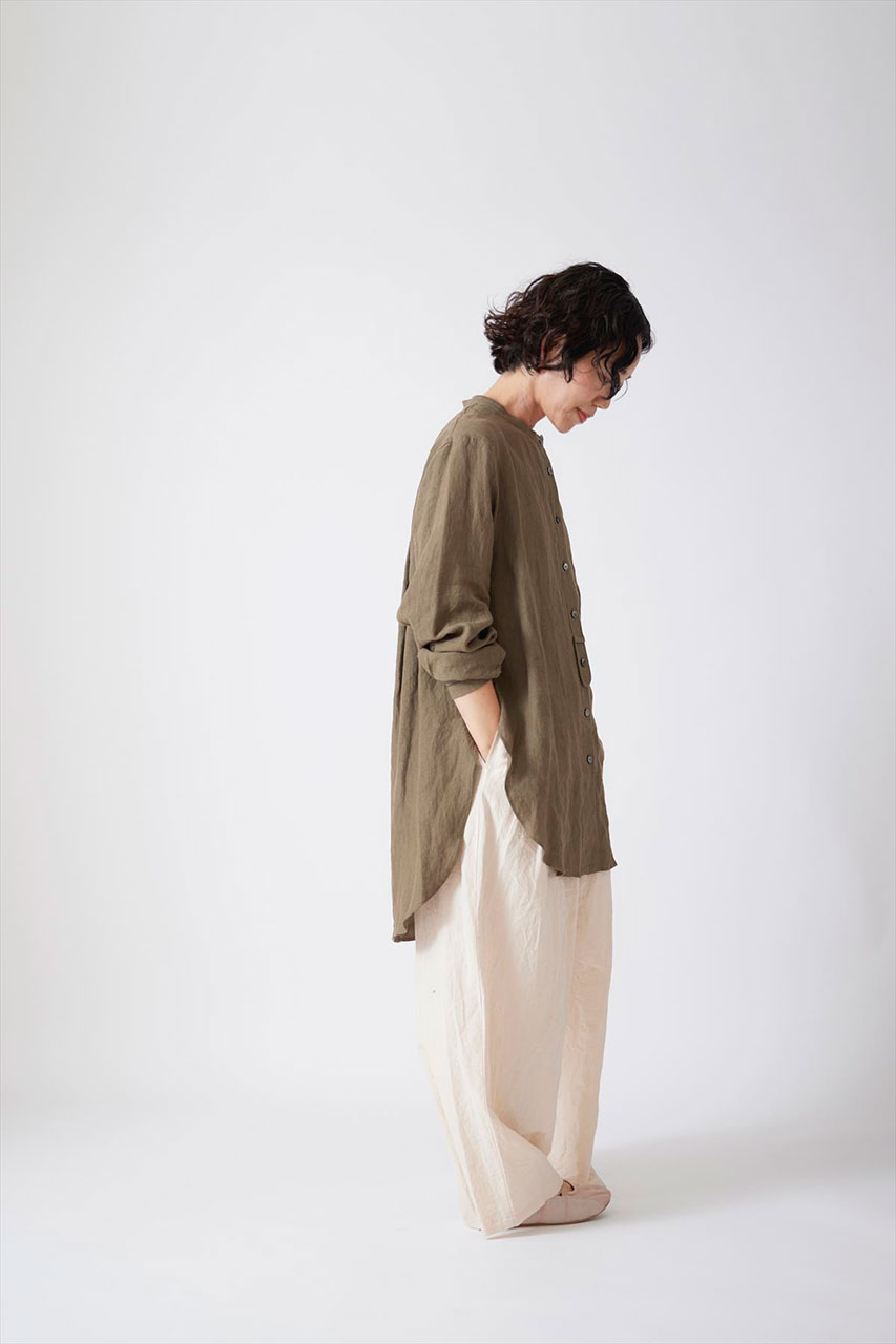 こちらのヘンプ素材は浜松で丁寧に生産。染色後は自然の風でじっくり乾燥させることで、糸がふっくらとふくらみ、ドライな肌触りと涼やかな風合いに。洗いざらしのようなシワ感も魅力です。ブラウスとパンツのセットアップスタイルもおすすめ。