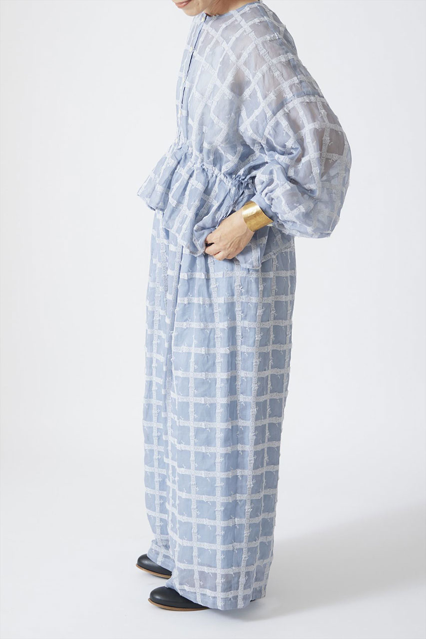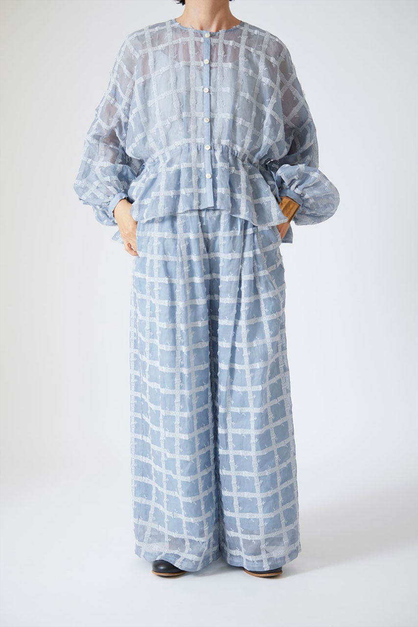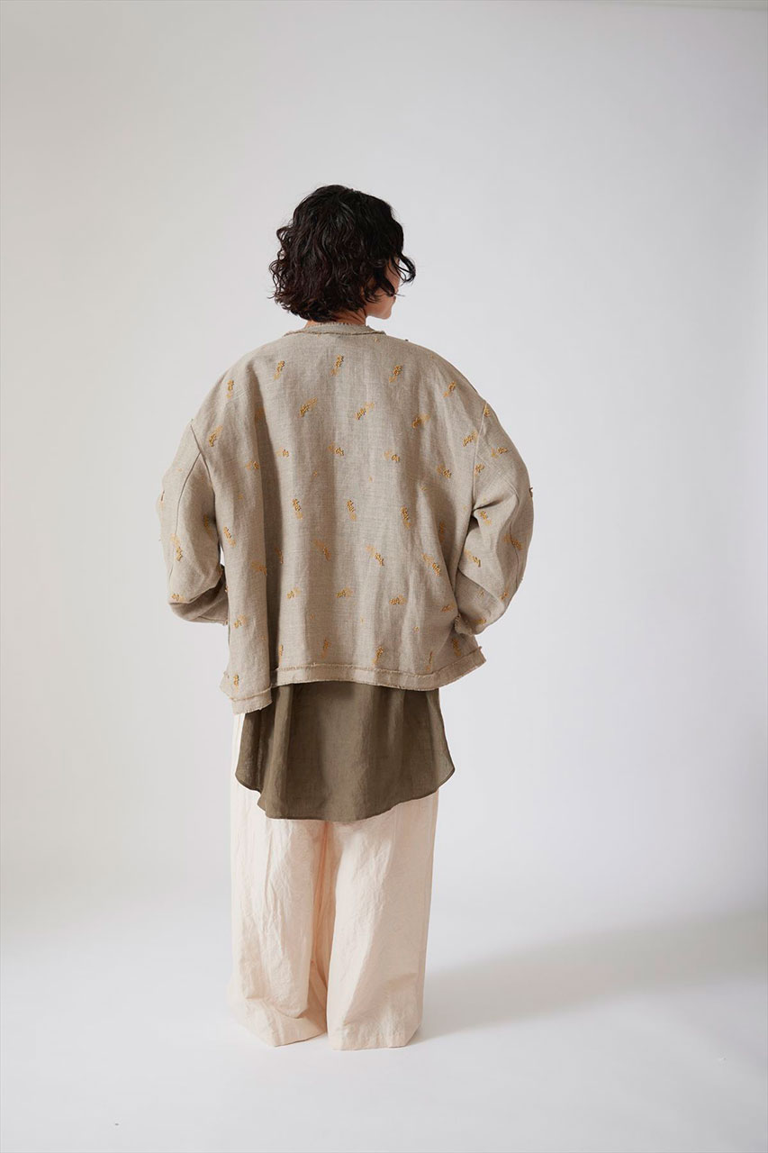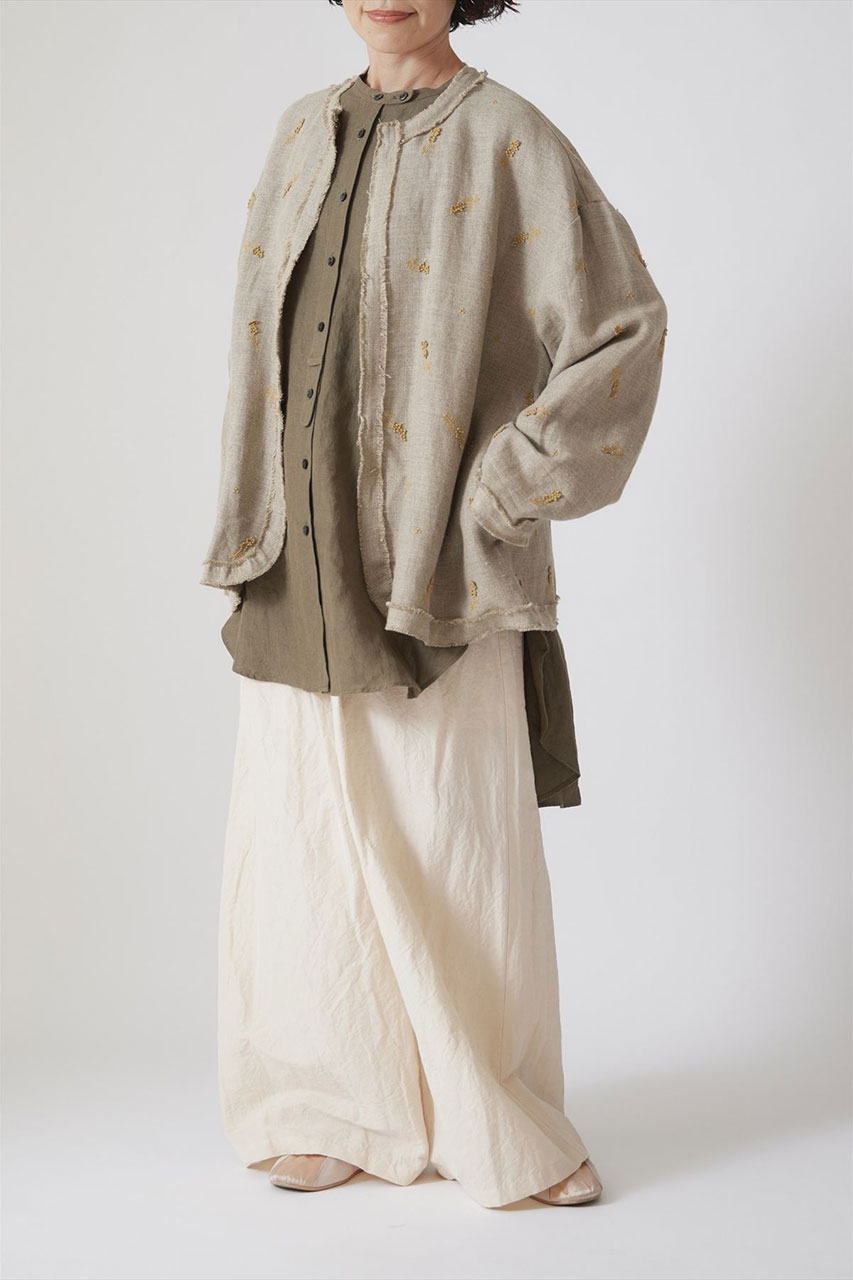 こちらのヘンプ素材は浜松で丁寧に生産。染色後は自然の風でじっくり乾燥させることで、糸がふっくらとふくらみ、ドライな肌触りと涼やかな風合いに。洗いざらしのようなシワ感も魅力です。ブラウスとパンツのセットアップスタイルもおすすめ。