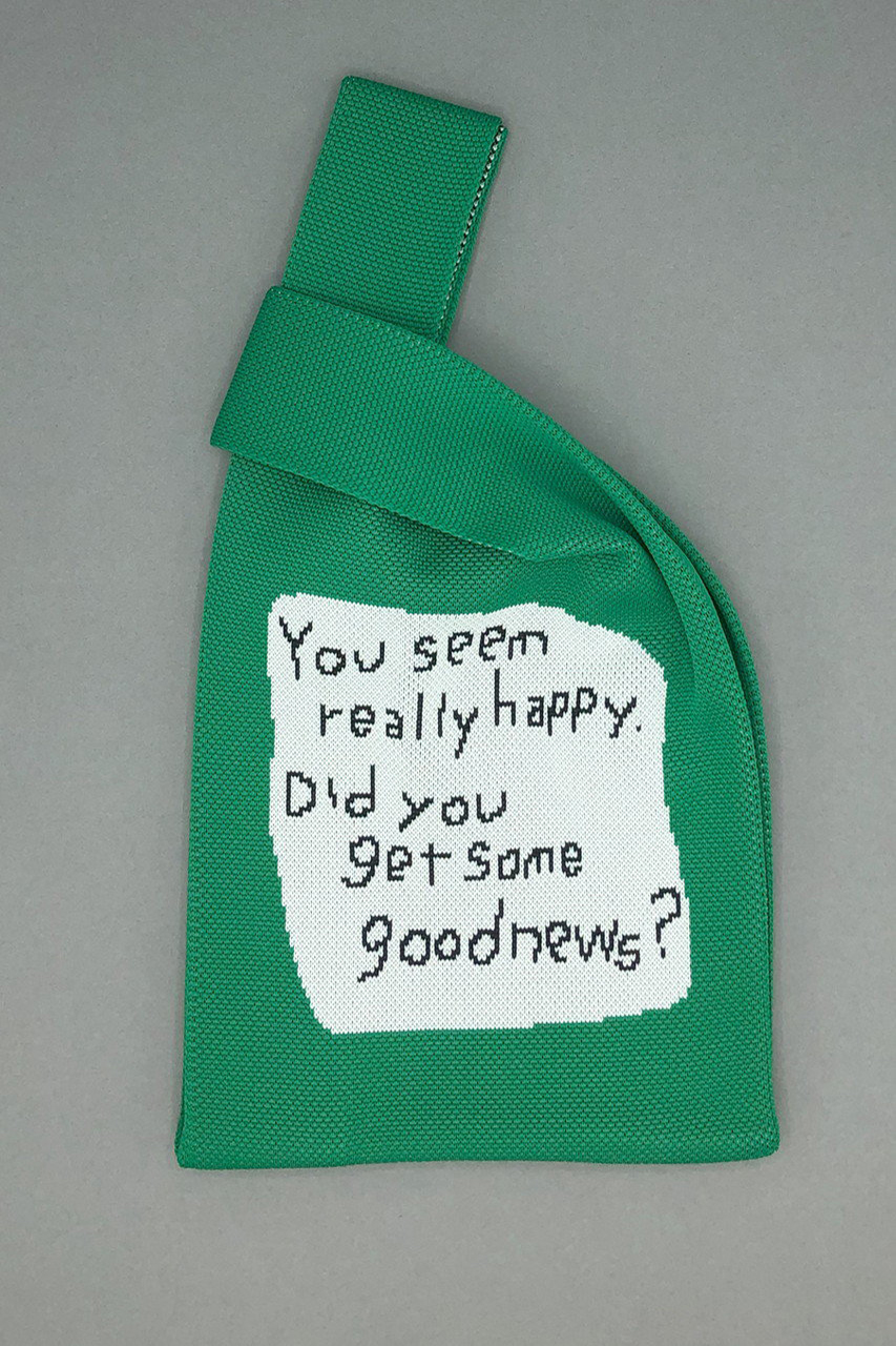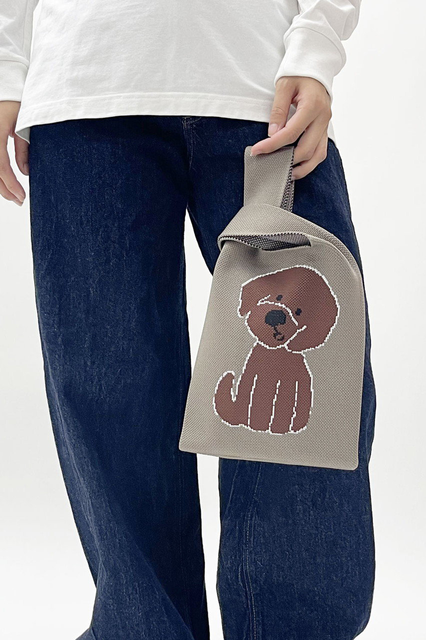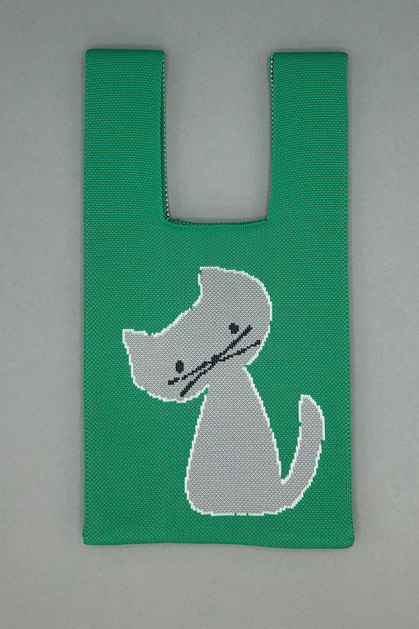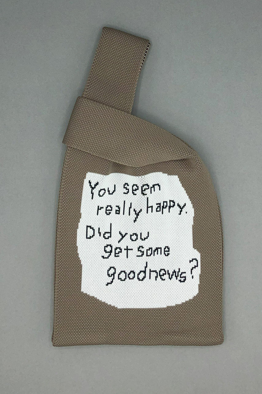 絵本作家・イラストレーター北村人さんの作品を再現したニットミニマルシェバッグ。首を傾げたアニマルのイラストと「You seem really happy. Did you get some news?」の文字が両面に配されたダブルフェイス仕様です。ハイゲージで緻密に編み立てられた軽やかなニットは、クラフト感ある編み目も魅力。スマホや500mlボトルが収まるミニサイズで、荷物が少ないお出掛けに最適です。小物を入れるとふっくらと丸みを帯び、小さなぬいぐるみのような愛らしさに。マチを10cm設けて実用性も高く、持ち手を片方に掛けてくしゅっと持つのもおすすめ。気軽にアートを楽しめ、ギフトにもぴったりです。