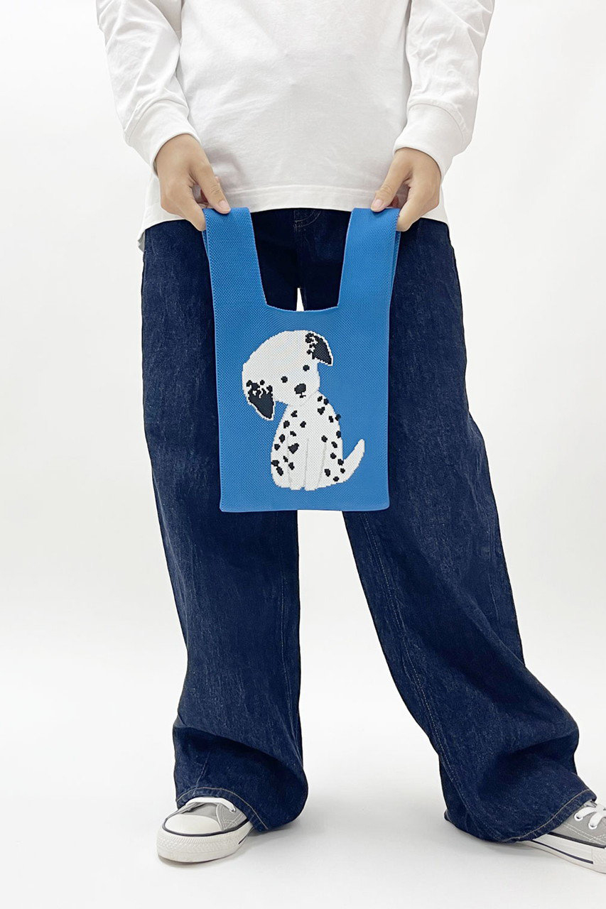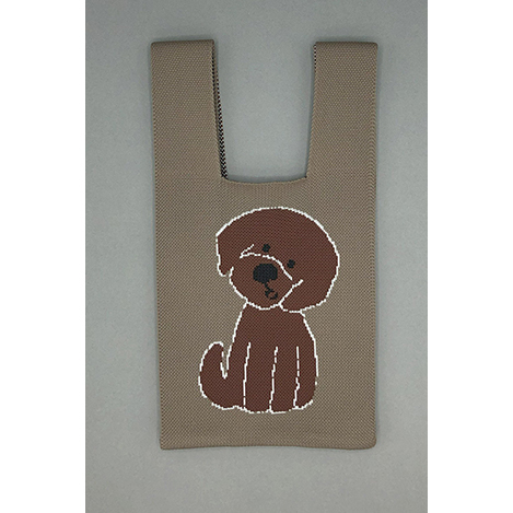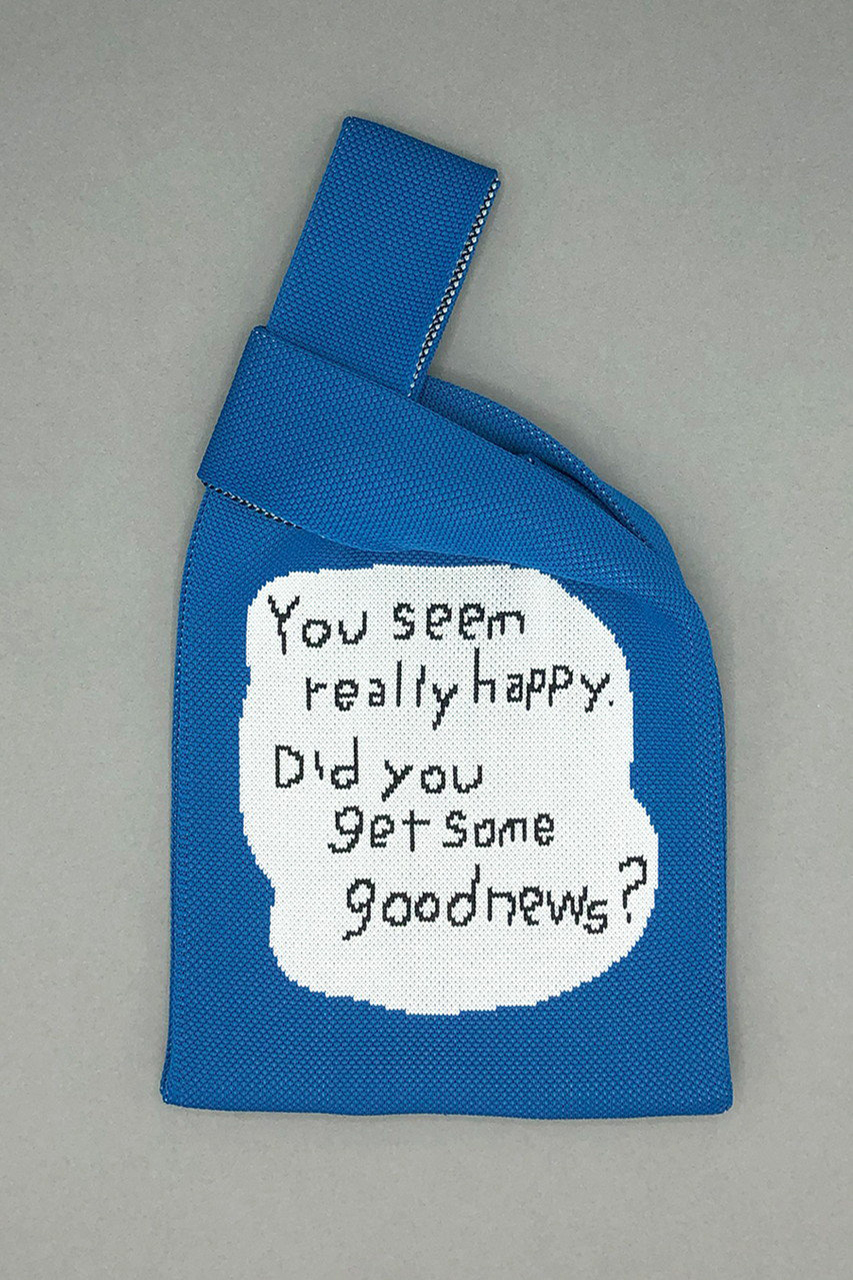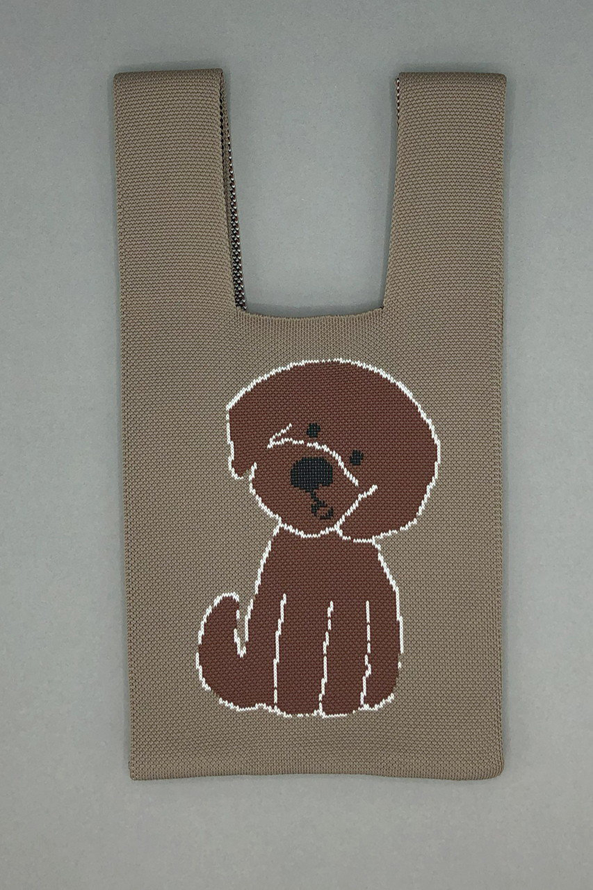 絵本作家・イラストレーター北村人さんの作品を再現したニットミニマルシェバッグ。首を傾げたアニマルのイラストと「You seem really happy. Did you get some news?」の文字が両面に配されたダブルフェイス仕様です。ハイゲージで緻密に編み立てられた軽やかなニットは、クラフト感ある編み目も魅力。スマホや500mlボトルが収まるミニサイズで、荷物が少ないお出掛けに最適です。小物を入れるとふっくらと丸みを帯び、小さなぬいぐるみのような愛らしさに。マチを10cm設けて実用性も高く、持ち手を片方に掛けてくしゅっと持つのもおすすめ。気軽にアートを楽しめ、ギフトにもぴったりです。