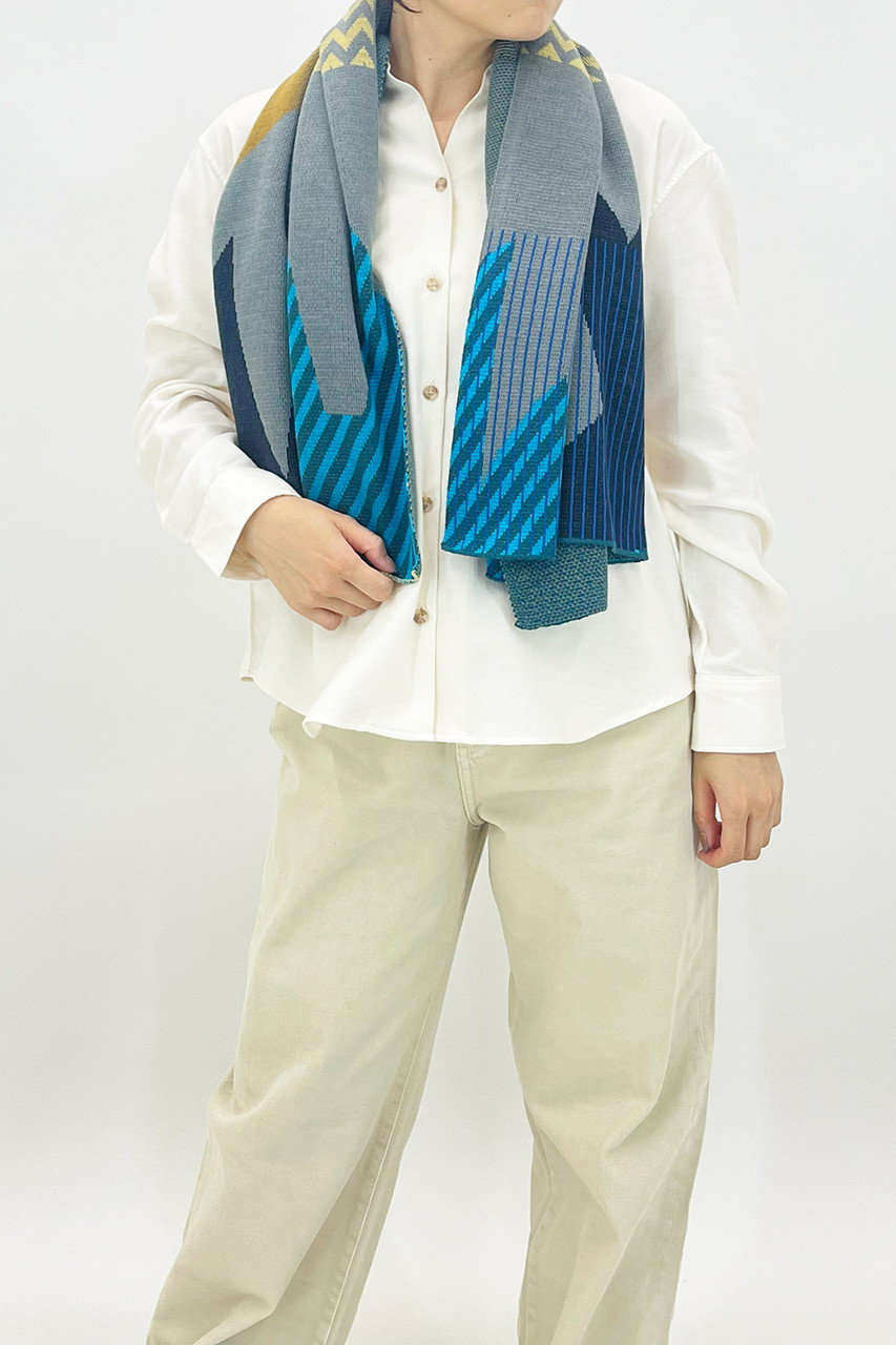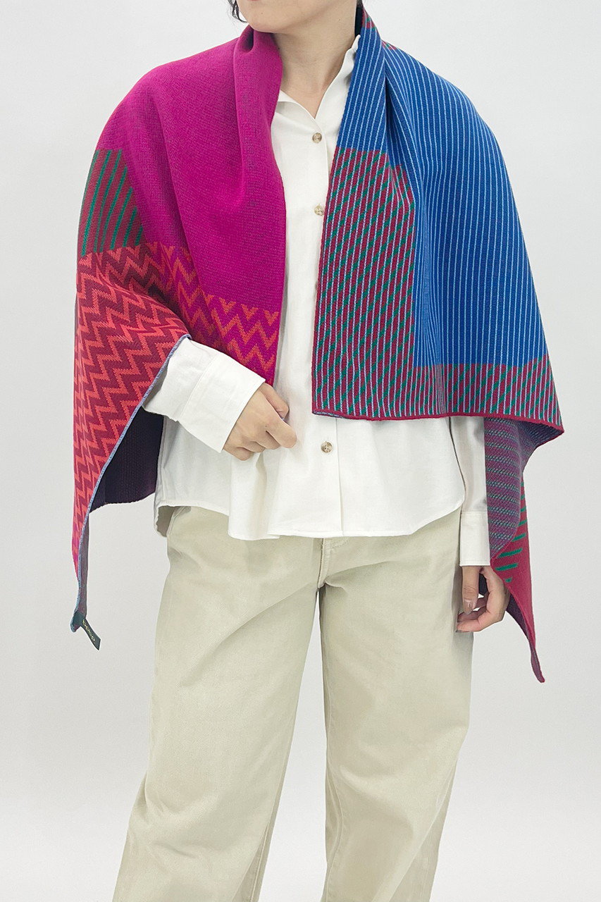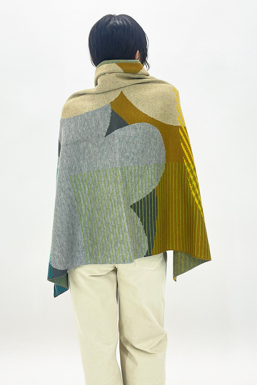 テキスタイルデザイナー鈴木マサル氏の色彩感が発揮されたニットブランケット。世界的ブランドも手掛けるデザイナーならではの鮮やかな色柄が楽しめます。滑らかで艶のある肌触り、ハイゲージで扱いやすい軽さが魅力。冷房対策から冬の肩掛けまでオールシーズン活躍する大判サイズで、インテリアのアクセントやギフトにも最適です。巻き方によって表情が変わるところも魅力のひとつ。