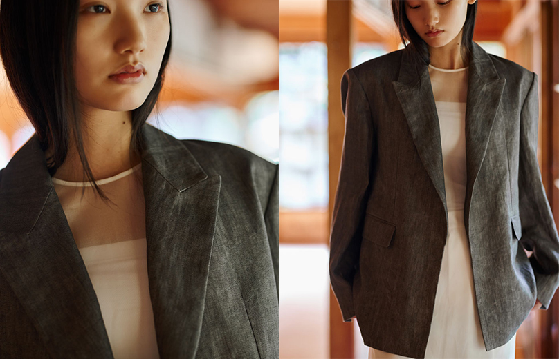 炭染め特有のムラ感と表面感など、通常の染めでは再現できない唯一無二感が特徴のテーラードジャケットとミニスカート。生地に余分な力をかけずに仕上げている為、ランダムなシワ感とドライタッチを感じられ、日本古来の染料である墨の味わいを楽しめる一枚に。