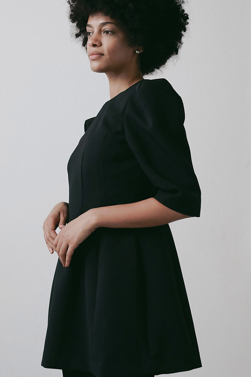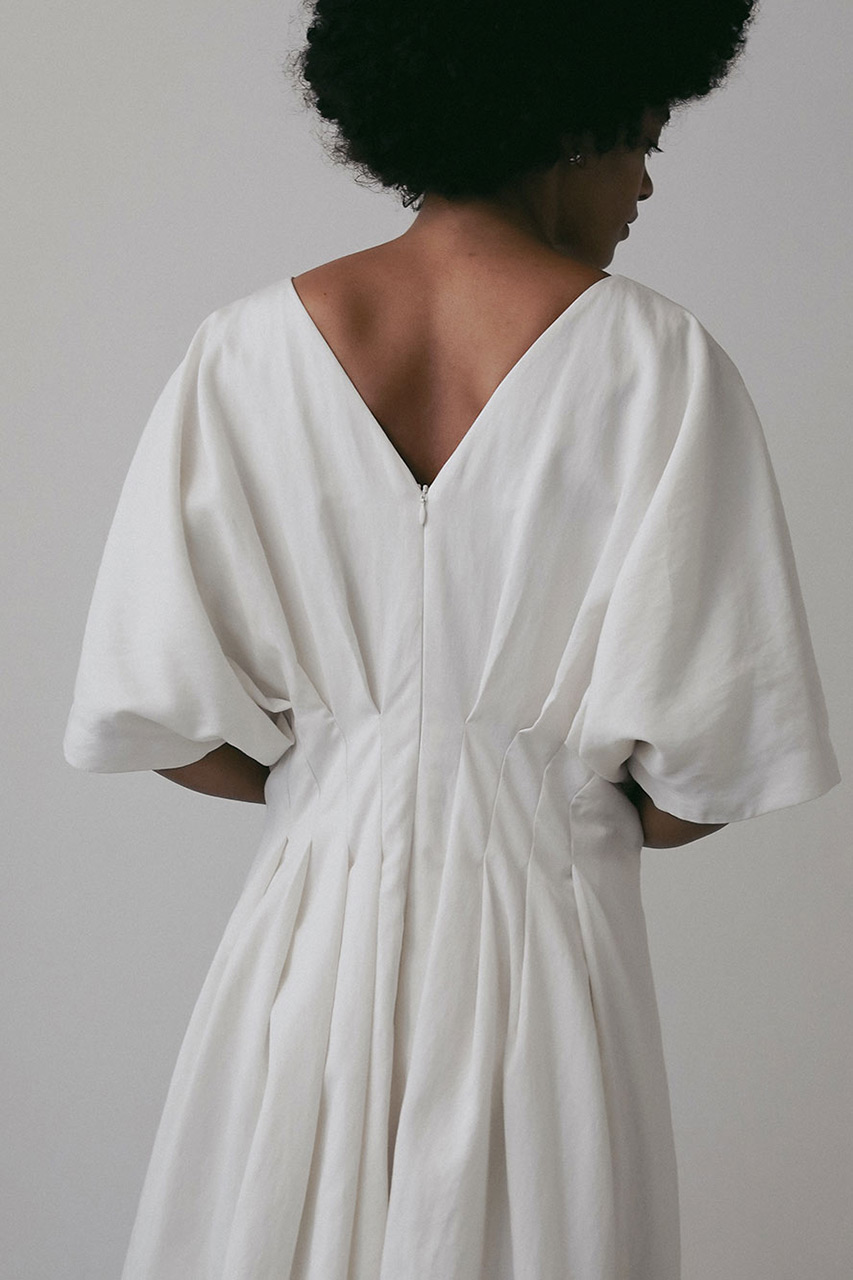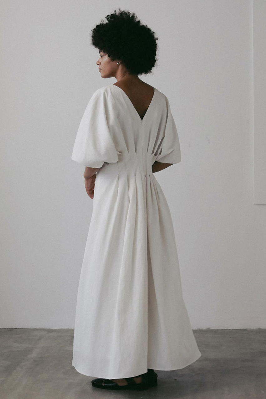 ウエストにタックを入れたフィット&フレアのシルエットが、自然と女性らしいラインを引き立てるワンピース。たっぷりと生地を使ったスカート部分は、歩くたびにふわりと揺れて華やかな印象に。胸元と背中がほどよく開いたデザインは、抜け感がありつつも上品で、ヘルシーな肌見せを叶えるデザイン。シンプルながら、存在感のある一着。