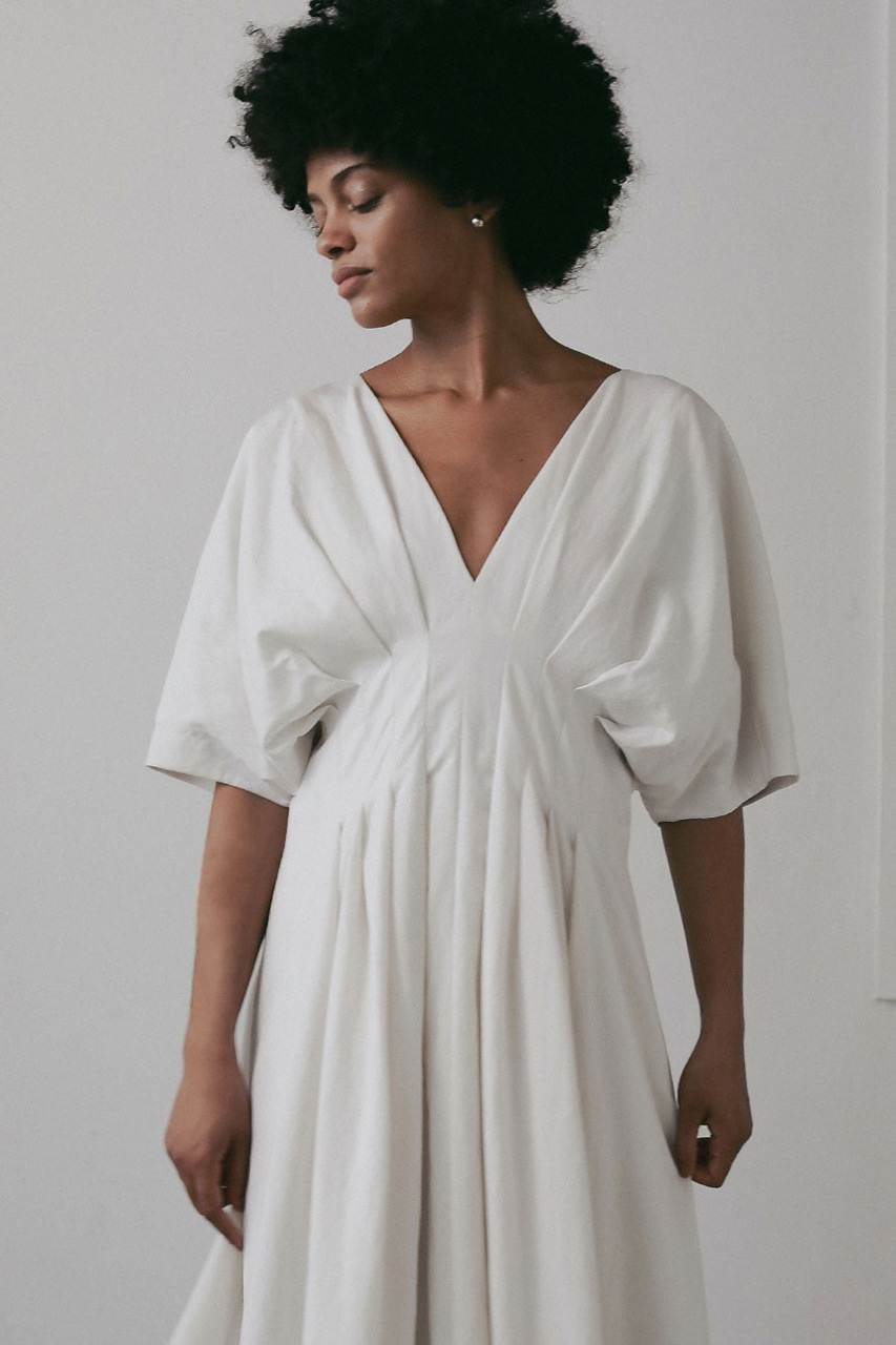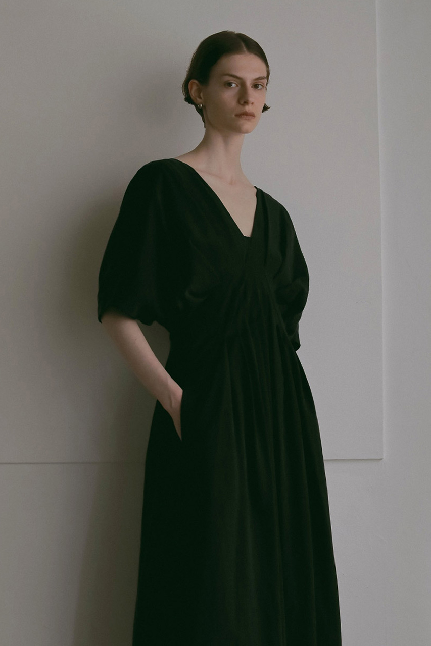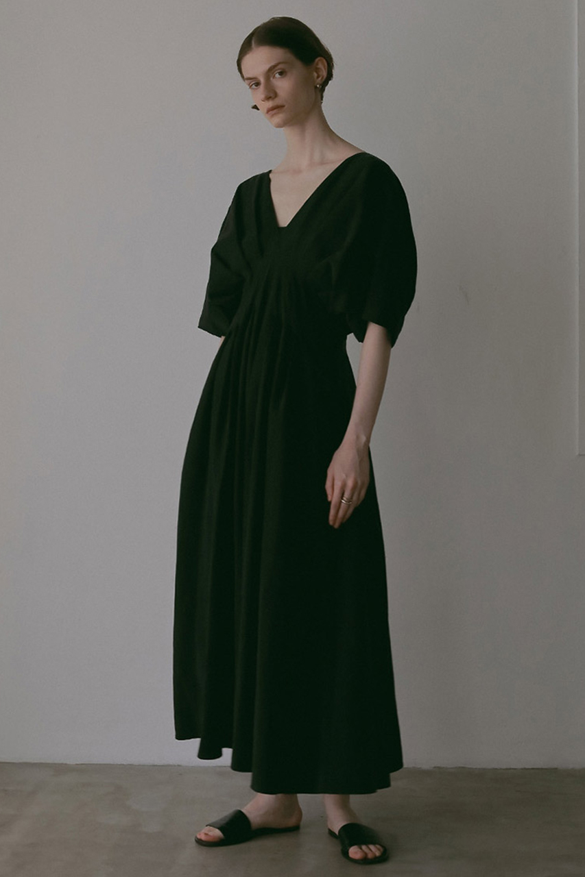 ウエストにタックを入れたフィット&フレアのシルエットが、自然と女性らしいラインを引き立てるワンピース。たっぷりと生地を使ったスカート部分は、歩くたびにふわりと揺れて華やかな印象に。胸元と背中がほどよく開いたデザインは、抜け感がありつつも上品で、ヘルシーな肌見せを叶えるデザイン。シンプルながら、存在感のある一着。