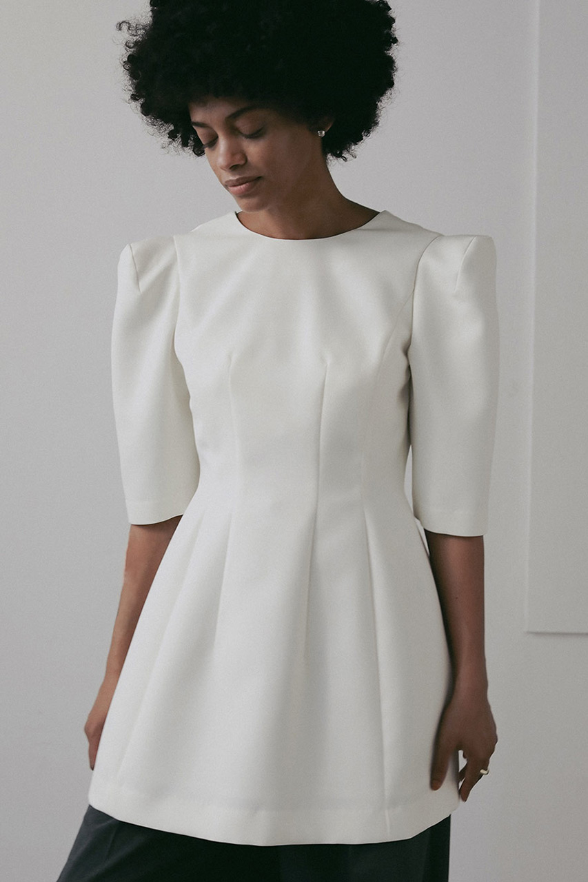 大胆に開いたバックスタイルが、さりげなく女性らしさを引き立てるブラウス。ウエストまわりを美しく見せるペプラムシルエットに、程よくボリュームのあるショルダーデザインを加え、立体感のある洗練された印象に。素材は、ドライな質感とハリ感のある上品な風合いで、シワになりにくく毛羽立ちも出にくいため、美しさが長く続くのも魅力。細身のパンツはもちろん、ワイドパンツと合わせて抜け感のあるスタイリングもおすすめ。