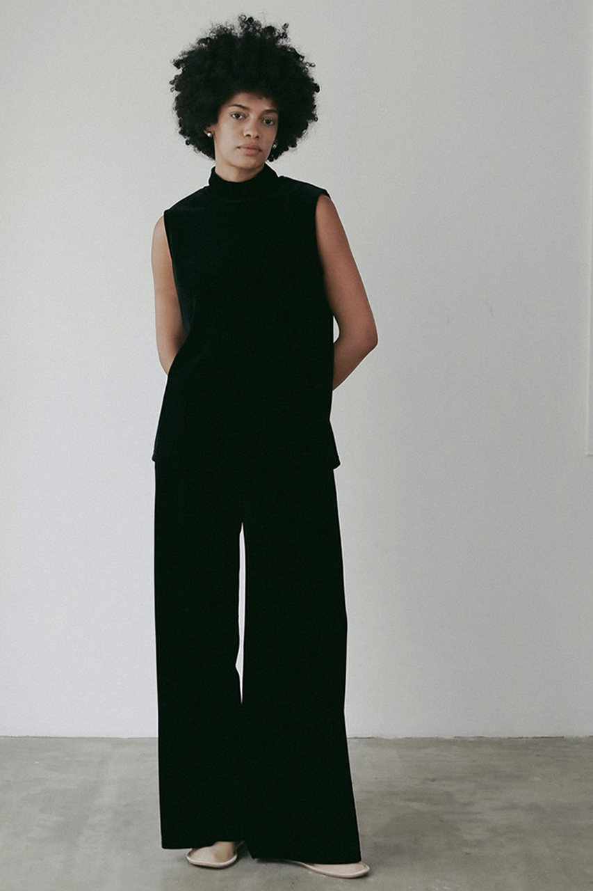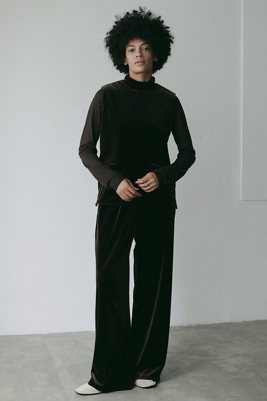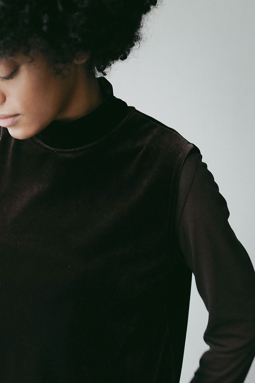 ハイネック×スリーブレスのすっきりとしたシルエットが、凛とした女性らしさを引き立てるプルオーバー。上品な光沢と美しい毛並みが魅力のベロア素材を使用し、ひと目で秋らしさを演出。ほどよい伸縮性と軽さがあり、暑さの残る時期からも快適に取り入れられるのも嬉しいポイント。無駄を削ぎ落としたシンプルなデザインだからこそ、素材の美しさとシルエットが際立つ、上質な一枚。