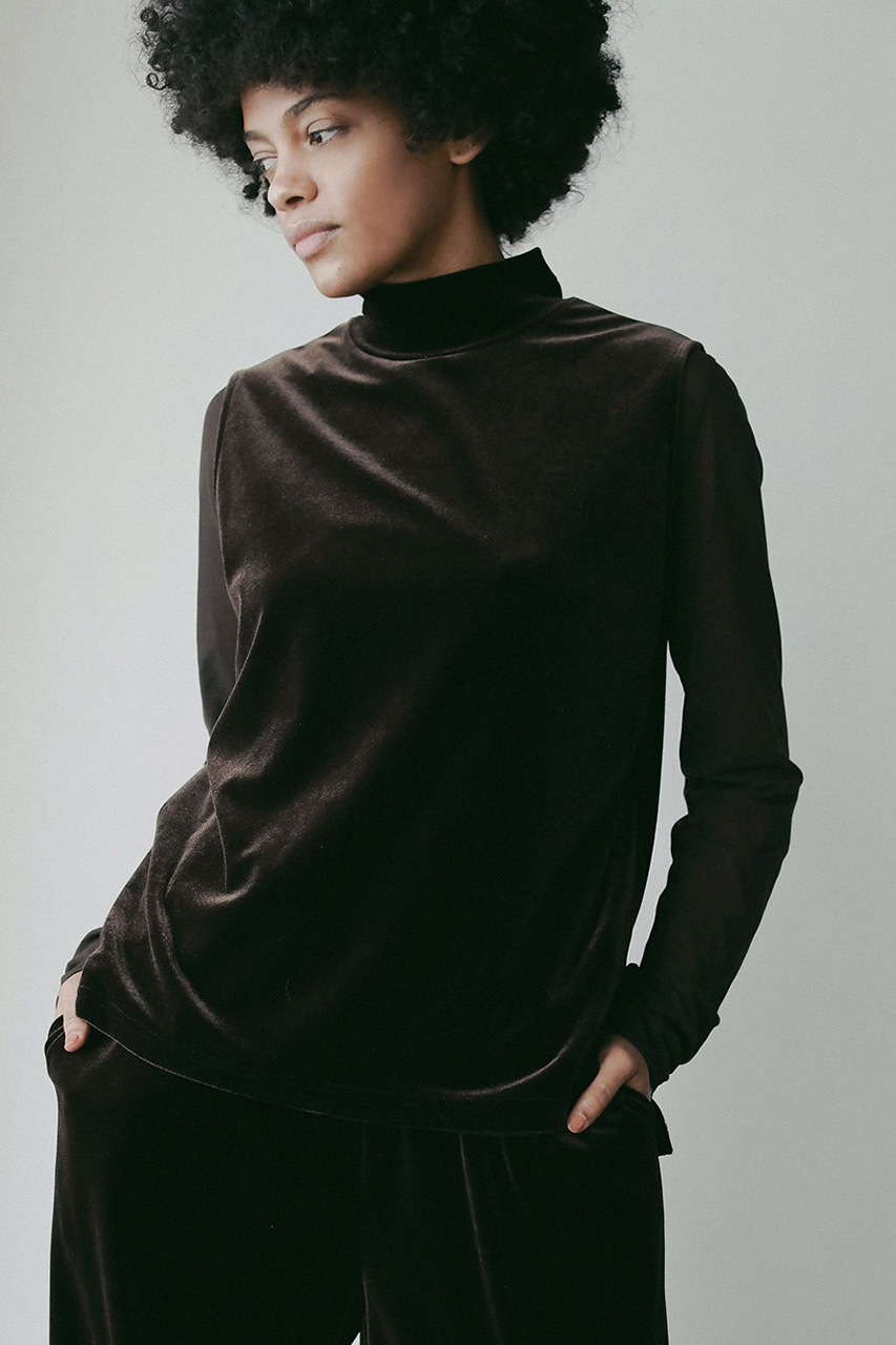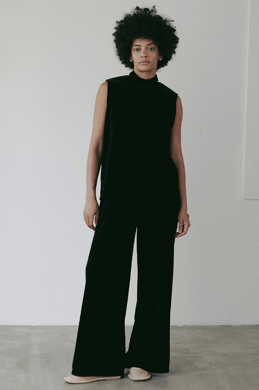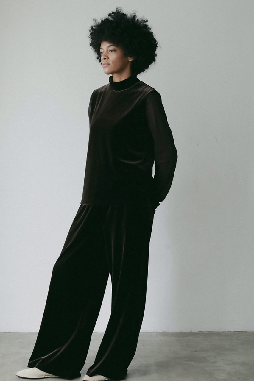 ハイネック×スリーブレスのすっきりとしたシルエットが、凛とした女性らしさを引き立てるプルオーバー。上品な光沢と美しい毛並みが魅力のベロア素材を使用し、ひと目で秋らしさを演出。ほどよい伸縮性と軽さがあり、暑さの残る時期からも快適に取り入れられるのも嬉しいポイント。無駄を削ぎ落としたシンプルなデザインだからこそ、素材の美しさとシルエットが際立つ、上質な一枚。