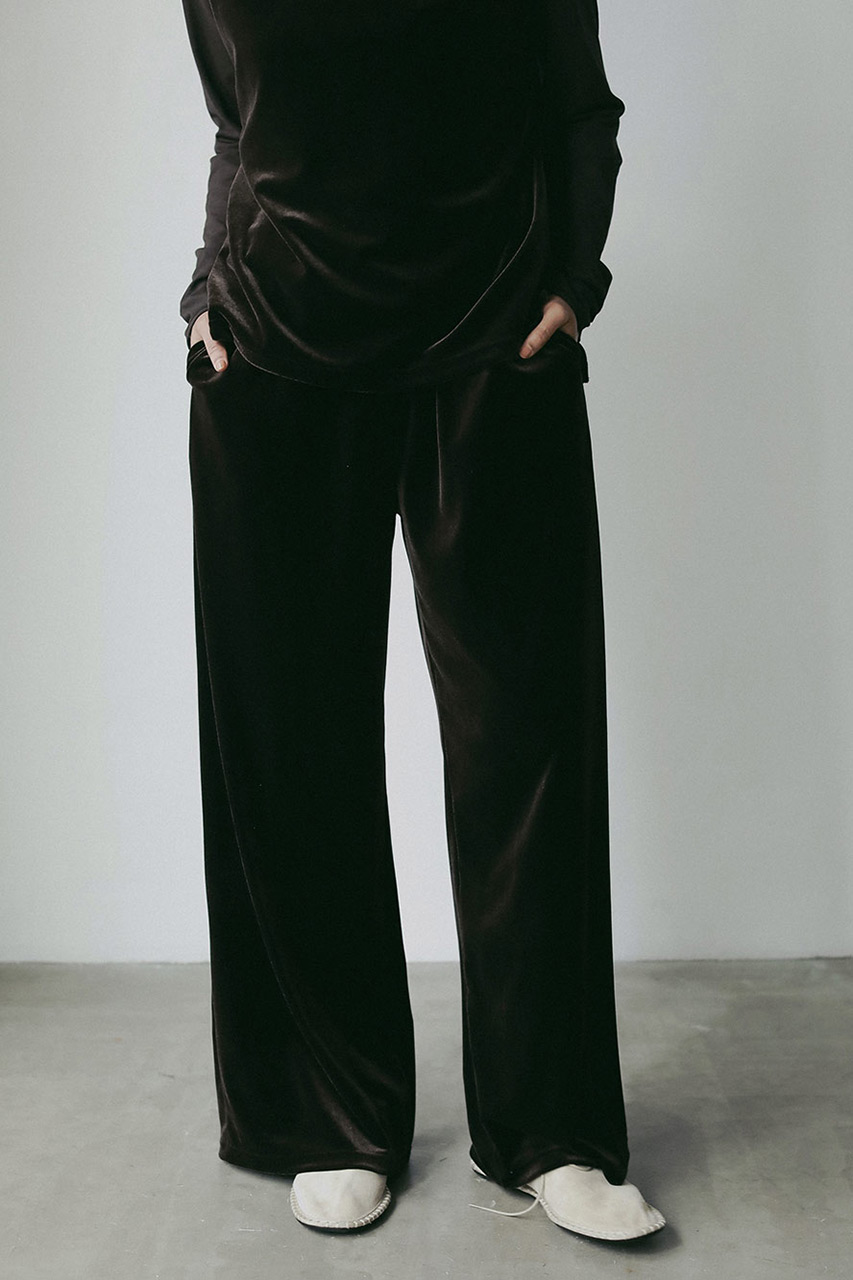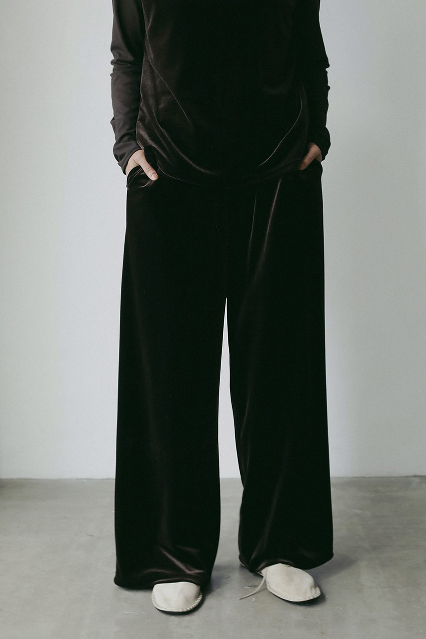 ほどよくゆとりのあるストレートシルエットで、どんなトップスとも合わせやすいベロアパンツ。晩夏はTシャツやタンクトップとラフに、秋冬はシャツやざっくりニットと合わせて、長く楽しめる一本。ほどよい光沢感と落ち着いたカラーが、季節のコーディネートにもすっとなじんで、ちょっとしたお出かけにもぴったり。着心地のよさと合わせやすさを両立した、頼れるアイテム。